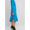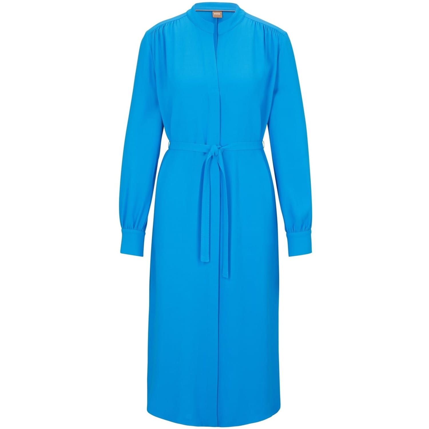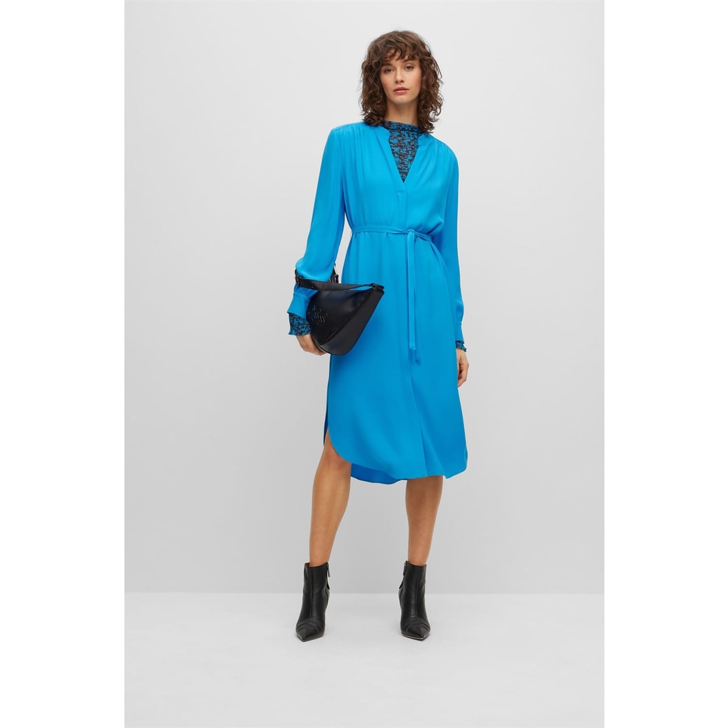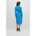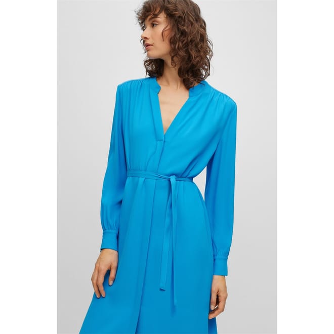 This Boss midi wrap dress features a sophisticated V-neck and a tie waist closure, offering a flattering regular fit. The solid pattern and curved hemline add a touch of elegance, making it a versatile choice for various occasions. -