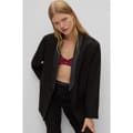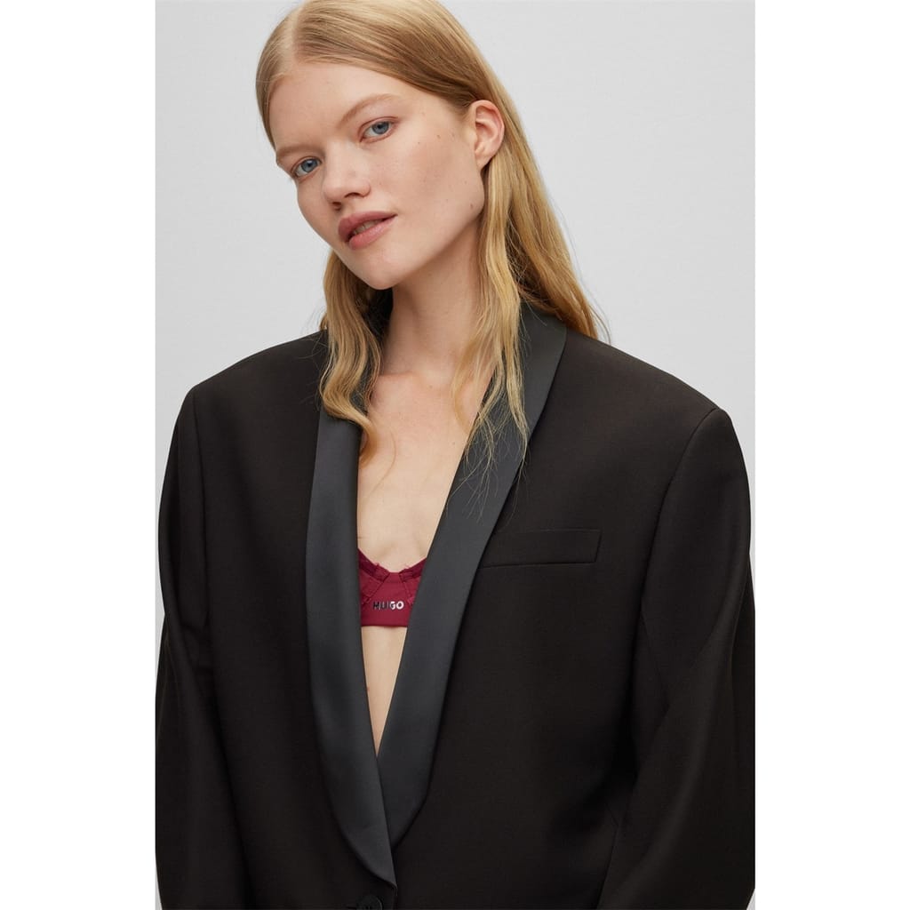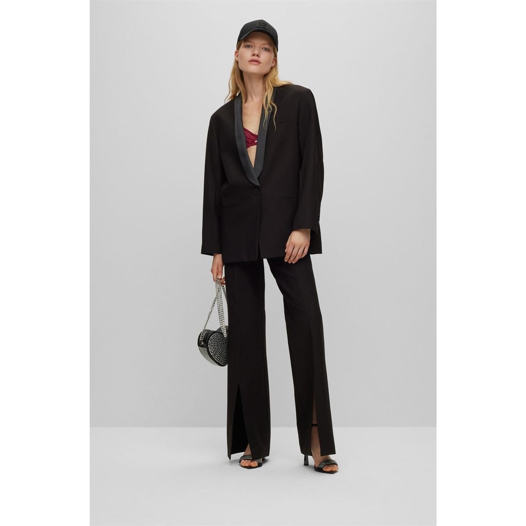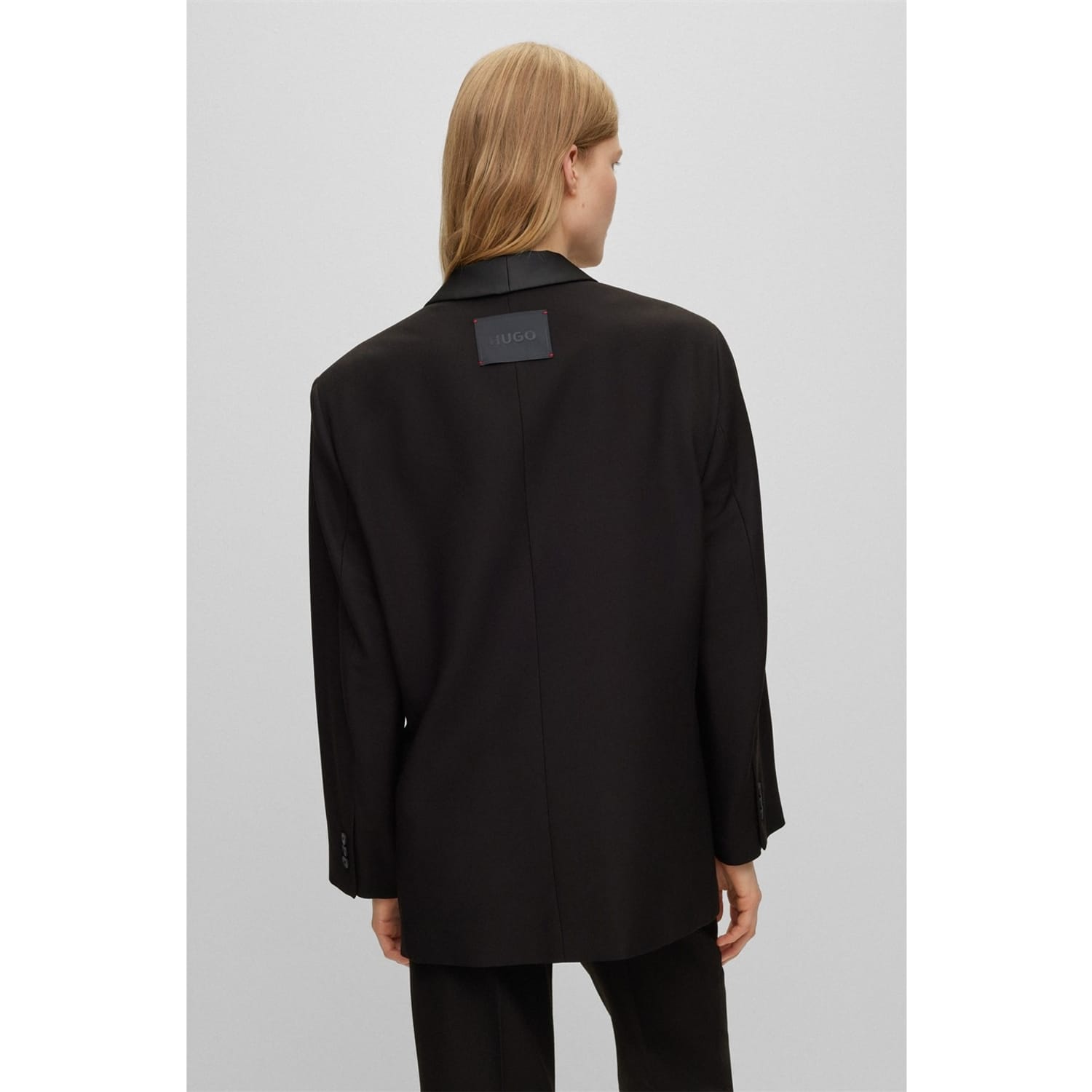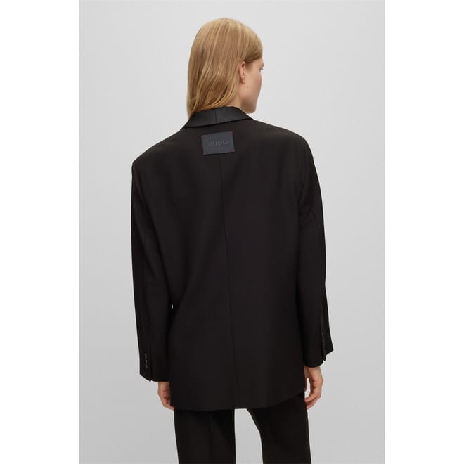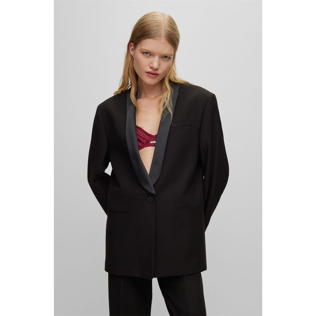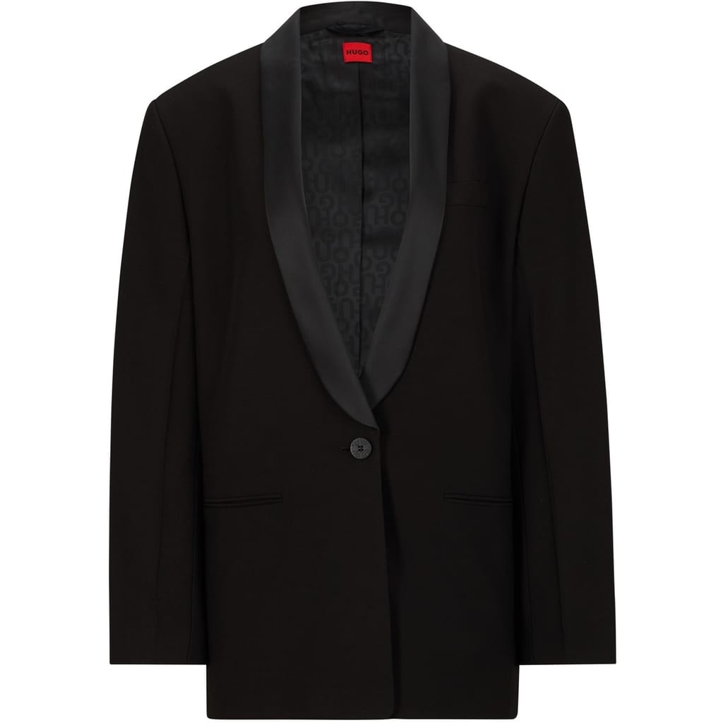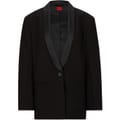 This Hugo suit jacket from the formal collection features a shawl neck and a relaxed fit. It is designed with a button closure and a straight hem. The solid pattern and pocket embellishments add to its classic appeal. -
