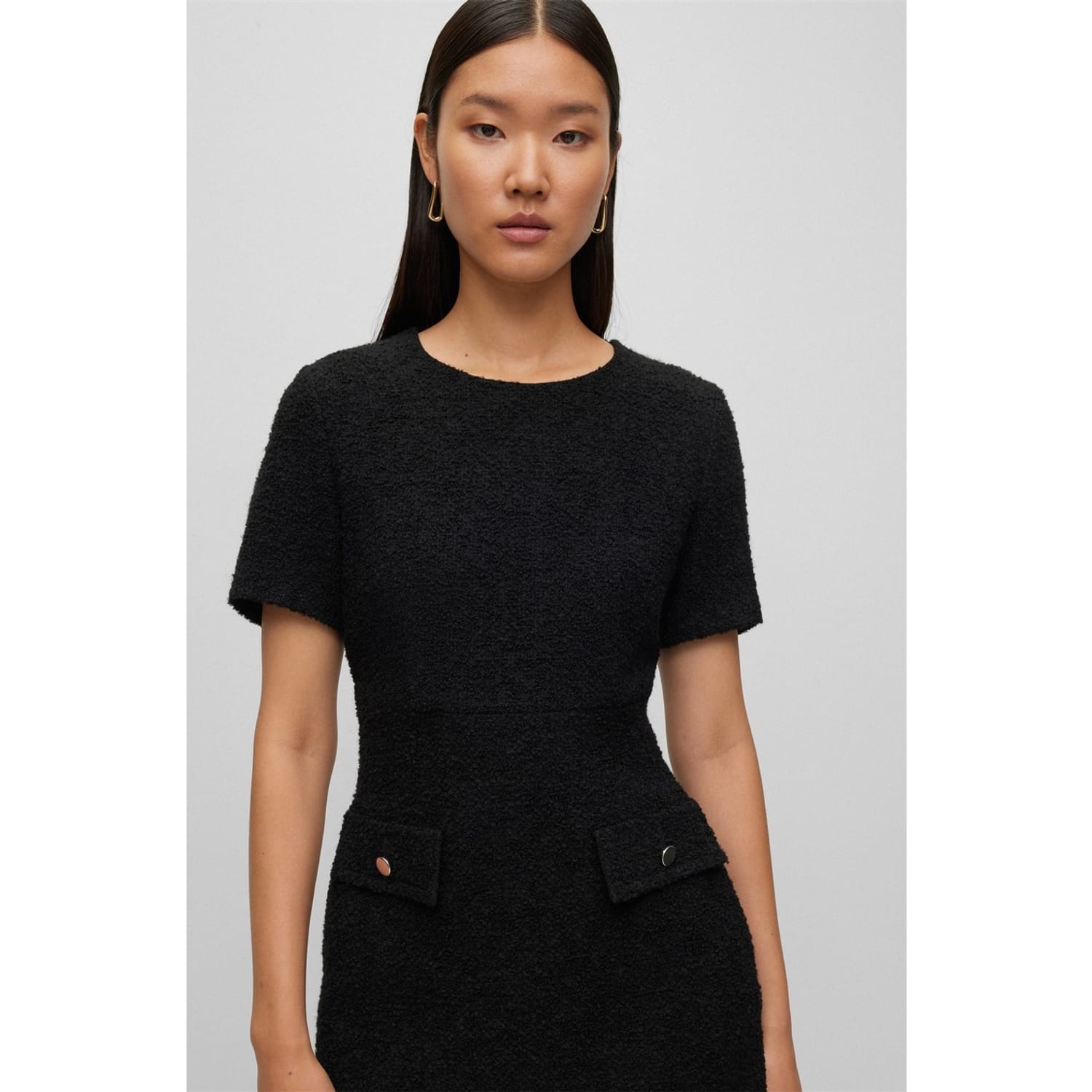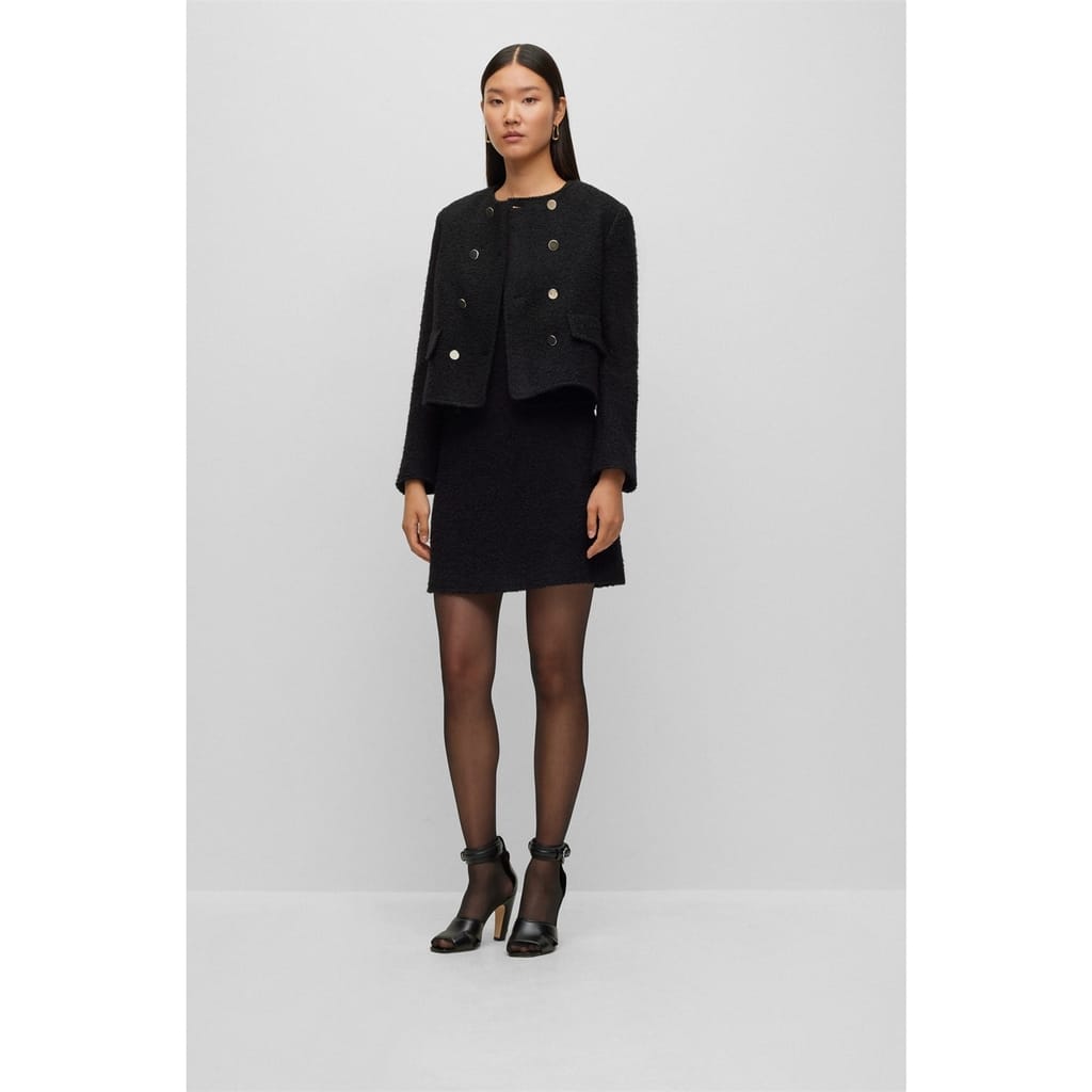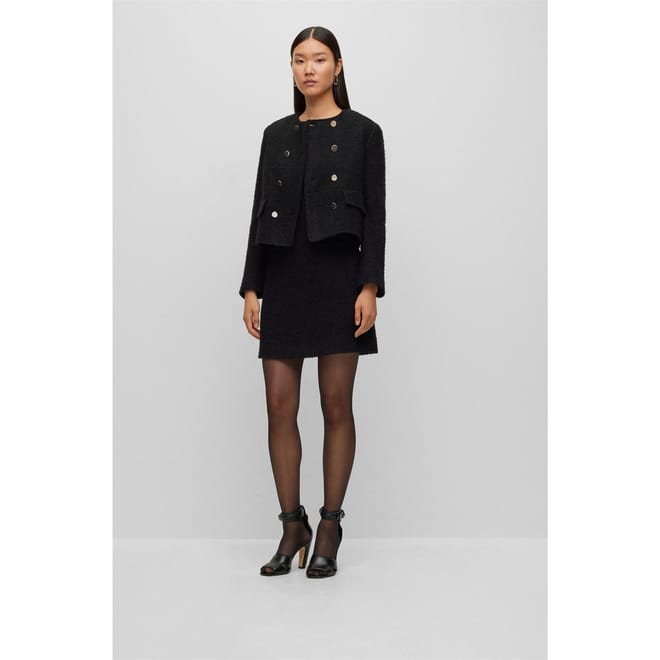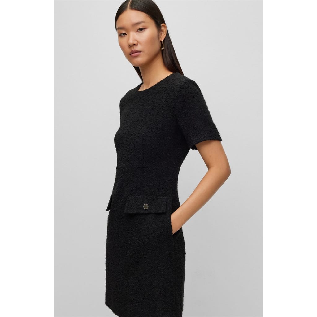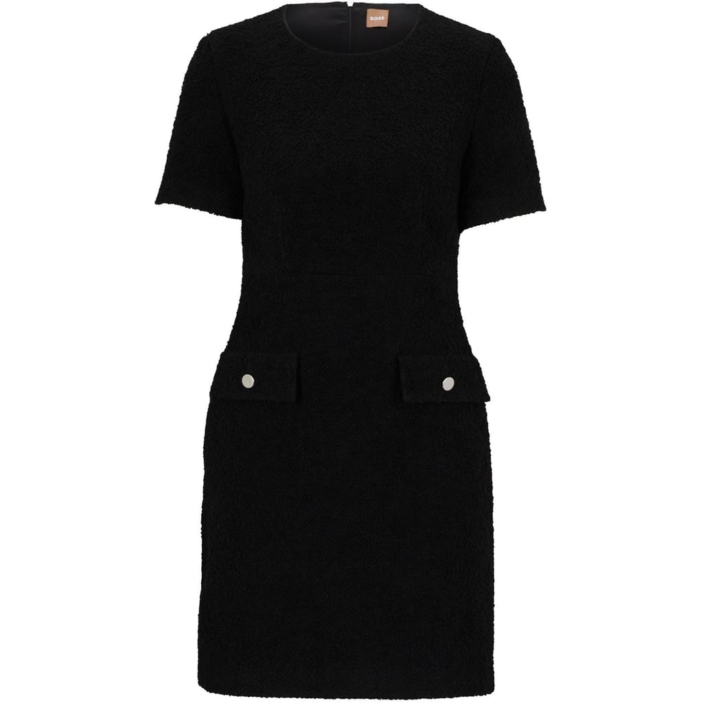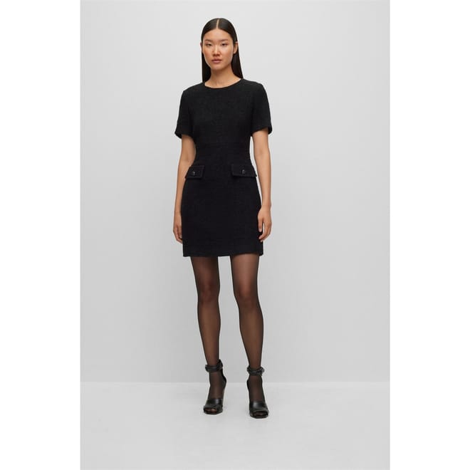 This Boss mini dress features a textured pattern and a classic crew neck. Designed in an A-line style, it offers a regular fit with short sleeves. The dress is completed with a straight hem and practical pocket embellishments, making it a versatile addition to any wardrobe. -