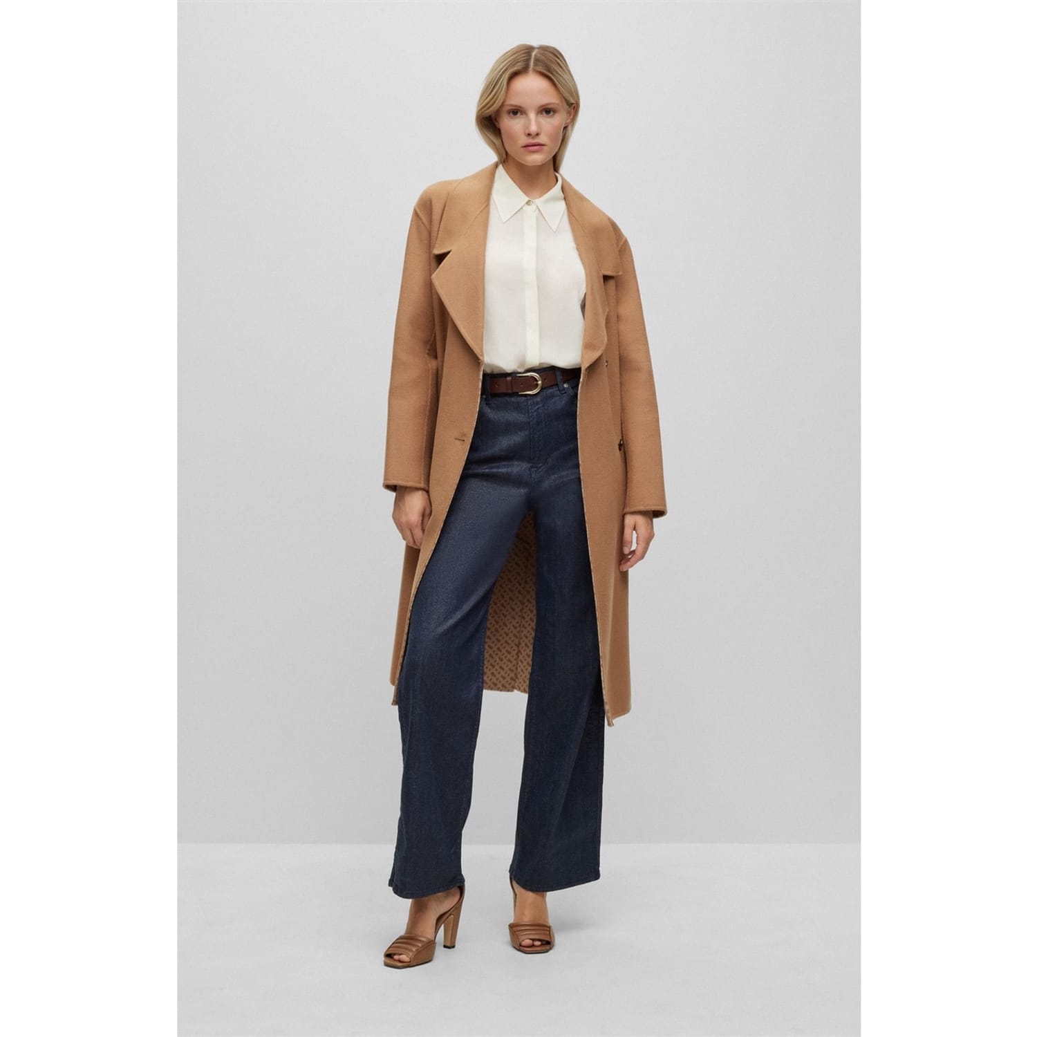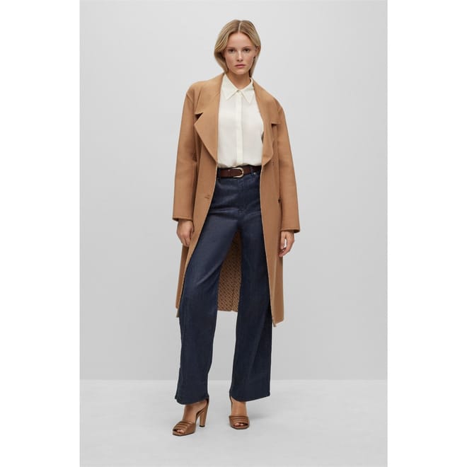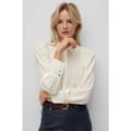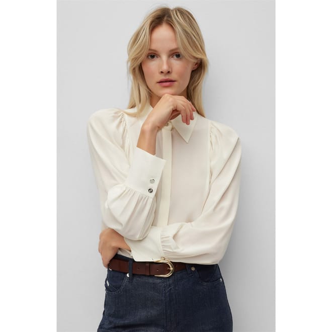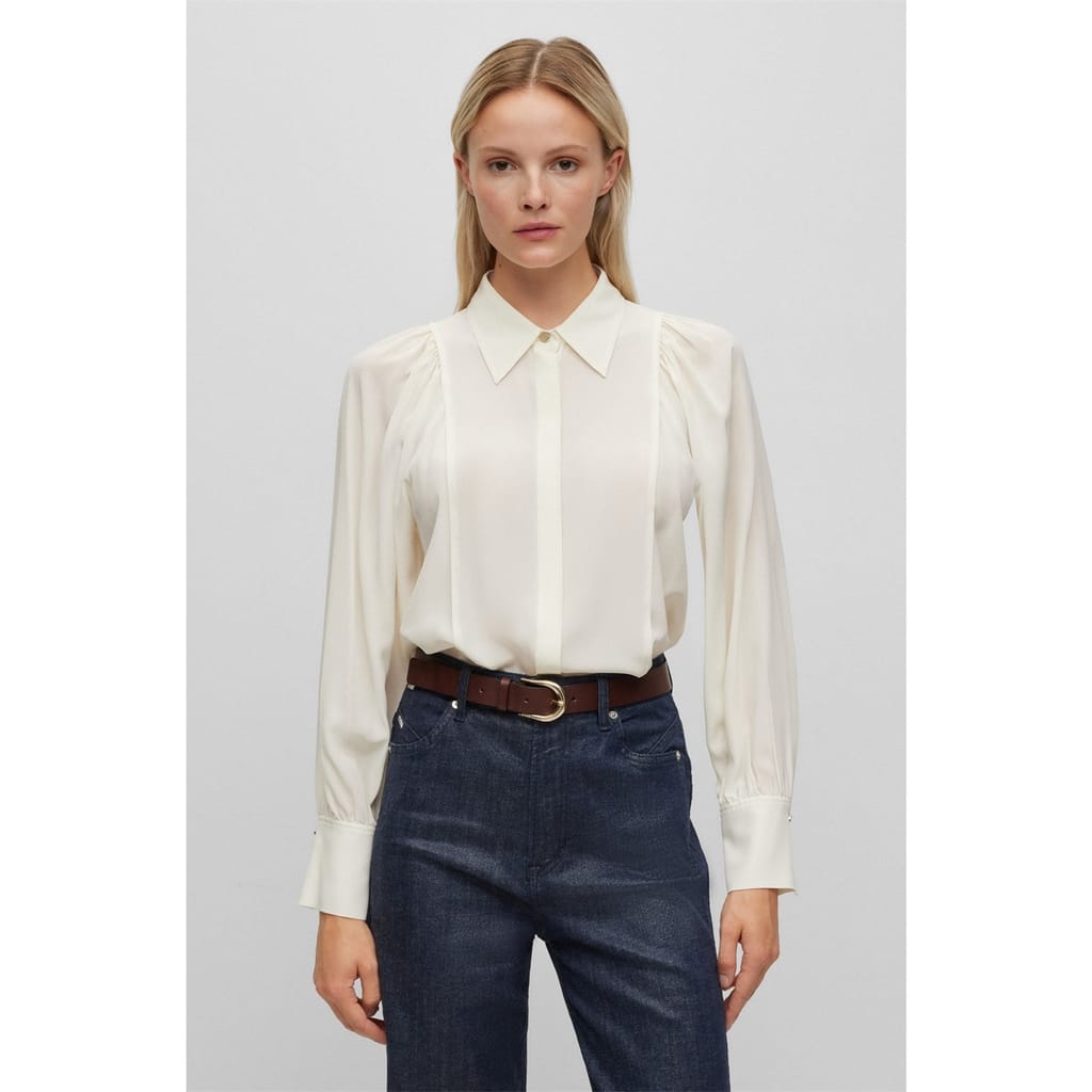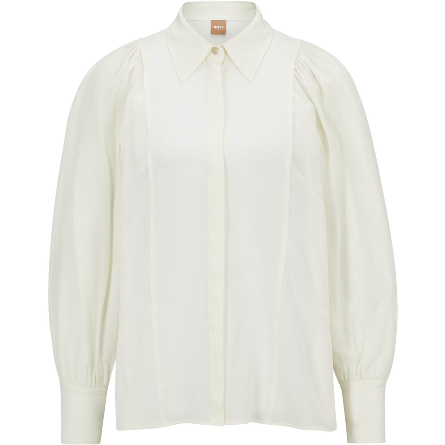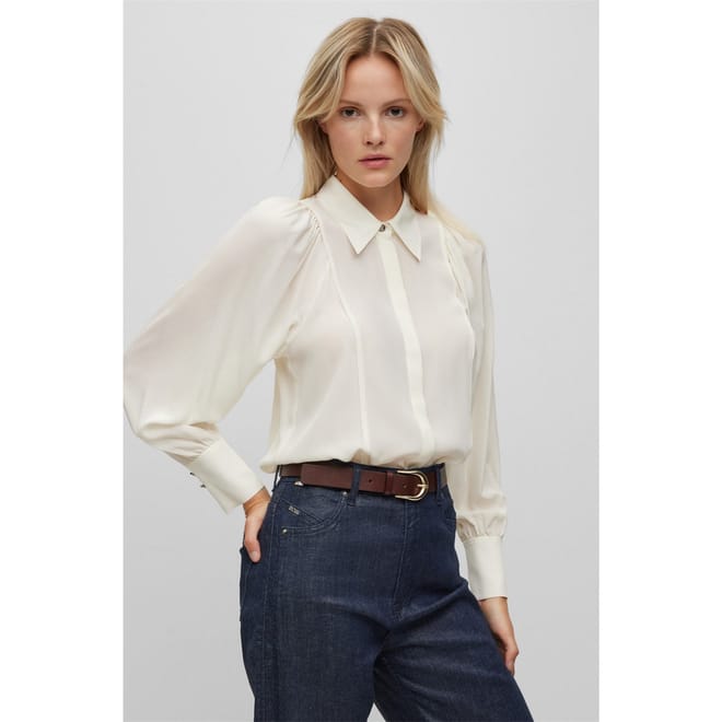 This Boss top features a relaxed fit with long puff sleeves and a solid pattern. It is designed with a classic shirt collar and a button closure, offering a sophisticated look. -