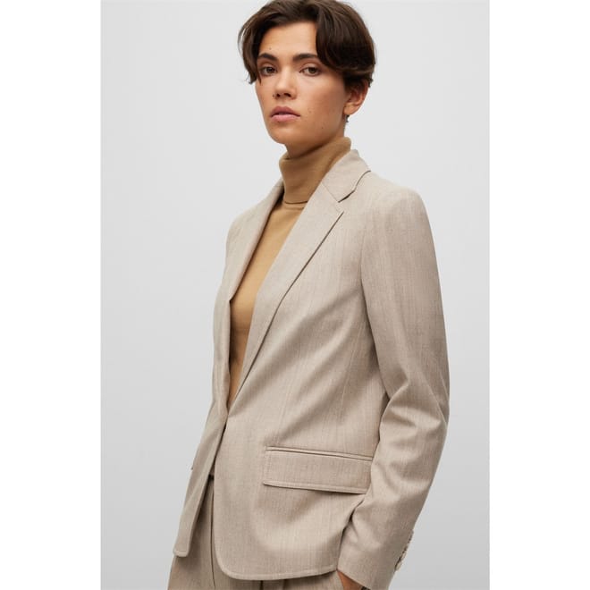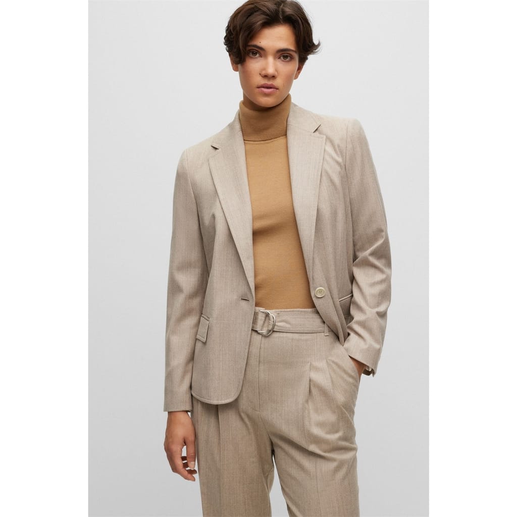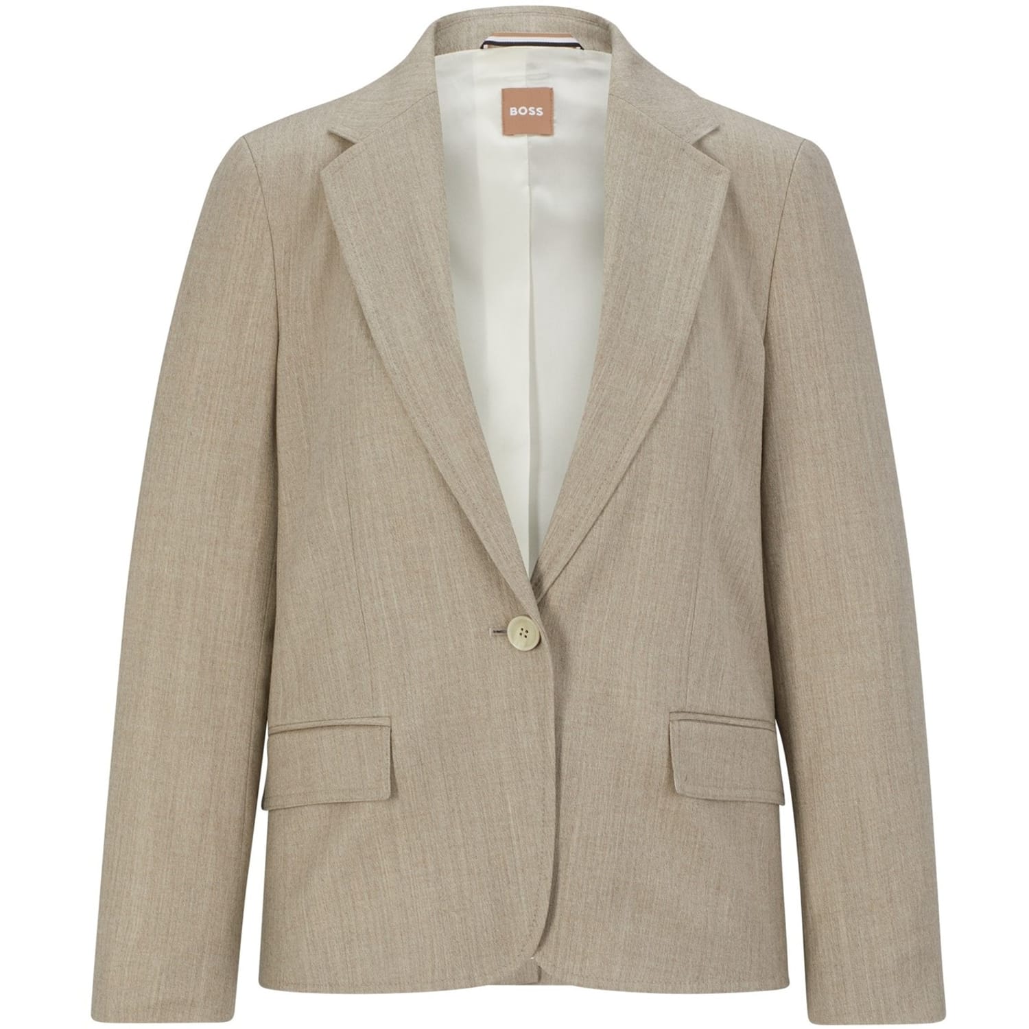 This Boss suit jacket features a notch collar and a straight hem, offering a regular fit. The solid pattern and short length provide a classic look, while the button closure ensures a secure fit. Embellished with pockets and a logo, this jacket combines functionality with subtle branding. -