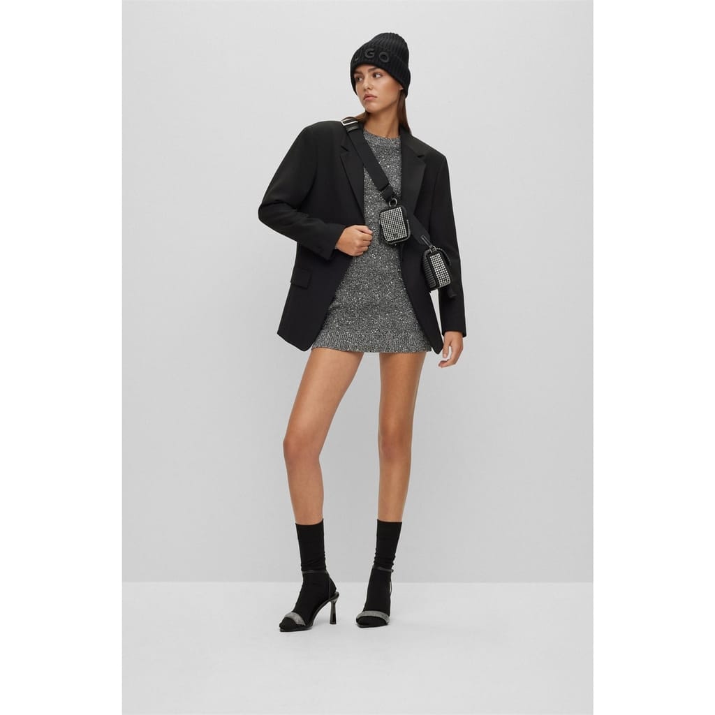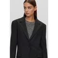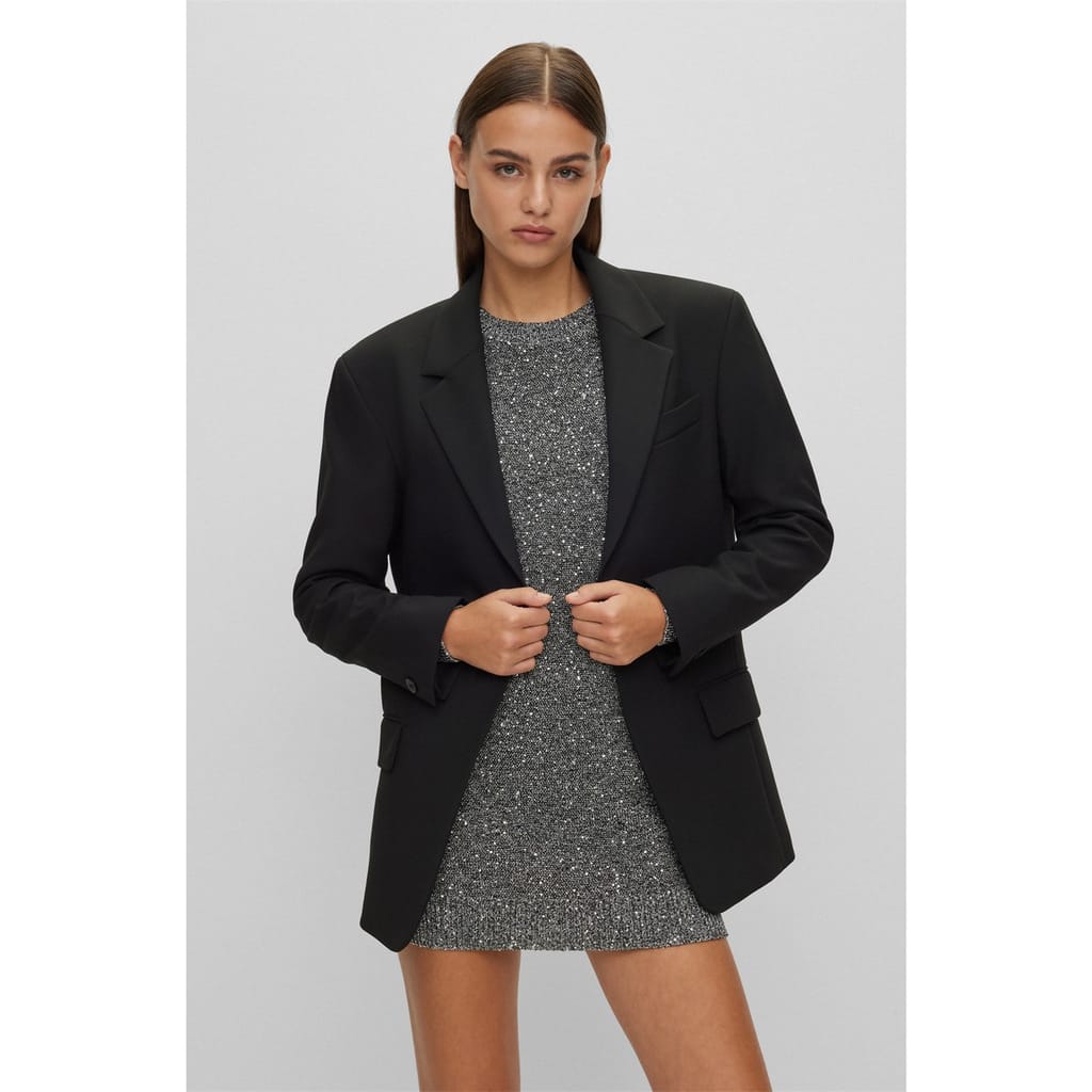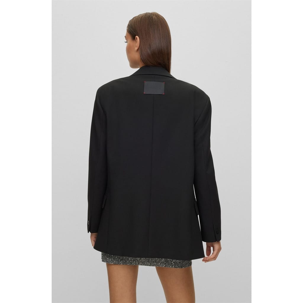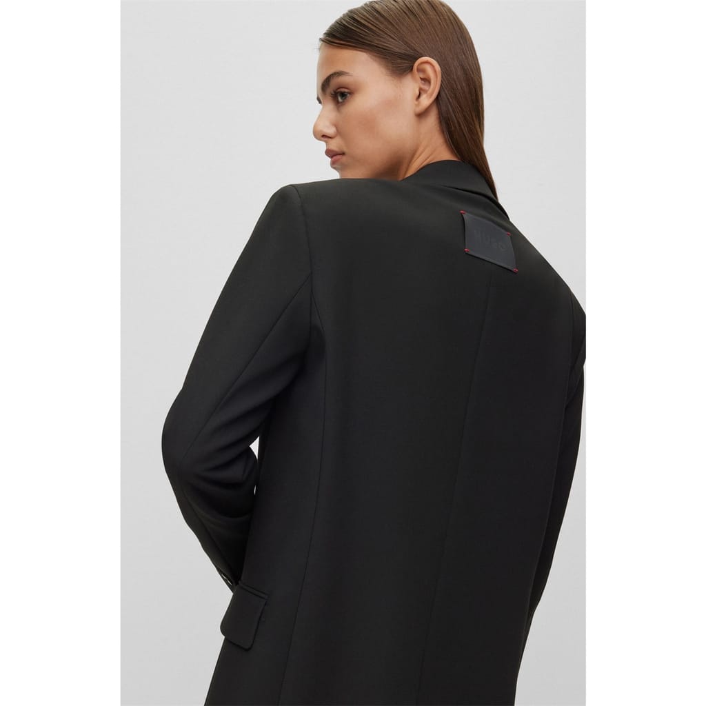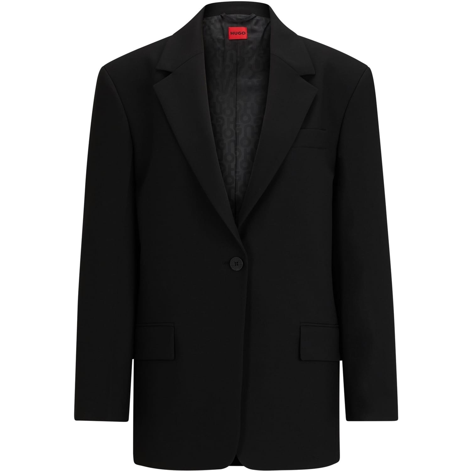 This Hugo suit jacket features a lapel collar and a straight hem, offering a relaxed fit. The solid pattern is complemented by a button closure and practical pockets. A subtle logo embellishment adds a touch of brand identity to this classic piece. -