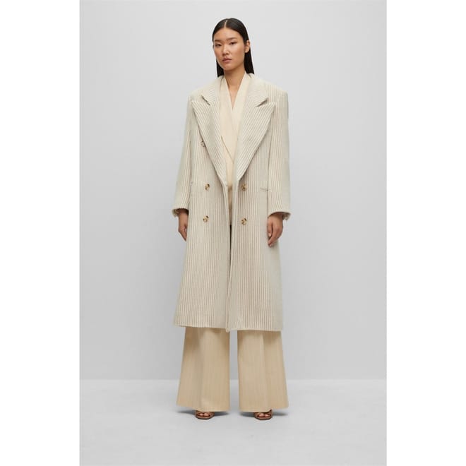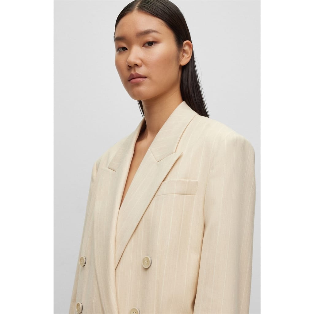 This Boss suit jacket features a relaxed fit with a lapel collar and a double-button closure. The stripe pattern adds a touch of sophistication, while the straight hem and cuff sleeves provide a classic look. Embellished with a logo and pockets, this jacket is a stylish addition to any wardrobe. -