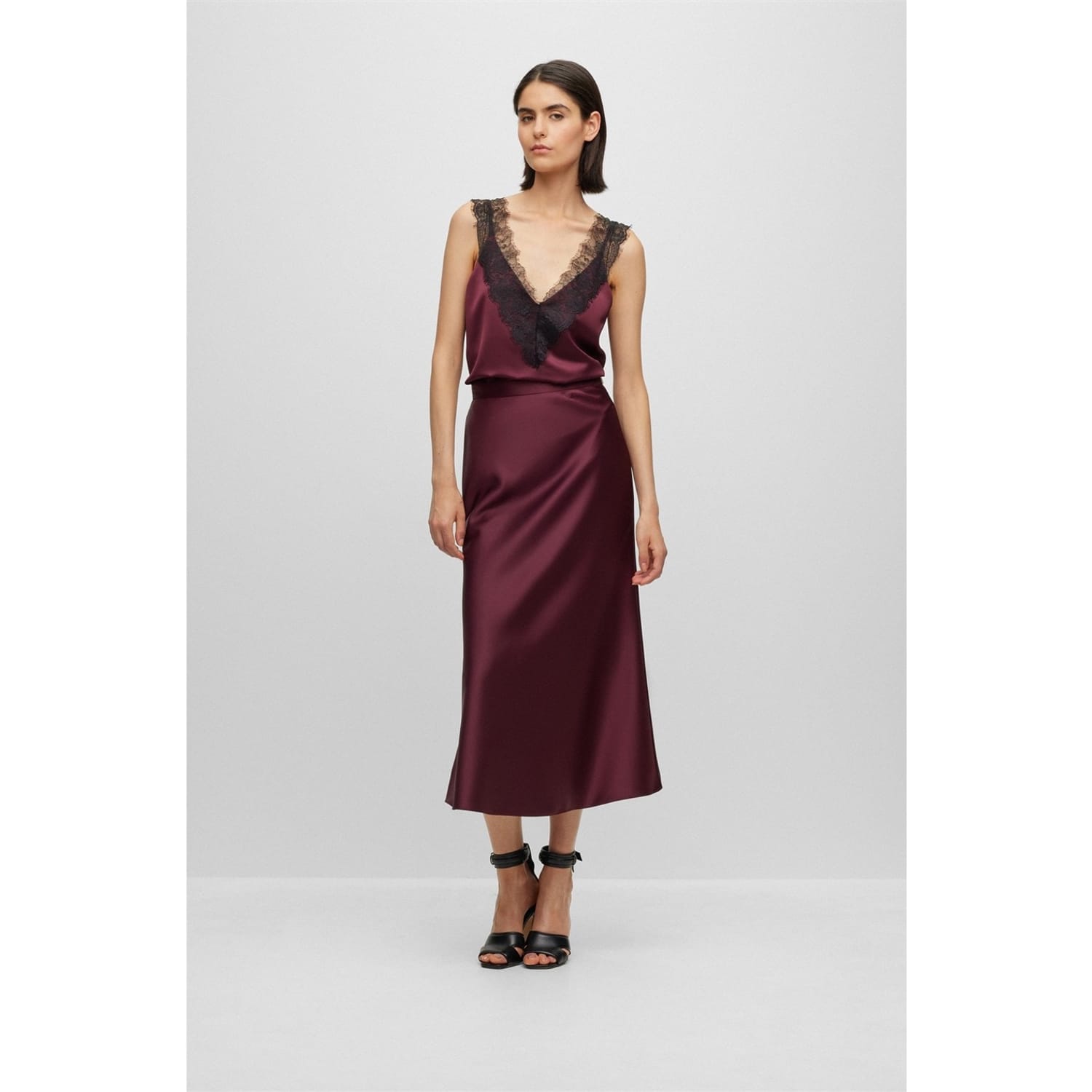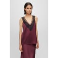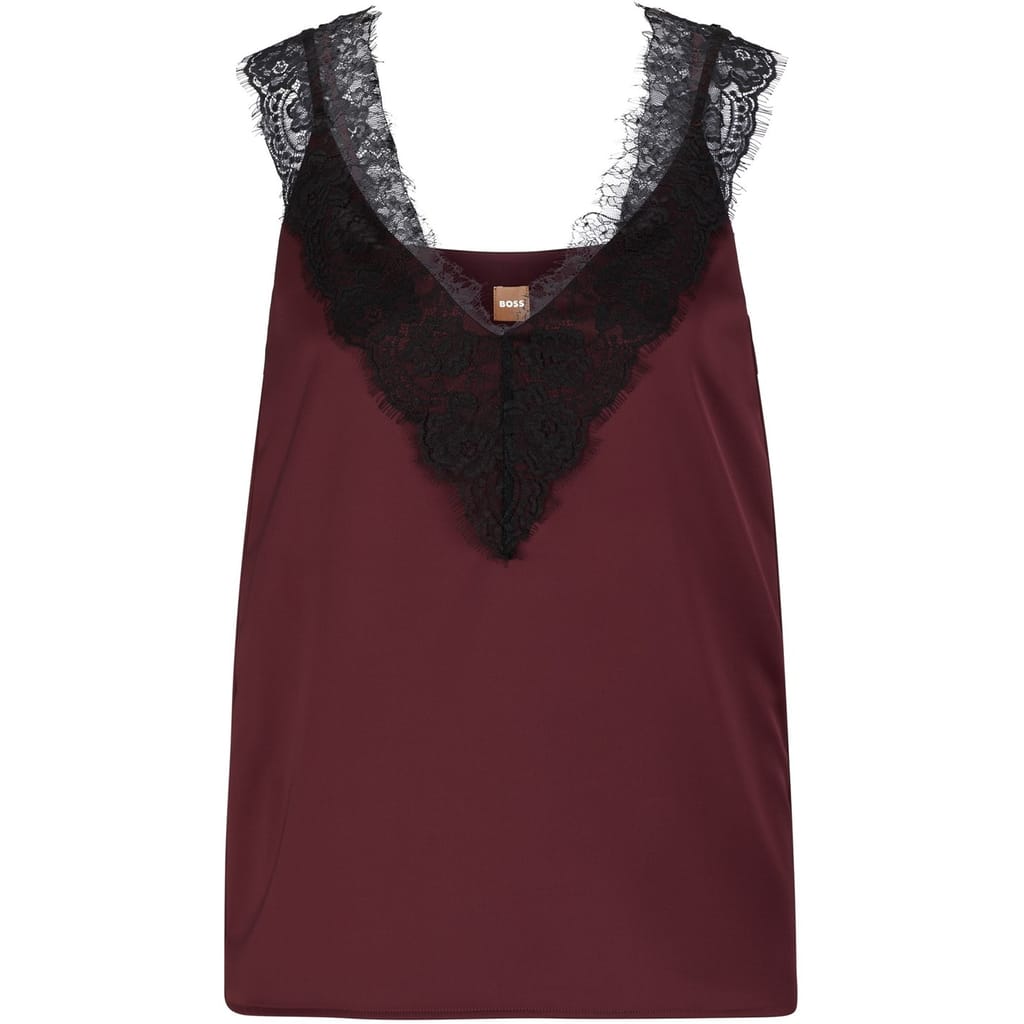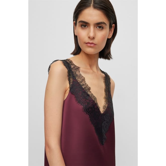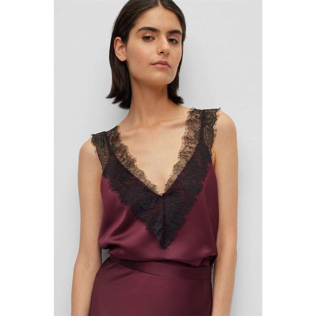- This exquisite top features a loose fit and a sleek straight hem, complemented by a sophisticated v-neck and a daring strappy design. The attention to detail is extraordinary, with tonal stitching that seamlessly blends into the fabric, creating a seamless and refined look. Adding a touch of allure, contrasting colour decorative Chantilly lace gracefully adorns the front and rear of the top, elevating it to new heights of sophistication. The lace adds a delicate and intricate element, that adds glamour and delicate design to this piece.