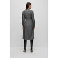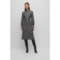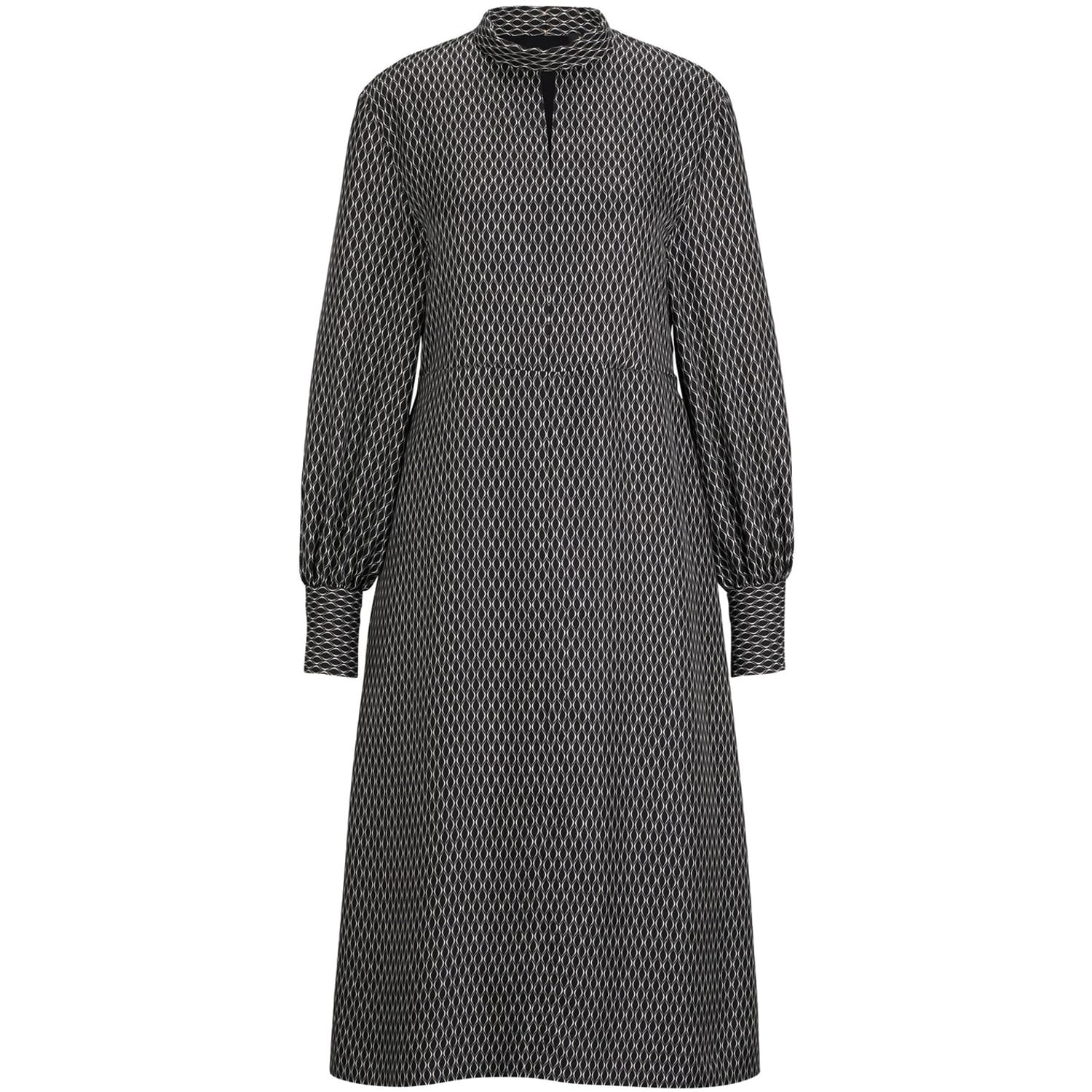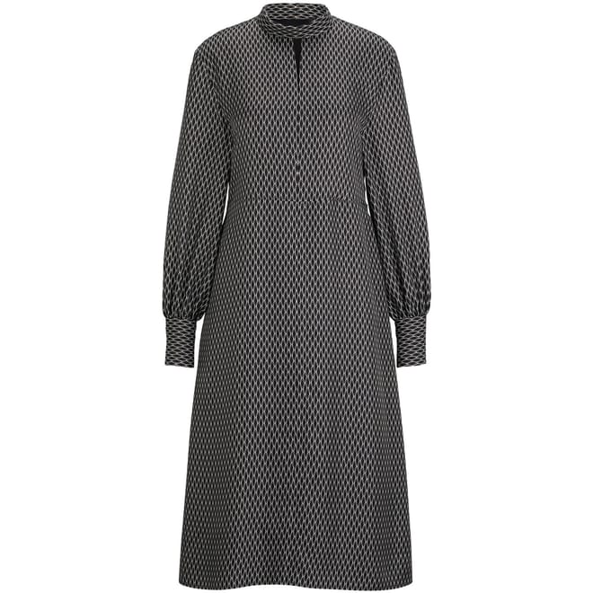 This Boss midi dress features a sophisticated wrap style with a high neck and long bishop sleeves. The geometric pattern adds a modern touch, making it a versatile choice for various occasions. -
