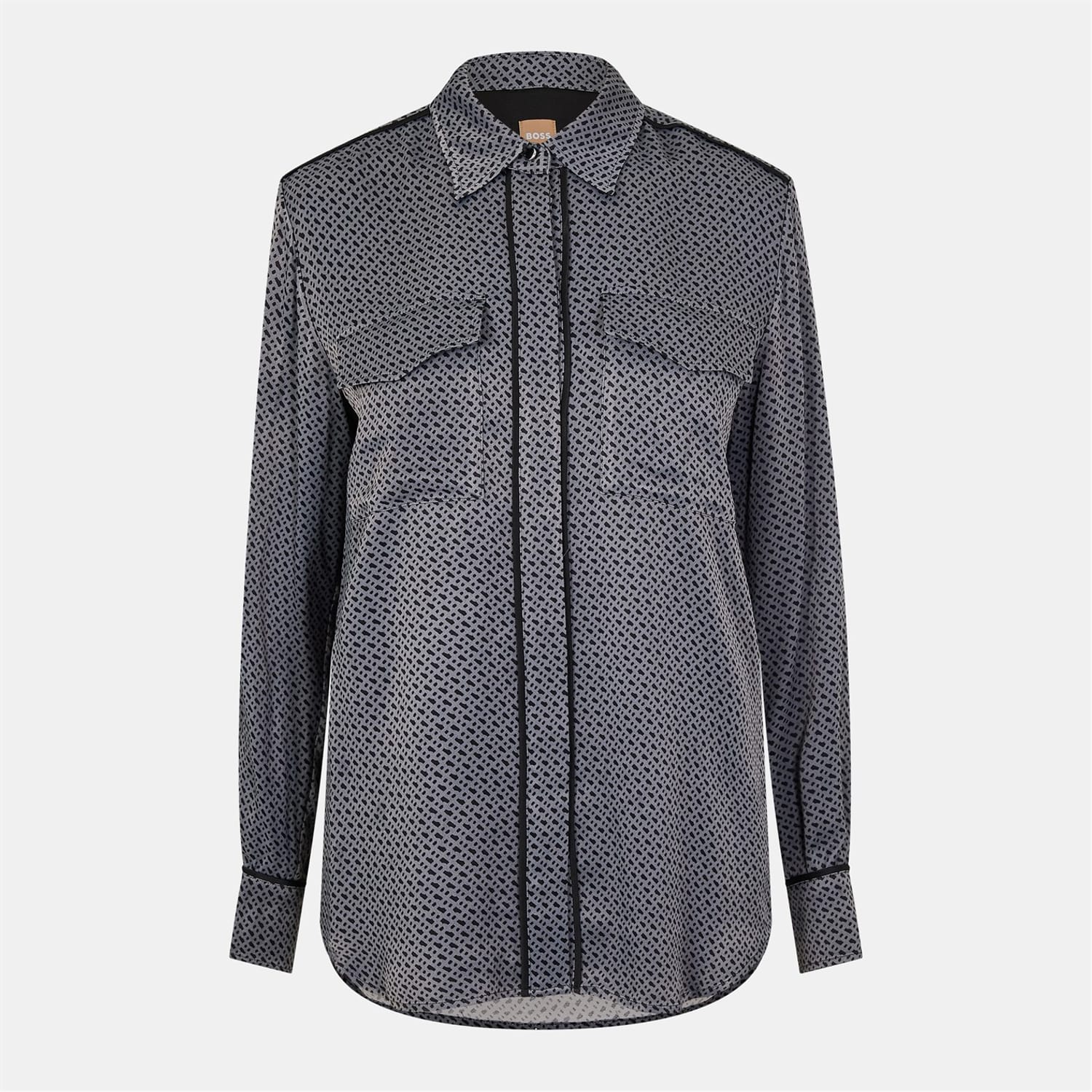 This Boss top features a regular fit with long sleeves and a shirt collar. The geometric pattern adds a stylish touch, while the button closure ensures a classic look. It includes a practical chest pocket for added functionality. The cuff sleeves complete the design, making it a versatile addition to your wardrobe. -