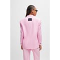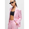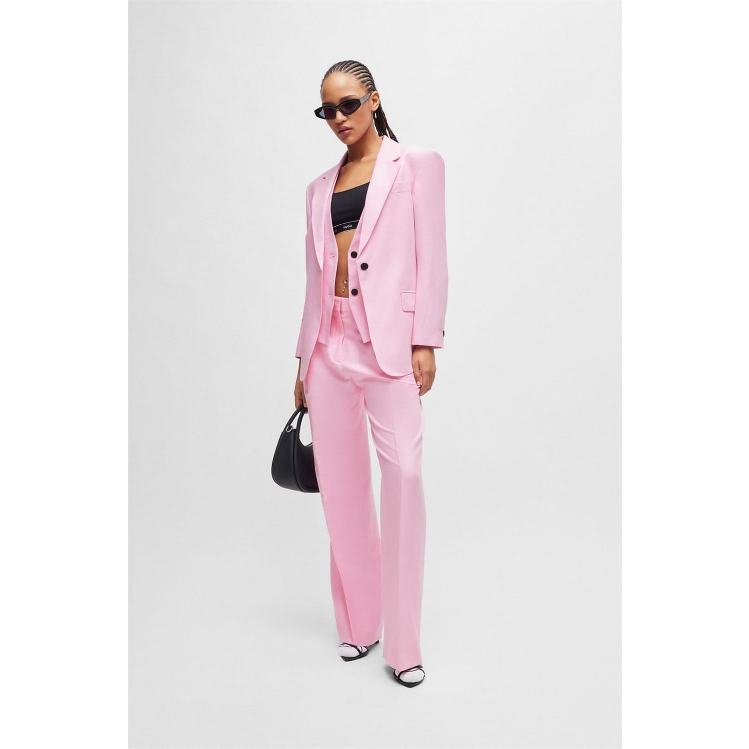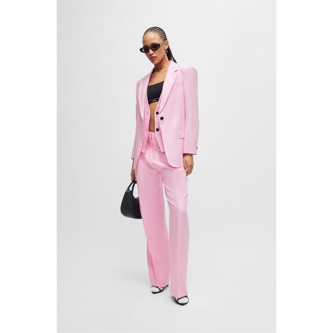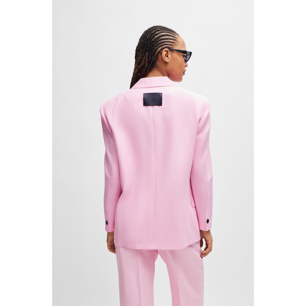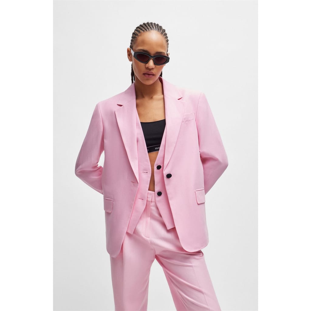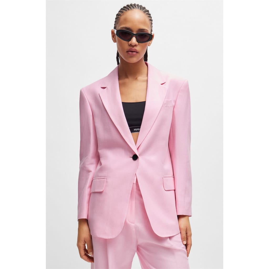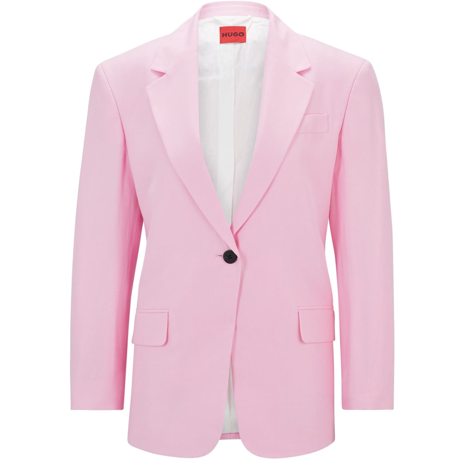 This Hugo suit jacket features a relaxed fit with a lapel collar and a straight hem. The solid pattern and button closure offer a classic look, while the pocket embellishments add functionality. Crafted for a sophisticated style, this jacket is a versatile addition to any wardrobe. -