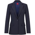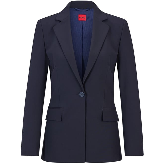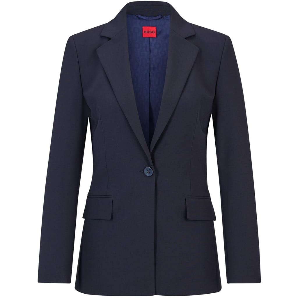 This Hugo suit jacket features a notch collar and a straight hem, offering a regular fit. The solid pattern is complemented by a button closure and a subtle logo embellishment, creating a refined look. -