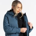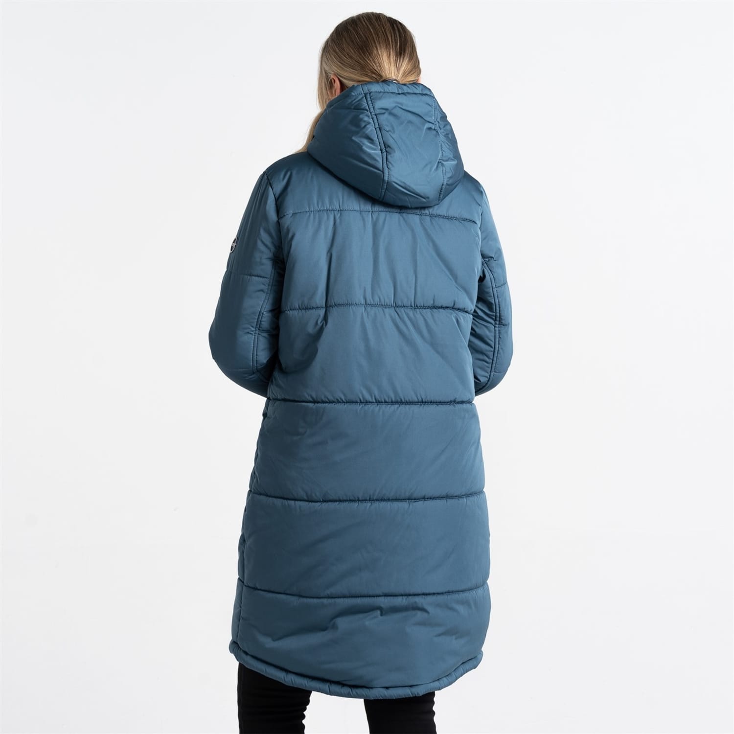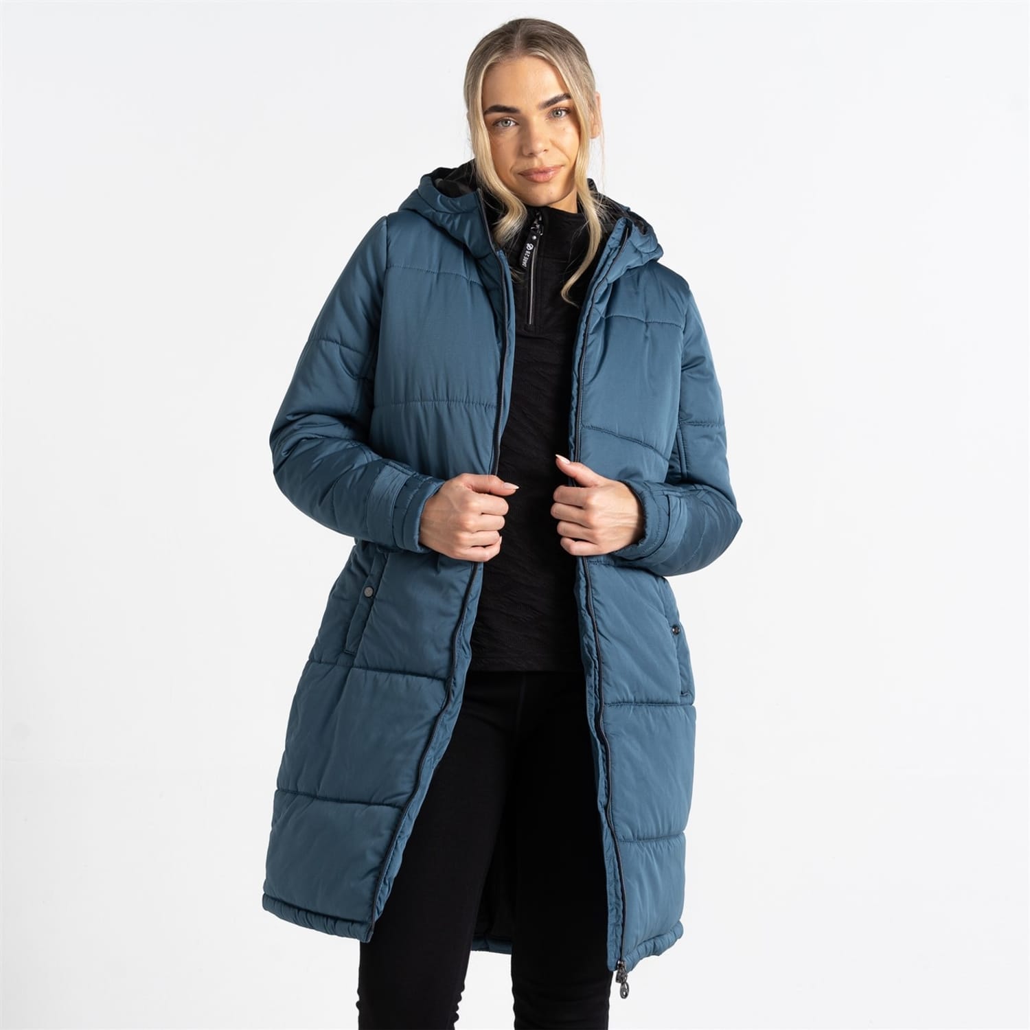 The Dare 2b quilted puffer jacket features a hooded design and a relaxed fit, perfect for comfort and style. It comes with a zipper and snap closure, ensuring a secure fit. The solid pattern and straight hem add to its sleek look. Embellished with practical pockets and a logo, this jacket is a versatile addition to your wardrobe. -