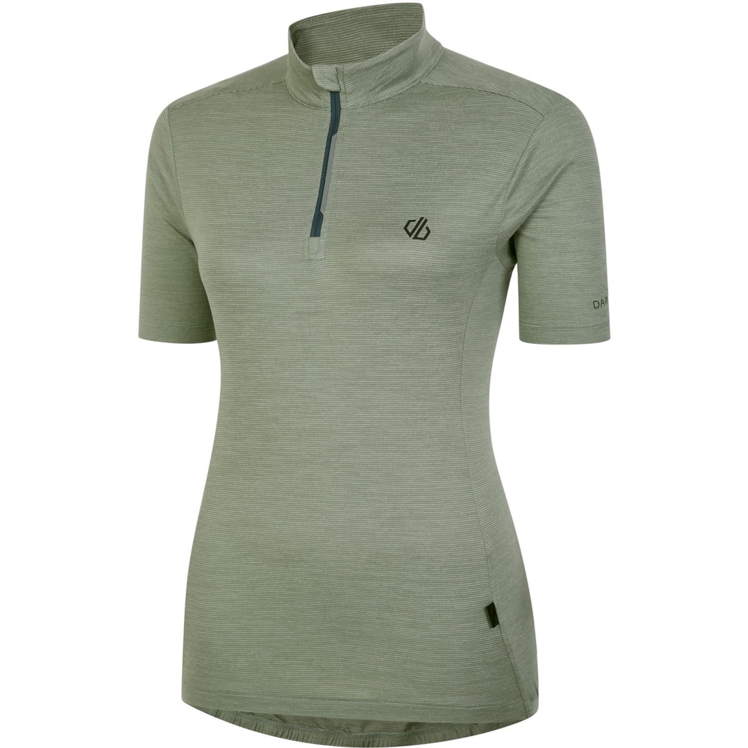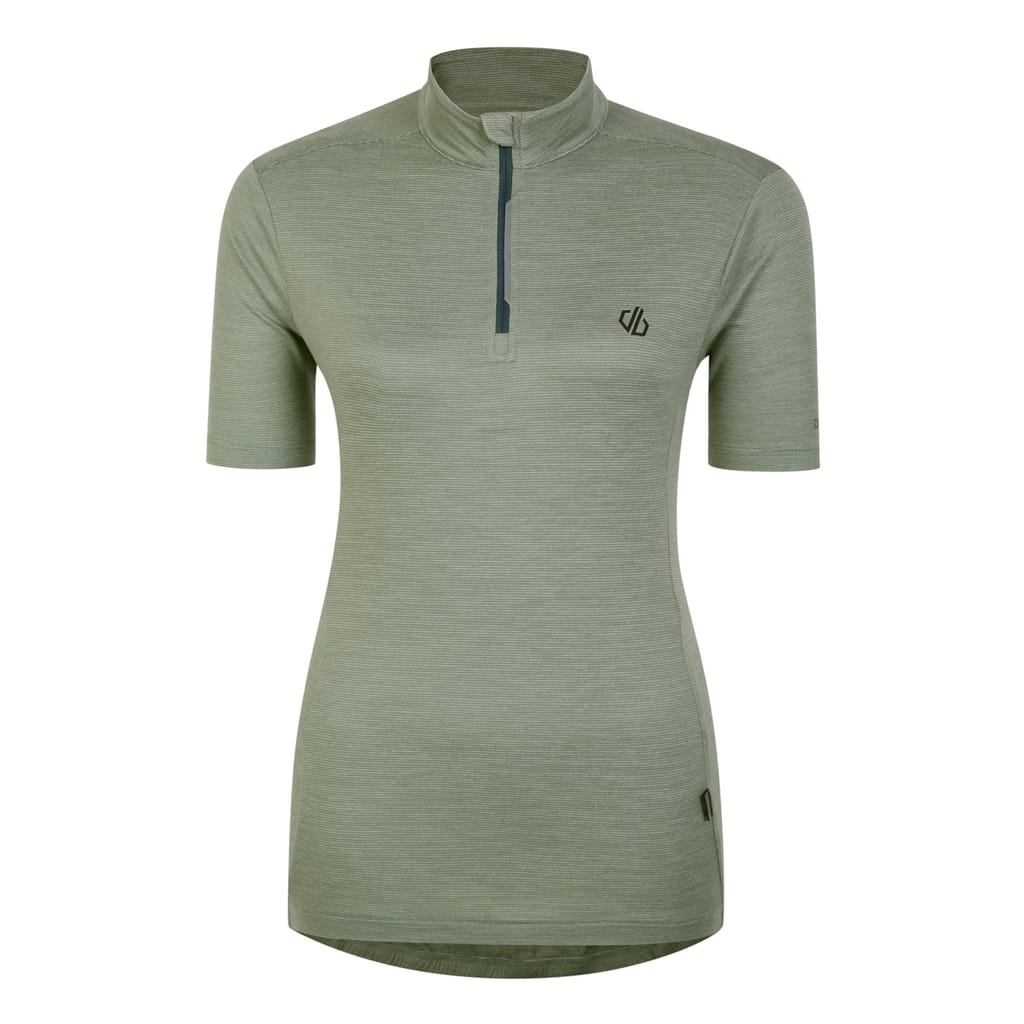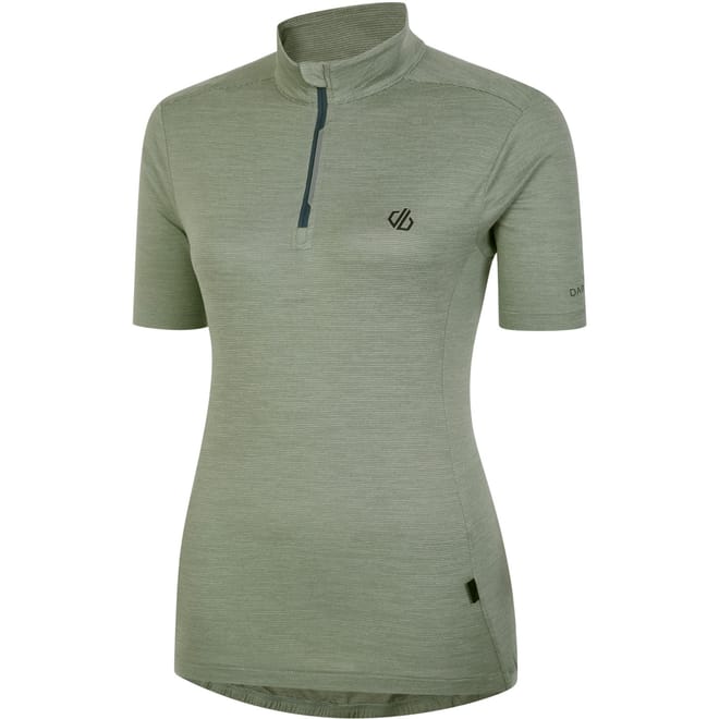 This Dare 2b top is designed for sporting activity, featuring a mock neck and short sleeves. The slim fit and solid pattern offer a sleek look, while the zipper closure adds functionality. A logo embellishment completes the design, making it a practical choice for active pursuits. -