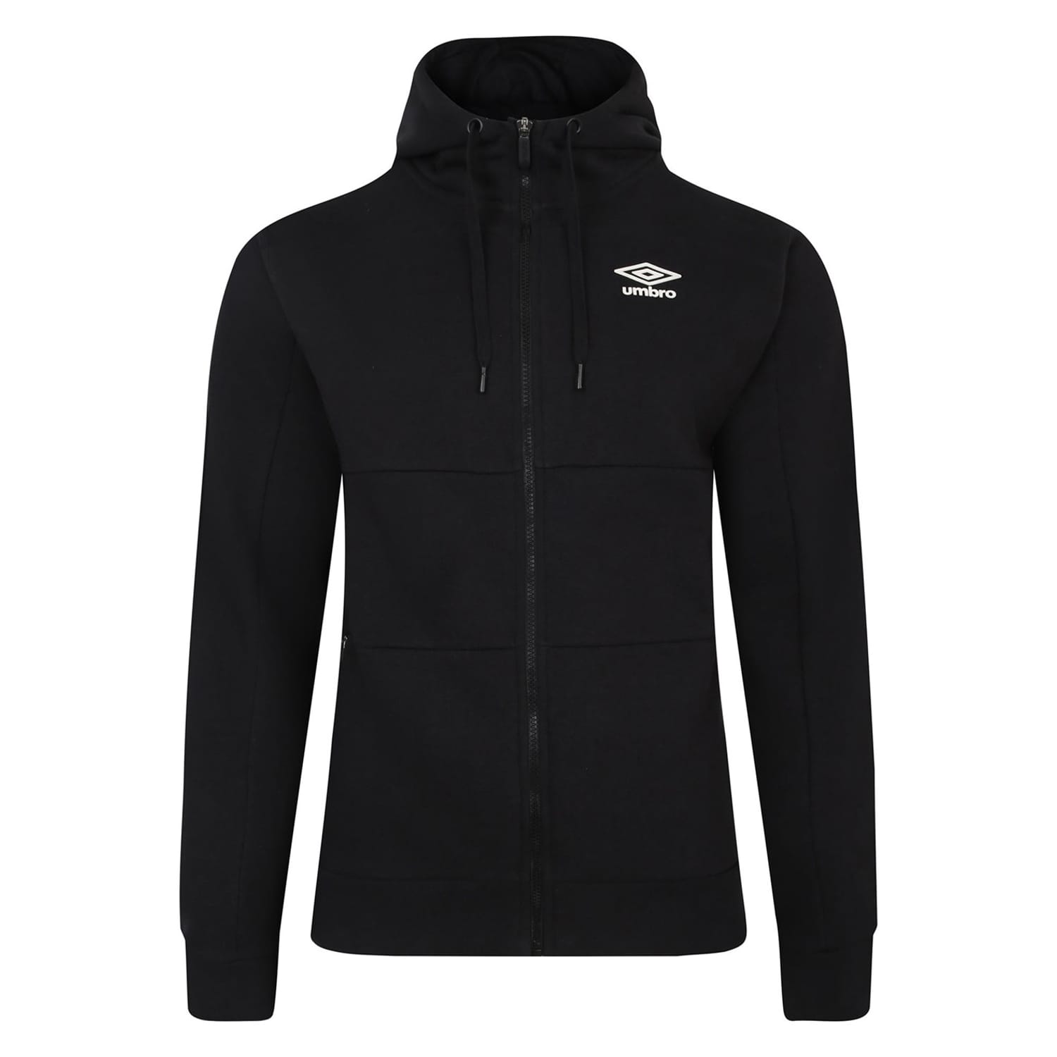 This Umbro sweatshirt jacket is a casual essential, featuring a hooded neckline and a full zipper closure. Crafted with a knit texture, it offers a regular fit for comfort. The solid pattern is complemented by a logo embellishment, while ribbed cuffs and hemline add a touch of detail. -