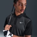 This Nike top is designed for performance with a regular fit and short sleeves. It features a polo collar and a front button closure, complemented by a straight hem. The solid pattern is enhanced by a front logo, adding a touch of brand identity. -