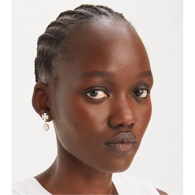 Discover the elegance of Tory Burch jewellery with these exquisite earrings. Featuring a harmonious blend of round and square shapes, they are adorned with lustrous pearls and mother of pearl embellishments. A perfect addition to any jewellery collection, these earrings embody sophistication and timeless style. -