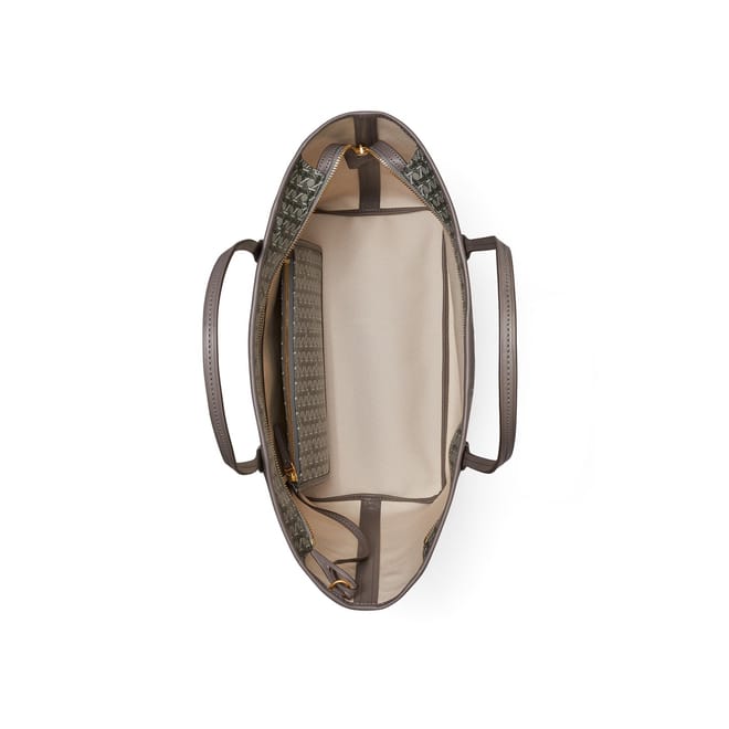 - The basketweave print and the label patch on the front provides that that signature Tory Burch touch.