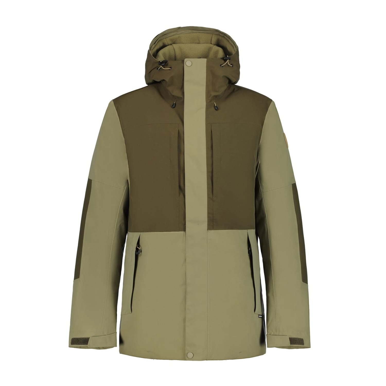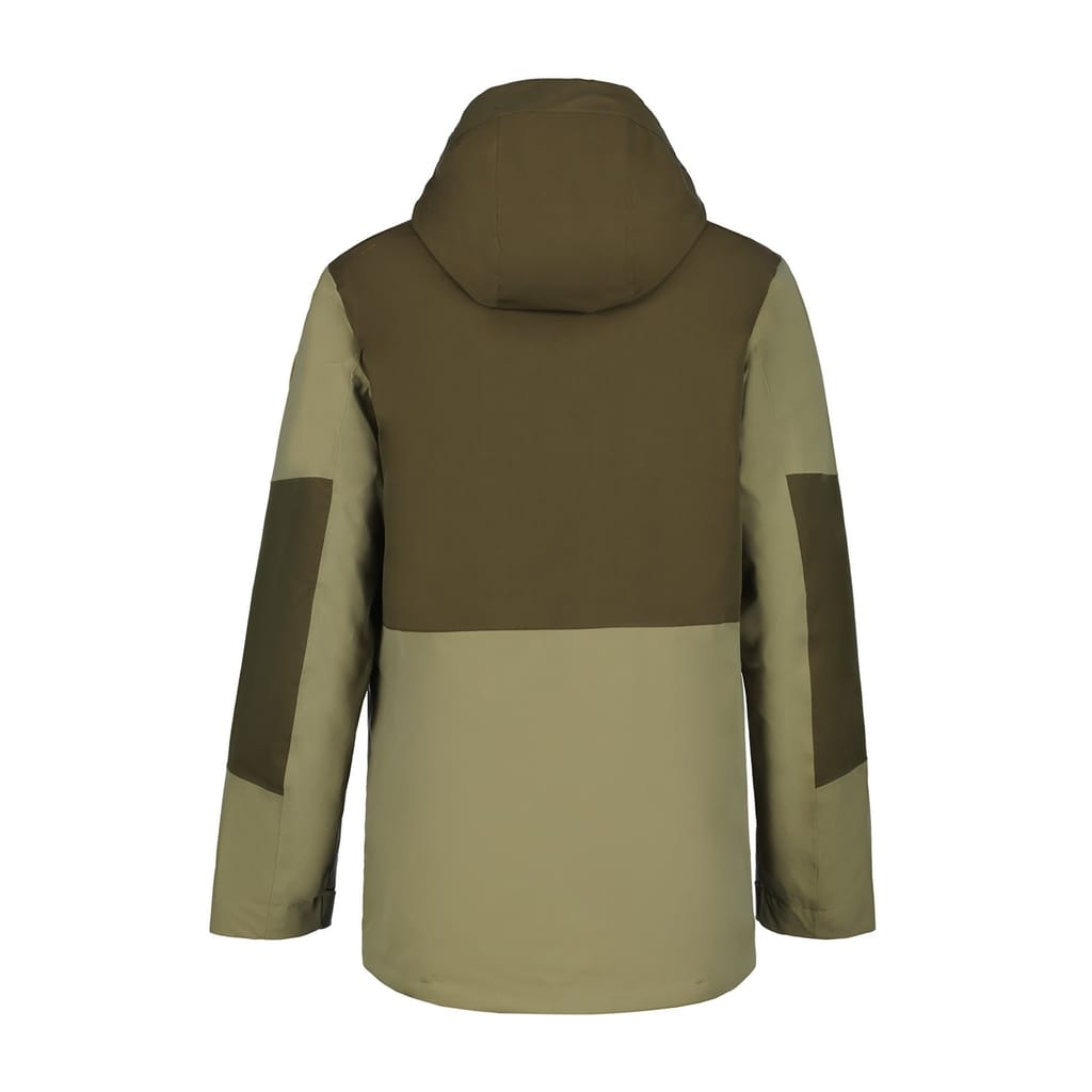 The Icepeak three-in-one jacket features a hooded design with a regular fit. It includes a zipper and snap button closure, complemented by a straight hem. The jacket showcases a colour block pattern and is embellished with practical pockets and a logo. -
