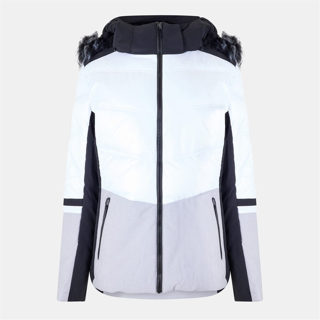 The Icepeak ski jacket features a hooded design with a zipper closure, offering a regular fit. It showcases a stylish colour block pattern and includes practical elements such as pockets, zipped pockets, and a fur trim. The straight hem adds to its sleek appearance, making it a functional choice for winter activities. -