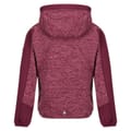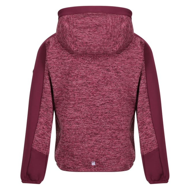 This Regatta kids' fleece jacket features a hooded design with a zipper closure, offering a practical and comfortable fit. The heathered pattern adds a stylish touch, while the raglan sleeves and elasticated cuffs ensure ease of movement. The straight hem and regular fit provide a classic silhouette. Finished with a logo embellishment, this jacket is perfect for keeping warm. -