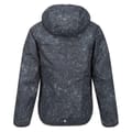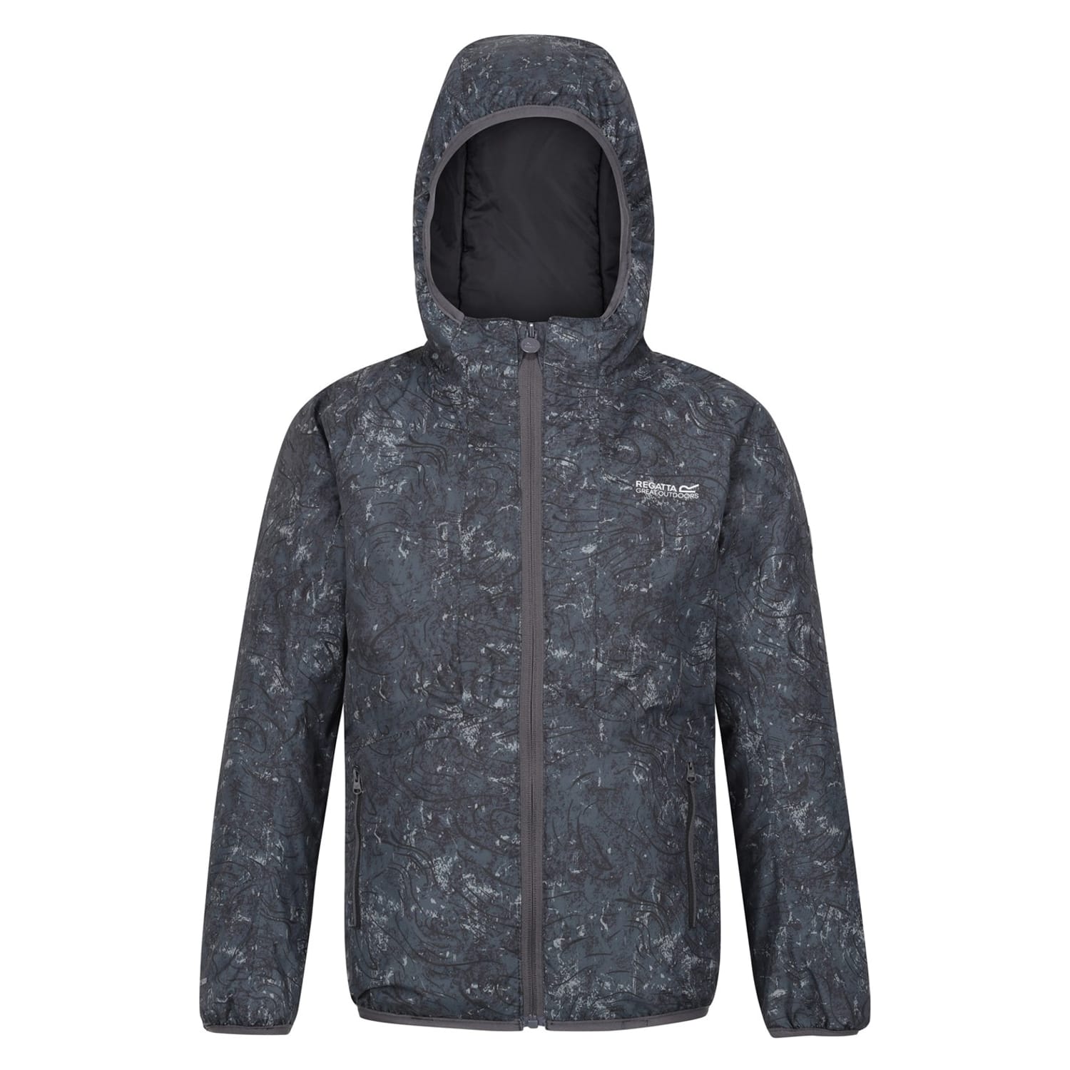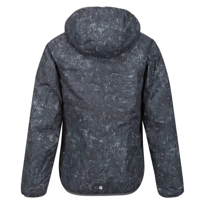 The Regatta softshell jacket features a hooded design with a zipper closure, offering a regular fit. It showcases an abstract pattern and a straight hem, complemented by a logo embellishment. -