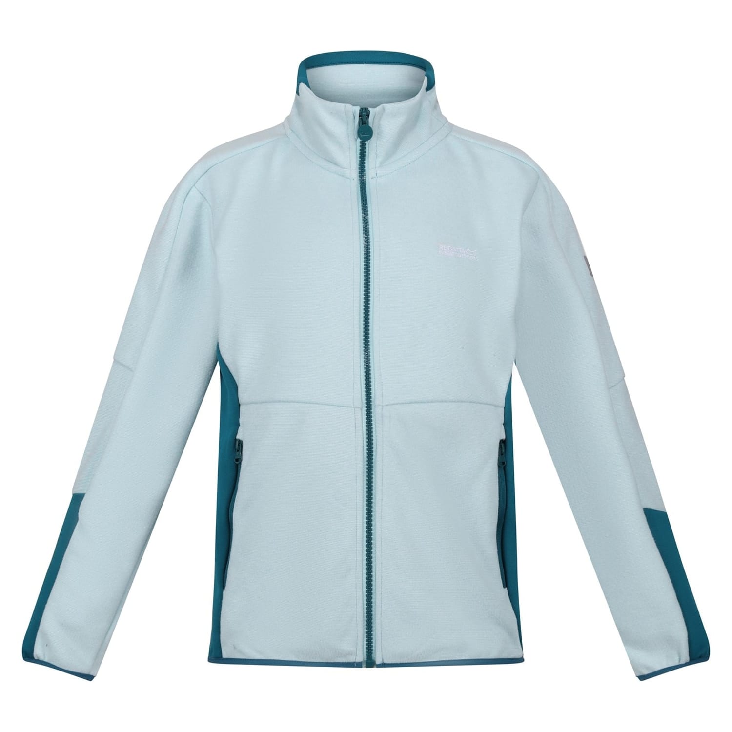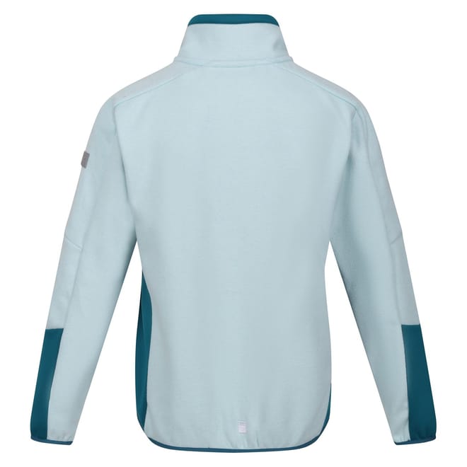 This Regatta fleece jacket features a mock neck and a full zipper closure, offering a regular fit. The solid pattern and straight hem provide a clean look, while the ribbed cuffs add a touch of detail. The jacket is adorned with a logo embellishment, enhancing its brand identity. -