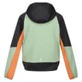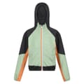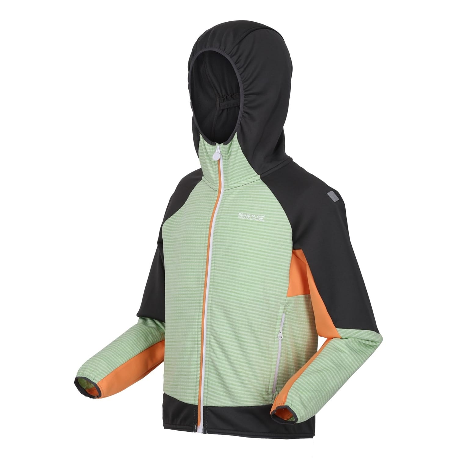 This Regatta softshell jacket features a hooded design with a regular fit, perfect for outdoor activities. The jacket includes a zipper closure and raglan sleeves with elasticated cuffs for added comfort. It boasts a straight hem and horizontal stripe pattern, complemented by practical pockets and a subtle logo embellishment. -