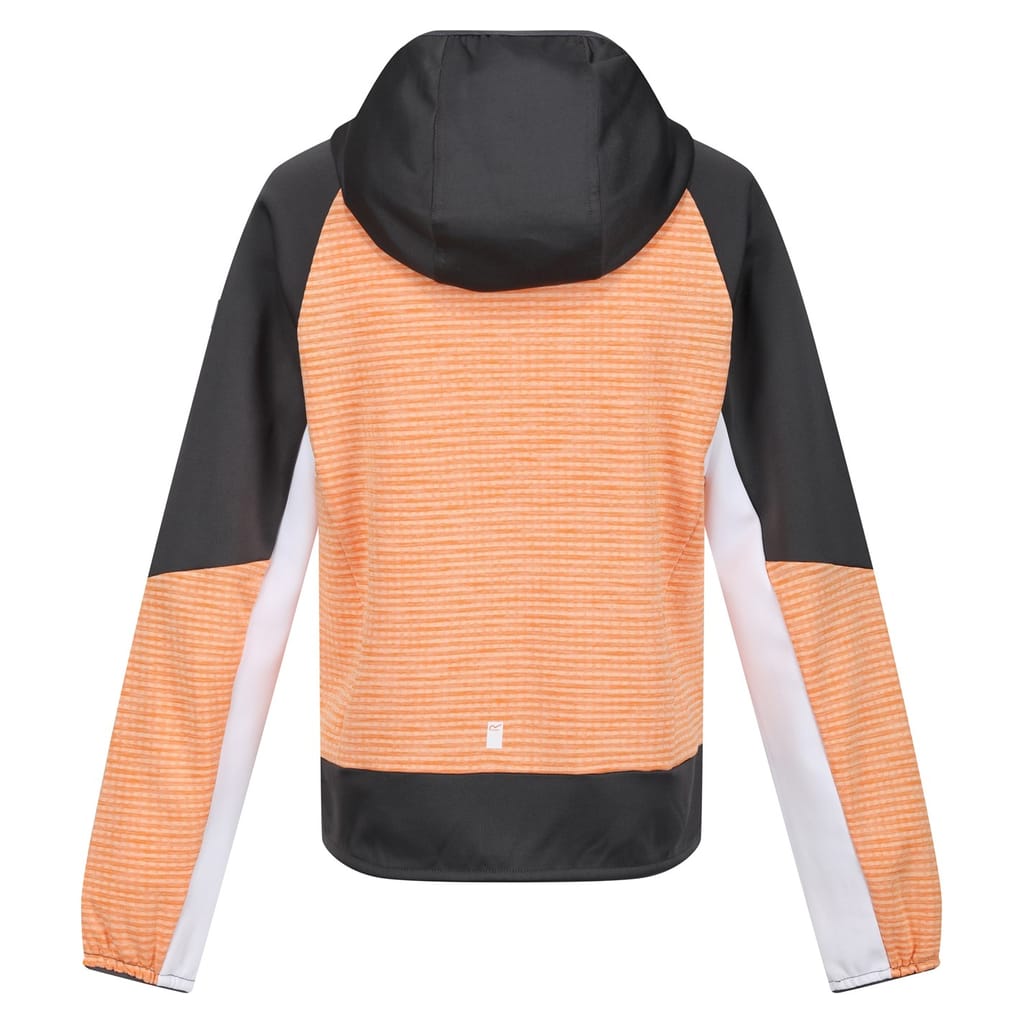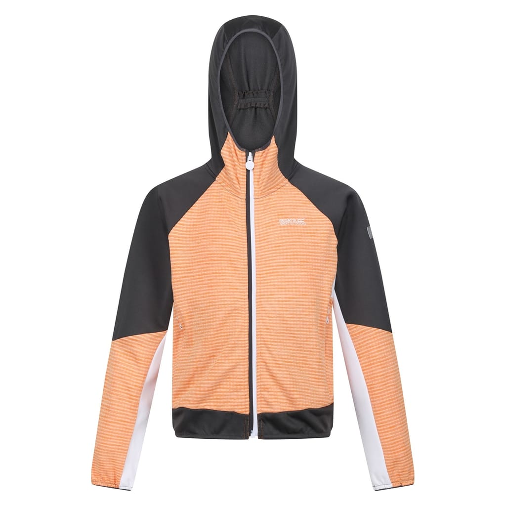 The Regatta softshell jacket from the activewear collection features a hooded design with a zipper closure. It has a regular fit with raglan sleeves and ribbed cuffs, offering comfort and flexibility. The jacket is adorned with a logo and showcases a horizontal stripe pattern. It is completed with a straight hem, making it a practical choice for outdoor activities. -