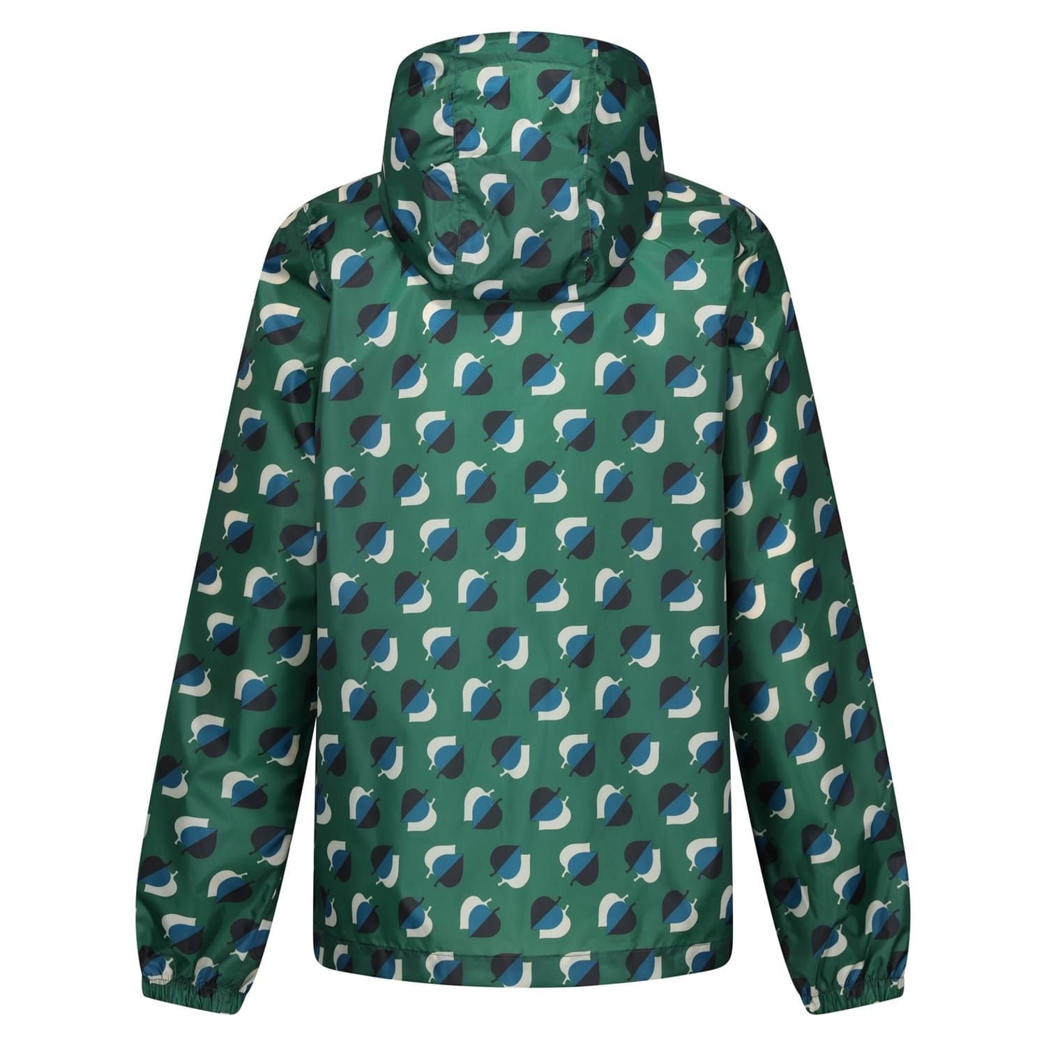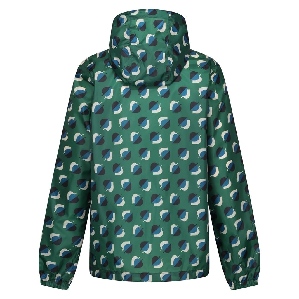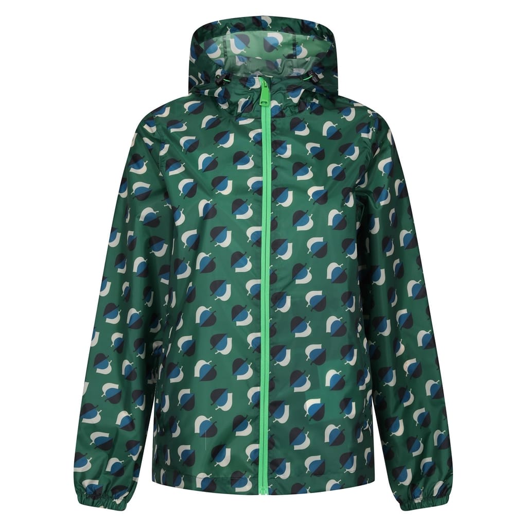 The Regatta softshell jacket features a hooded neck and a relaxed fit, offering comfort and style. It includes a zipper closure and elasticated cuffs for a secure fit. The jacket is adorned with a geometric pattern and a logo embellishment, adding a touch of distinction. Its short length and straight hem make it a versatile choice for various occasions. -