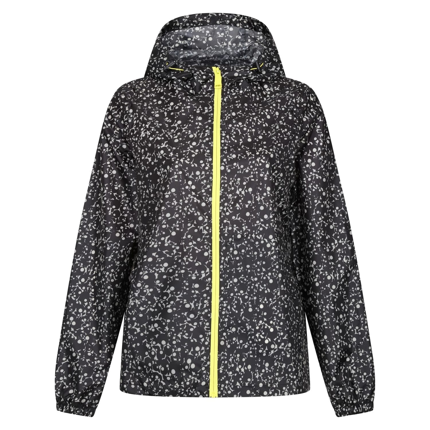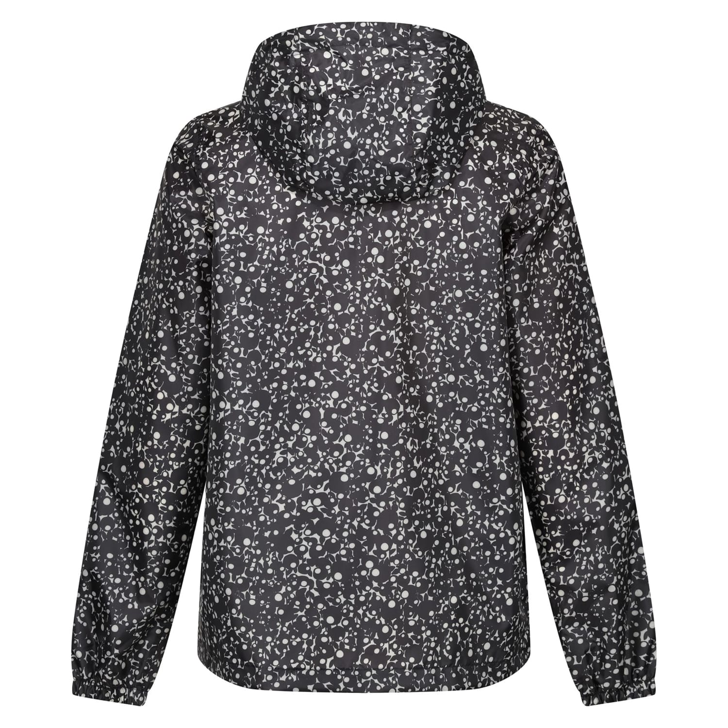 The Regatta softshell jacket features a hooded neckline and a relaxed fit, perfect for casual outings. It includes a zipper closure and elasticated cuffs for added comfort. The jacket is adorned with a floral pattern and practical pockets, complemented by a straight hem for a clean finish. -