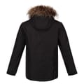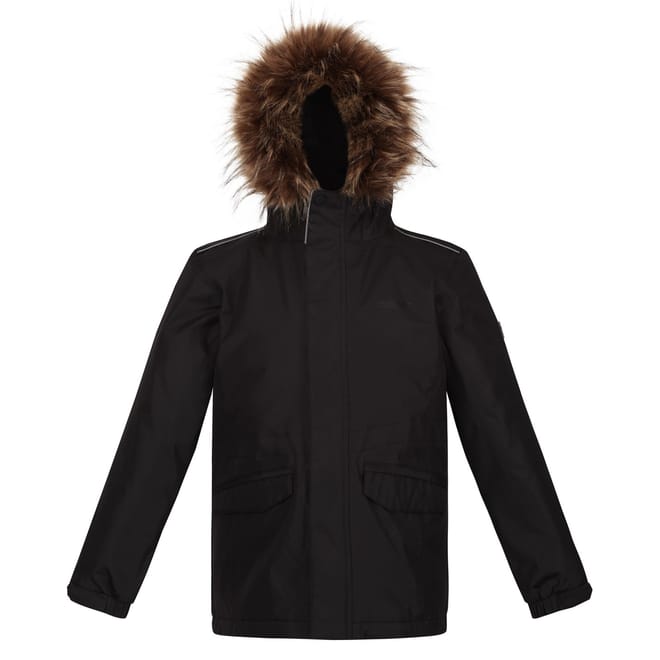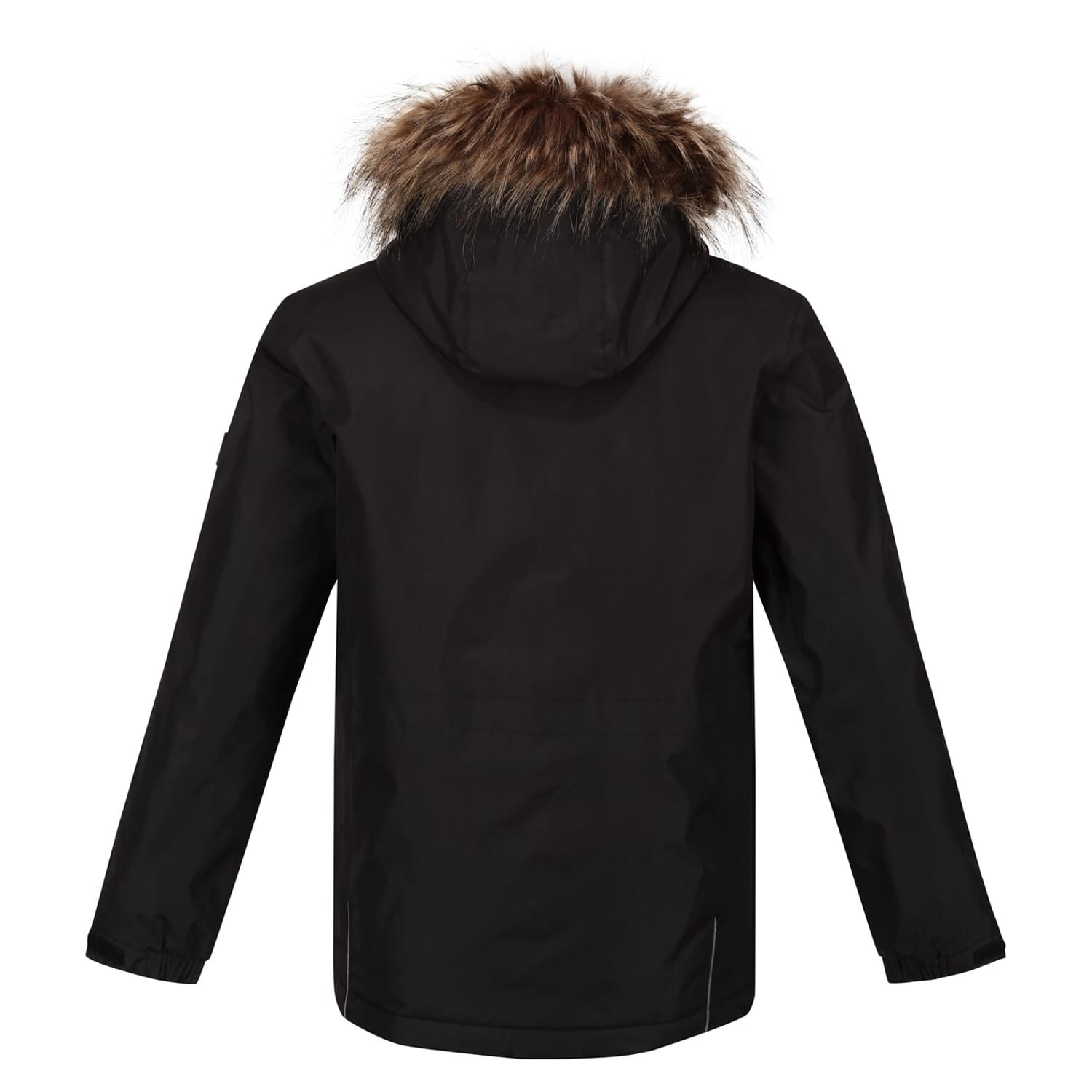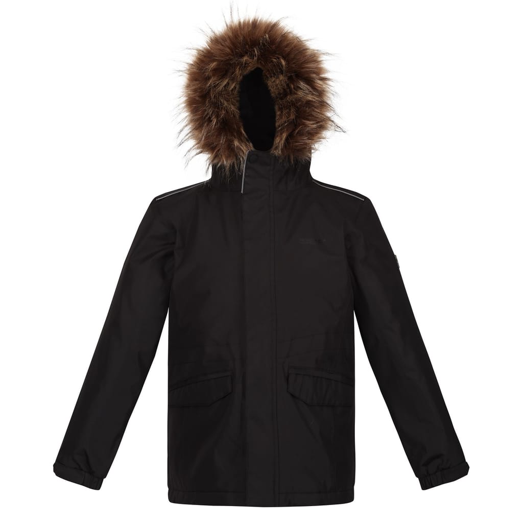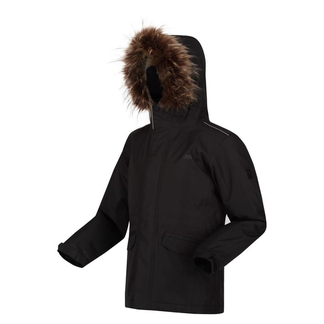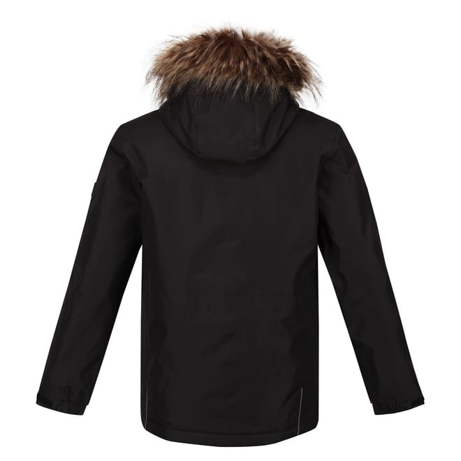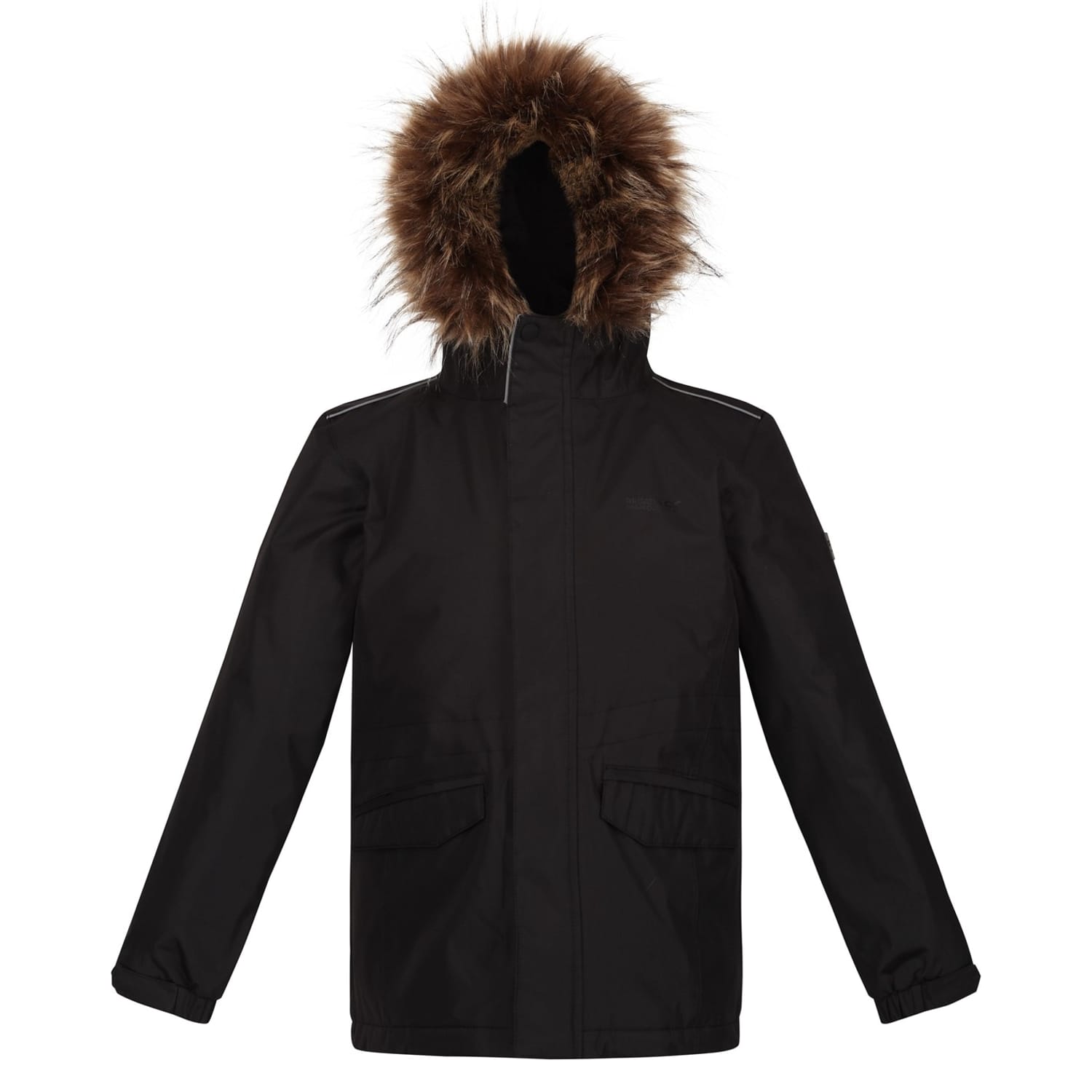 Stay dry and stylish with the Regatta parka jacket. This water-repellent piece features a hooded design and a zipper closure for added protection. The regular fit ensures comfort, while the elasticated cuffs and straight hem provide a neat finish. Embellished with practical pockets, a logo, and a fur trim, this solid-patterned jacket is a versatile addition to your wardrobe. -