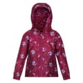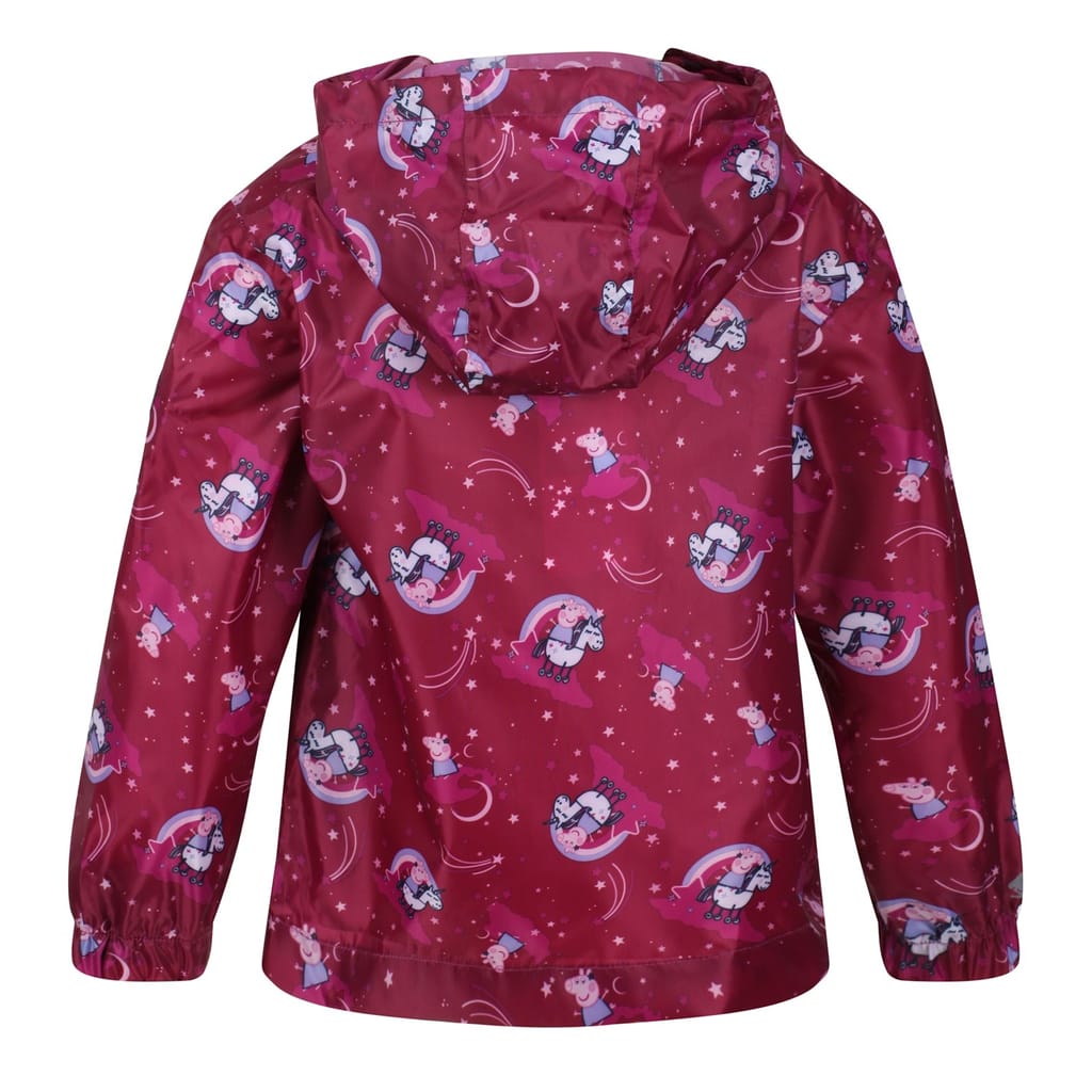 Stay dry with Regatta's water-repellent jacket, featuring a hooded design and a convenient zipper closure. This regular fit jacket includes elasticated cuffs for added comfort. The jacket is adorned with a logo and a playful cartoon pattern, making it both functional and stylish for rainy days. -