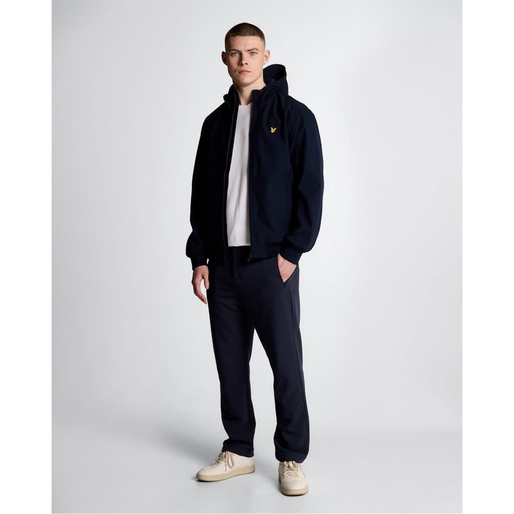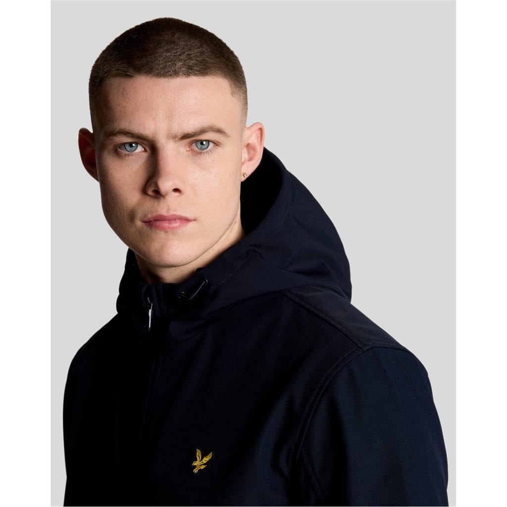 This Lyle & Scott softshell jacket features a hooded design and a solid pattern. It offers a regular fit with a ribbed hem and ribbed cuffs for added comfort. The jacket is equipped with a zipper closure and is adorned with the brand's logo, ensuring a stylish yet functional outerwear option. -