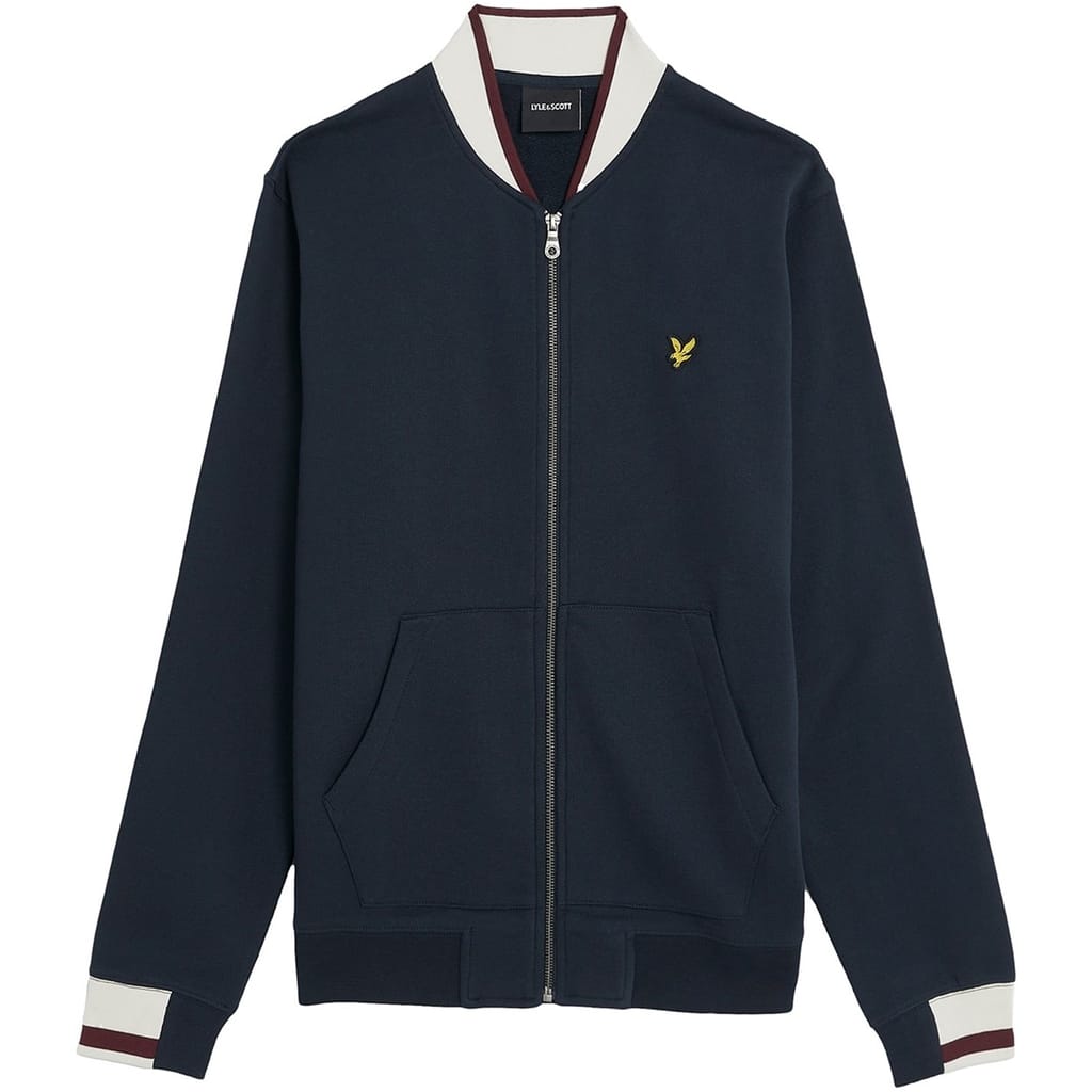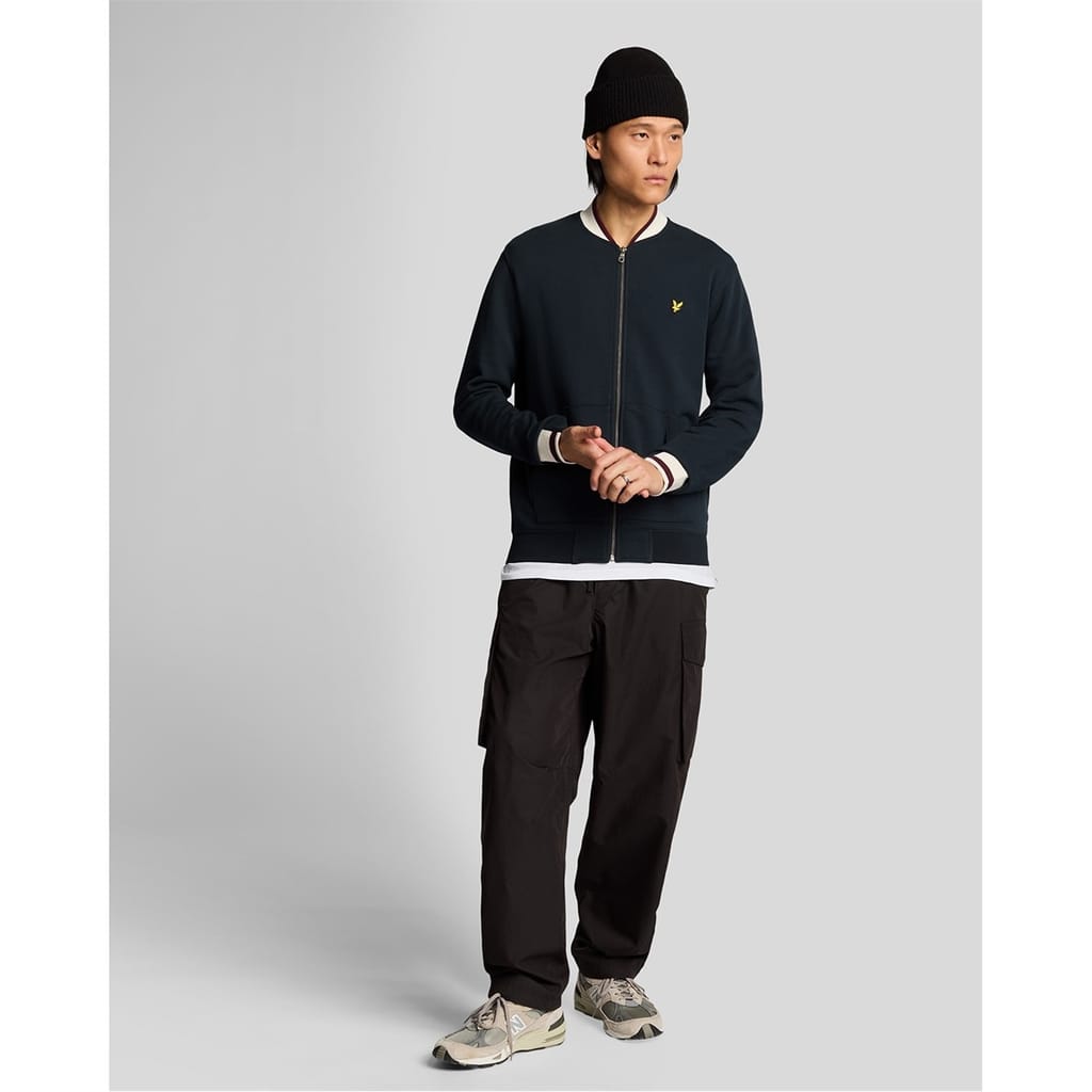 This Lyle & Scott bomber jacket is a staple for casual wear. It features a short length with a ribbed crew neck and bomber collar, offering a classic silhouette. The jacket is designed with a solid pattern and a regular fit, complete with a zipper closure. Ribbed cuffs and hem add to its style, while the logo embellishment provides a subtle brand touch. -