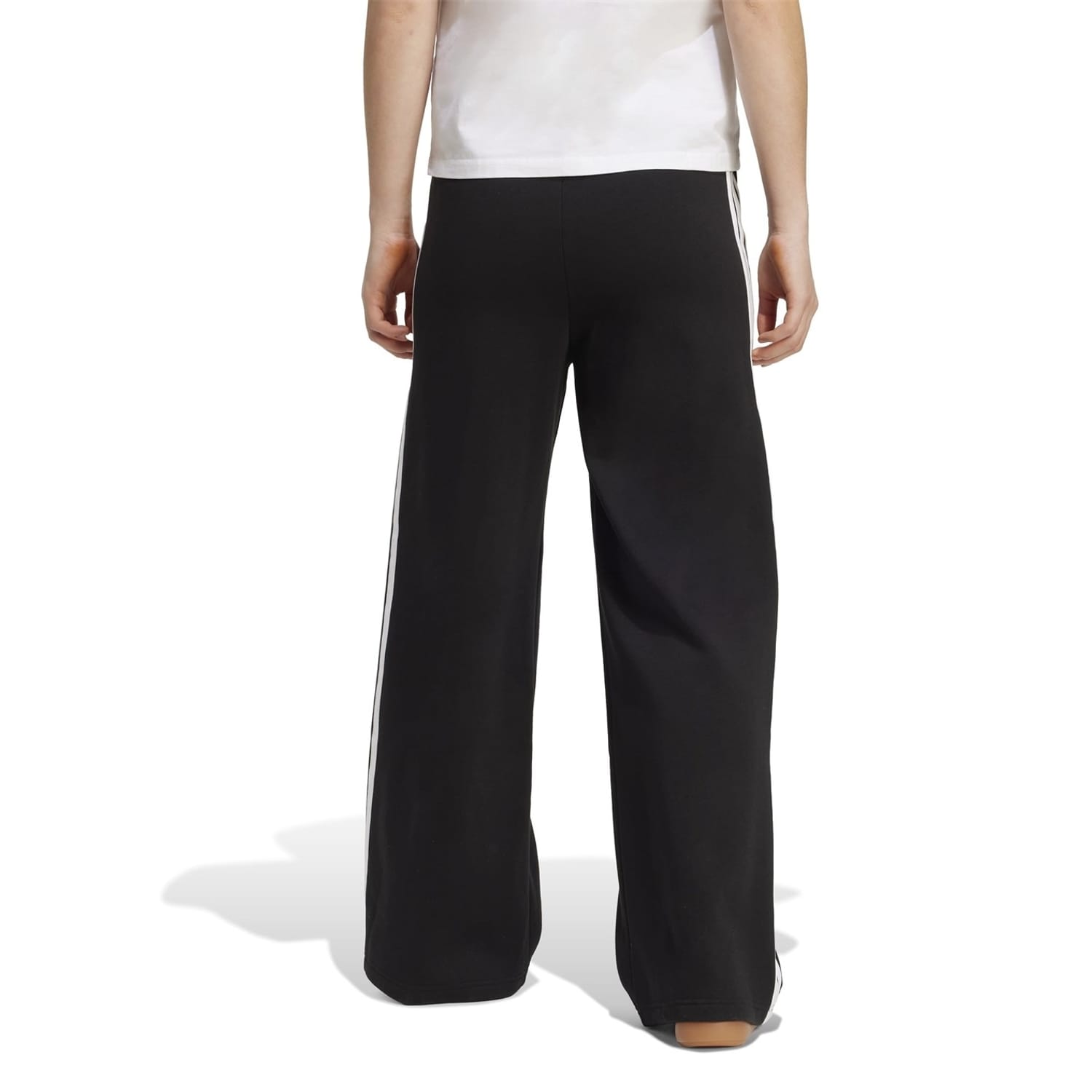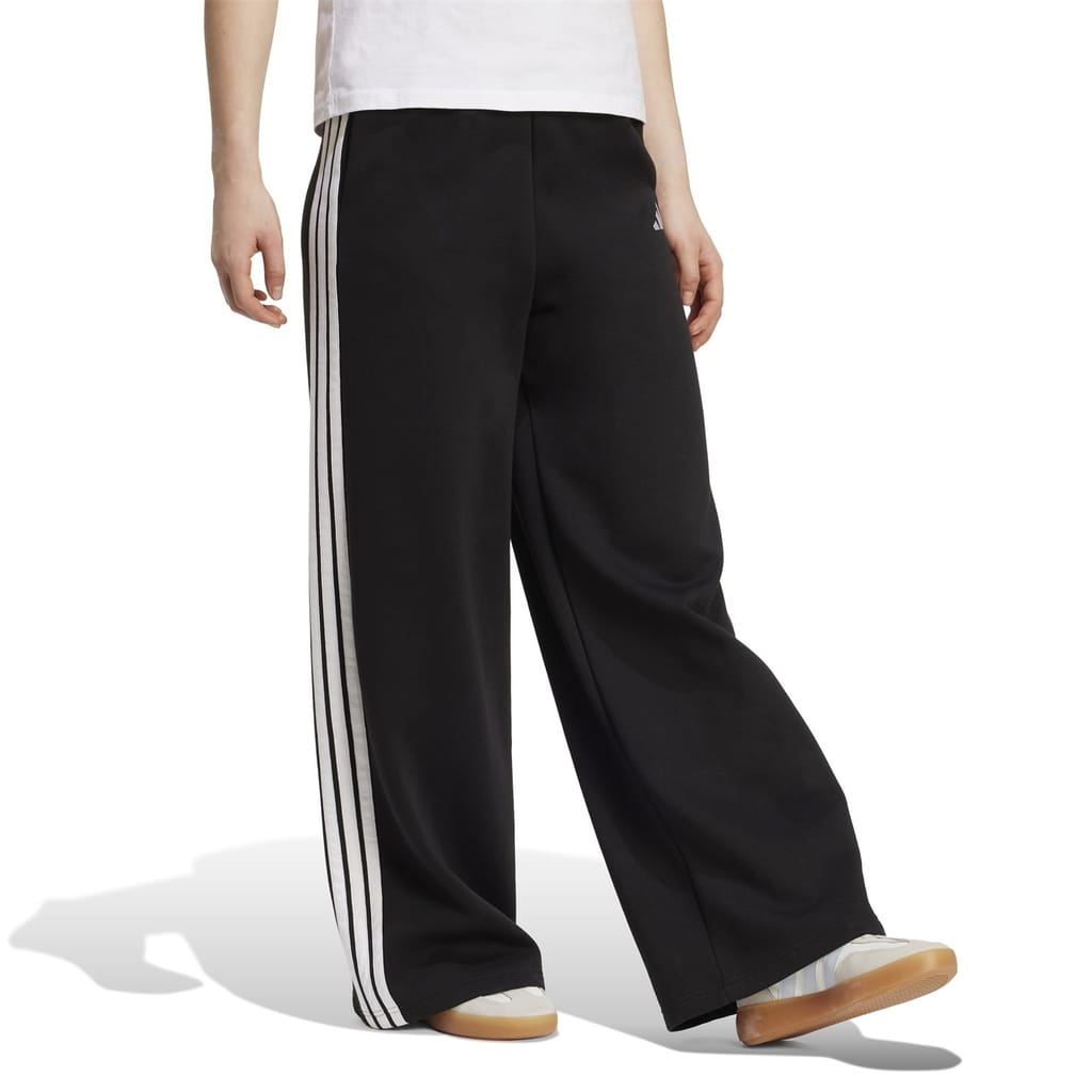 These wide-leg track pants feature a distinctive three-stripes pattern, complemented by side stripes and a logo embellishment. Designed with a wide fit, they offer both comfort and style. The addition of pockets enhances their practicality, making them a versatile choice for athletic activities. -