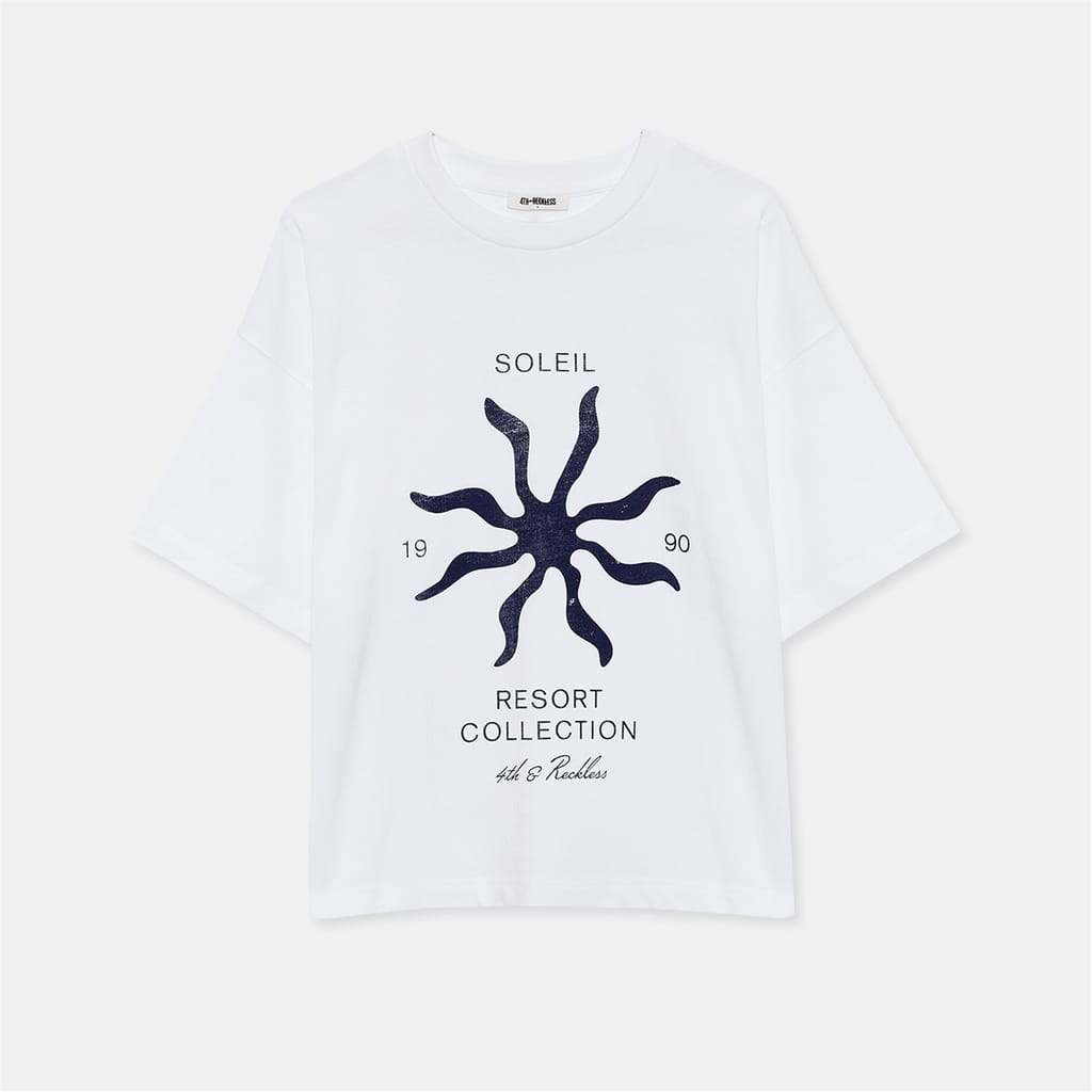 This 4th & Reckless top is perfect for casual wear, featuring a regular fit and short sleeves with a drop shoulder design. The crew neck adds a classic touch, while the graphic print and logo embellishment make it stand out. Ideal for spring and summer, this top combines style and comfort effortlessly. -