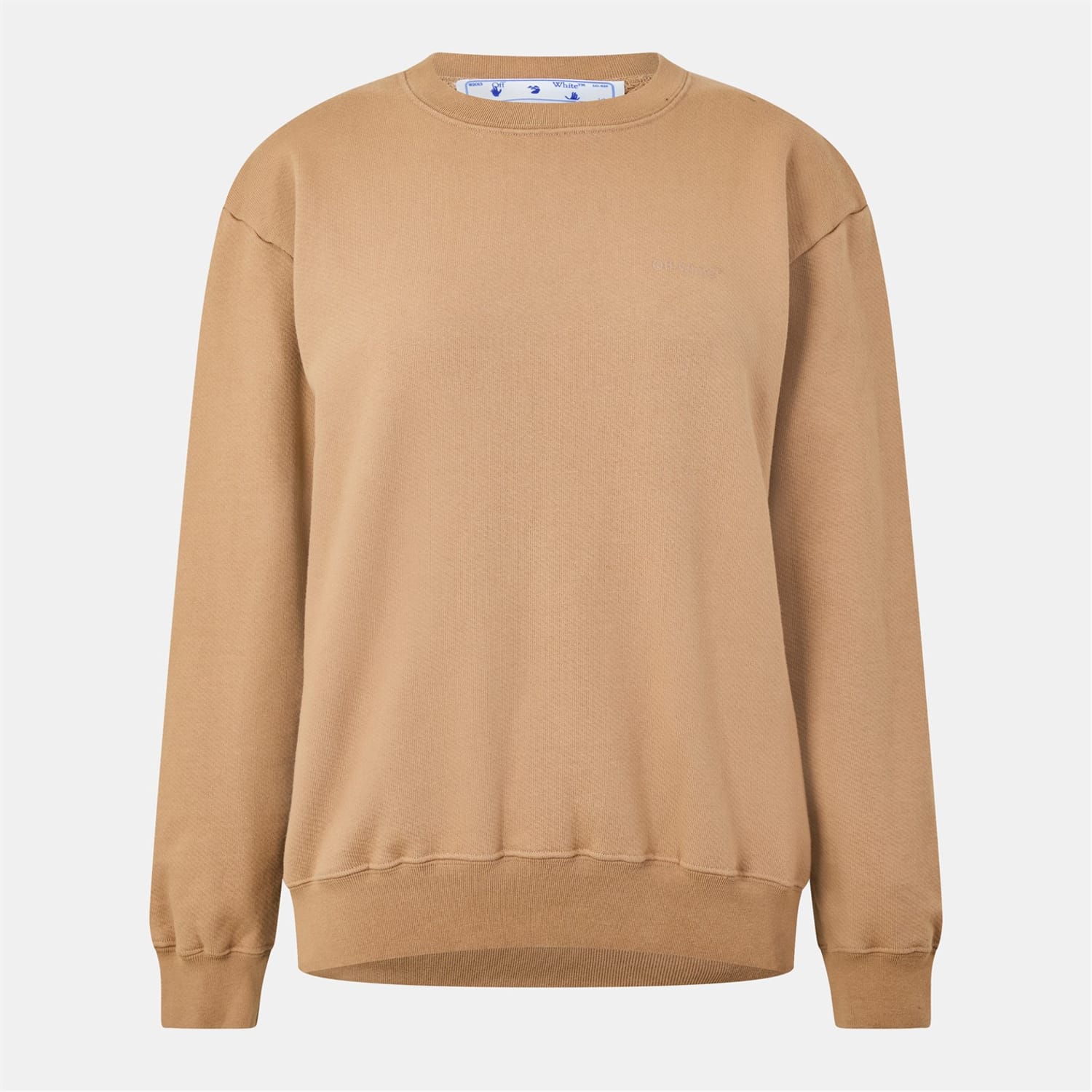 This Off White top features a relaxed fit with long sleeves and a crew neck. The solid pattern is complemented by a ribbed cuff, adding a touch of texture. A logo embellishment subtly enhances the design, making it a stylish choice for any wardrobe. -