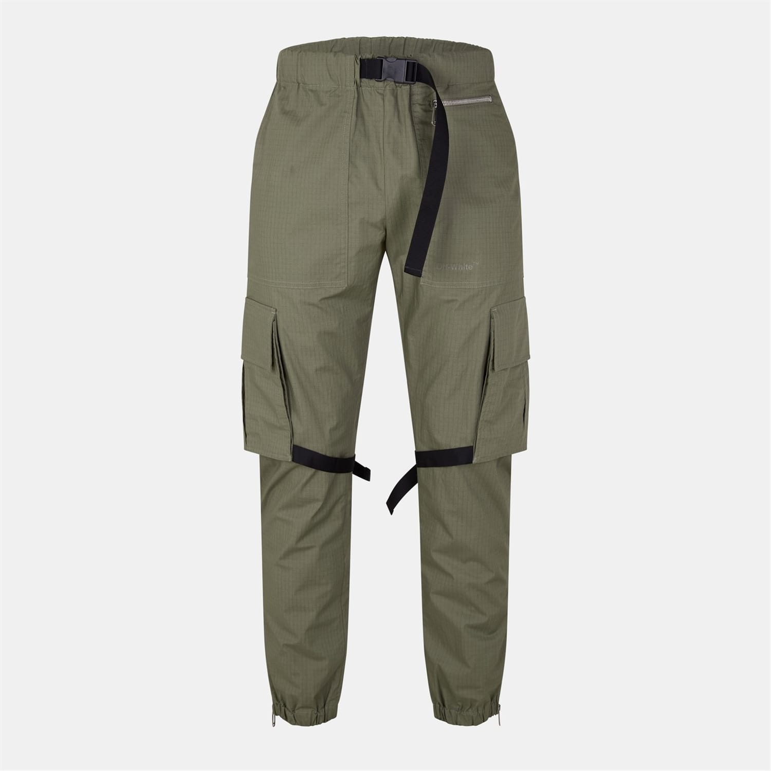 Off White cargo pants feature a buckle and zipper closure, offering a practical and stylish option for casual wear. These pants are adorned with pockets and a logo, adding a touch of brand identity to the design. Perfect for those seeking a blend of functionality and fashion in their everyday wardrobe. -