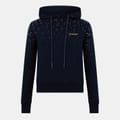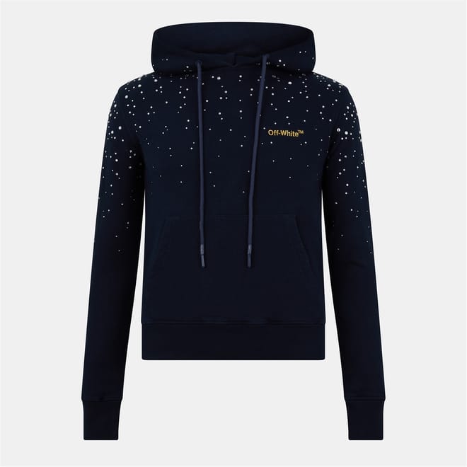 This Off White top is a casual staple for all seasons. Featuring a hooded design with a drawstring closure, it offers a regular fit with long sleeves. The solid pattern is enhanced by rhinestone embellishments, adding a touch of flair. Ribbed cuffs complete the look, making it a versatile addition to your wardrobe. -