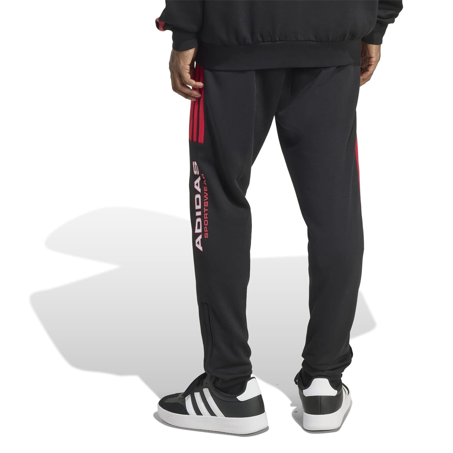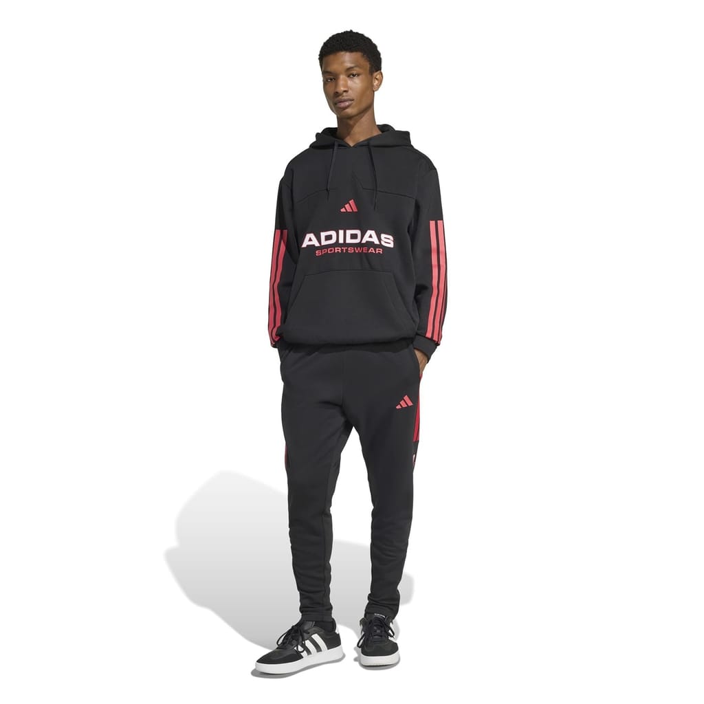 adidas joggers feature an elasticated waistband and zipper for a secure fit. Embellished with side stripes and the iconic three bar logo, these joggers offer both style and functionality. The design includes side zip pockets and a front pocket, providing ample storage. The three stripes pattern and lettering graphic add a distinctive touch to these athletic joggers. -