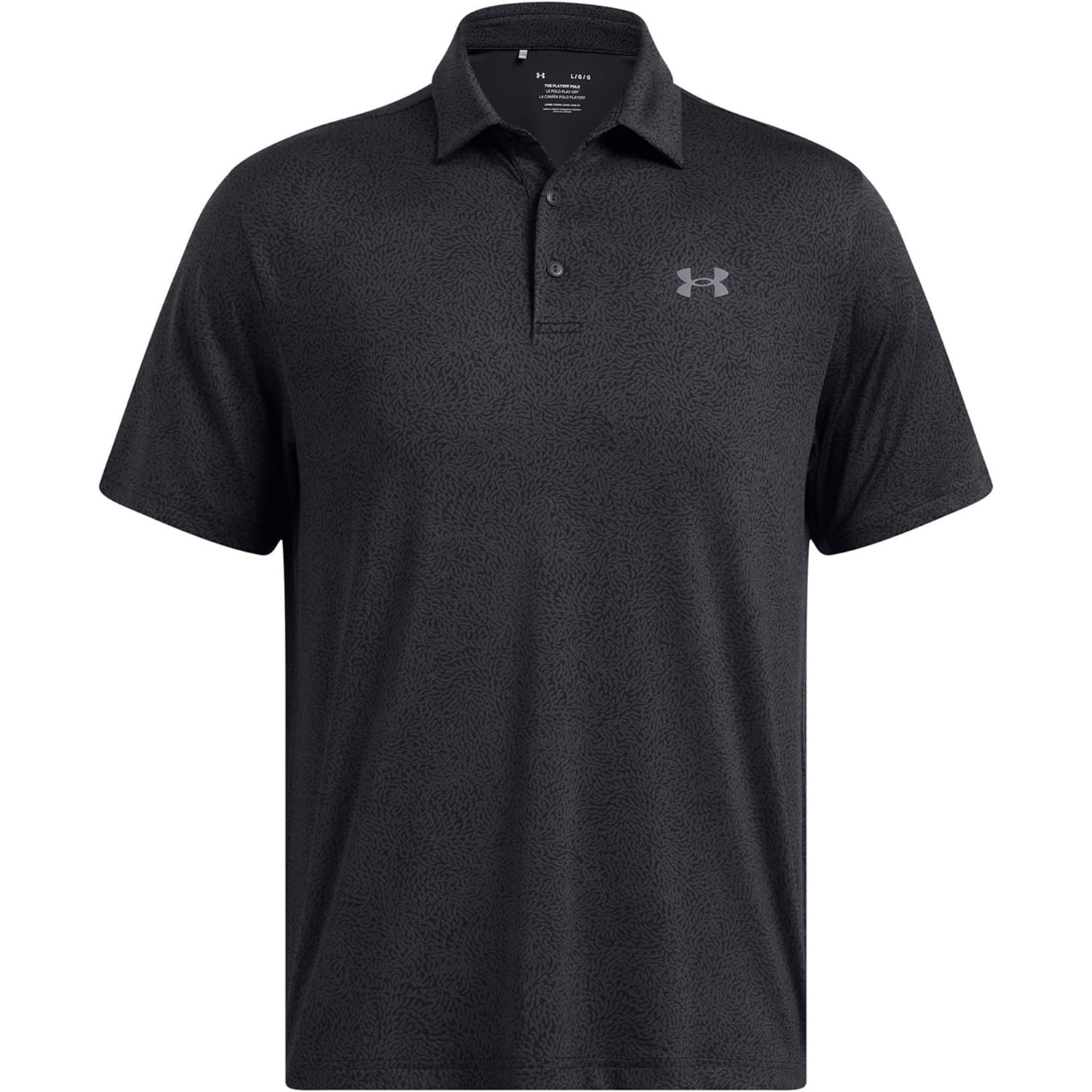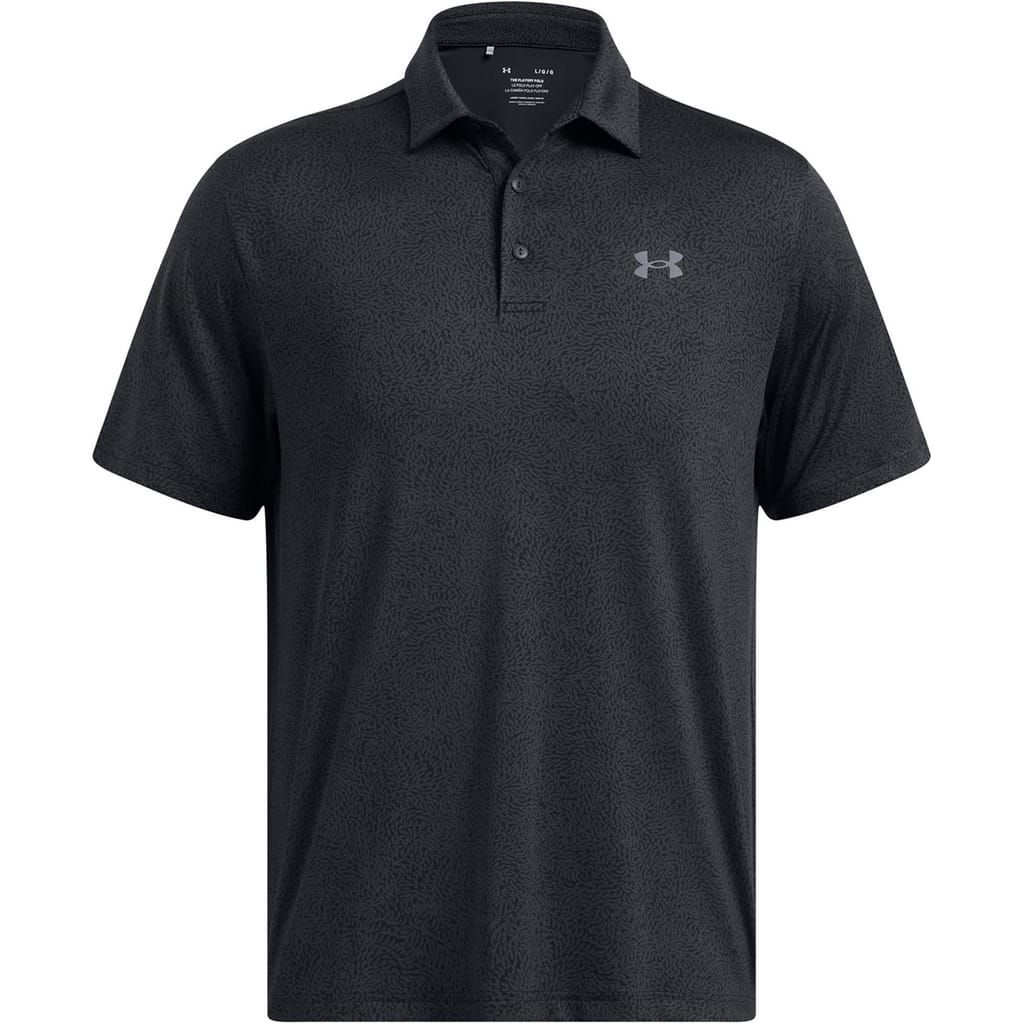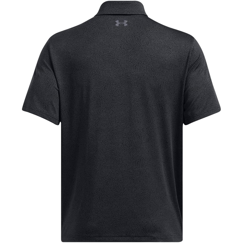 This Under Armour top is designed for performance, featuring a regular fit and short sleeves. The polo collar adds a classic touch, while the button closure ensures a secure fit. The all-over print pattern and logo embellishment make it a standout piece in the activewear collection. -