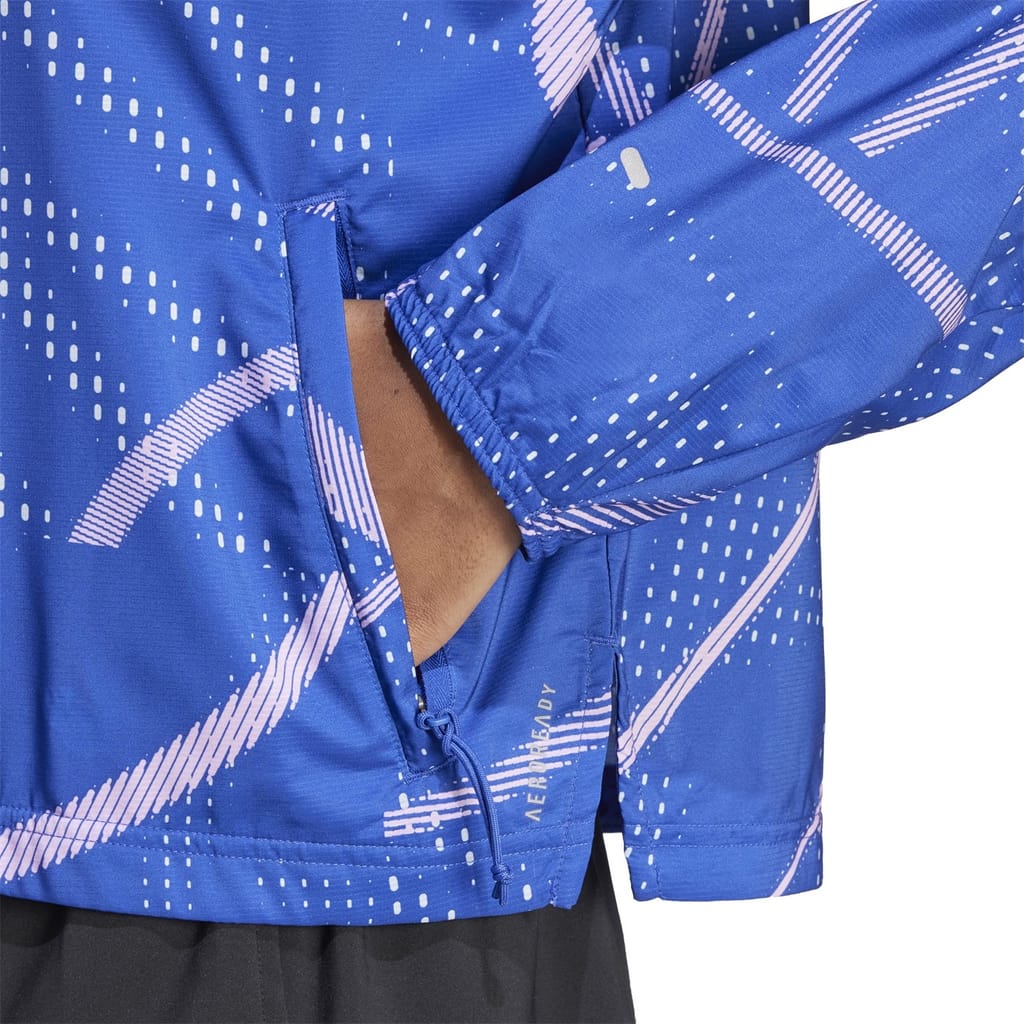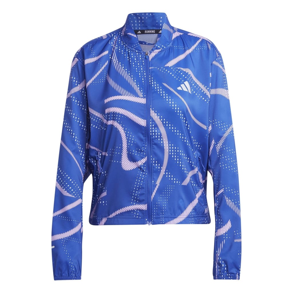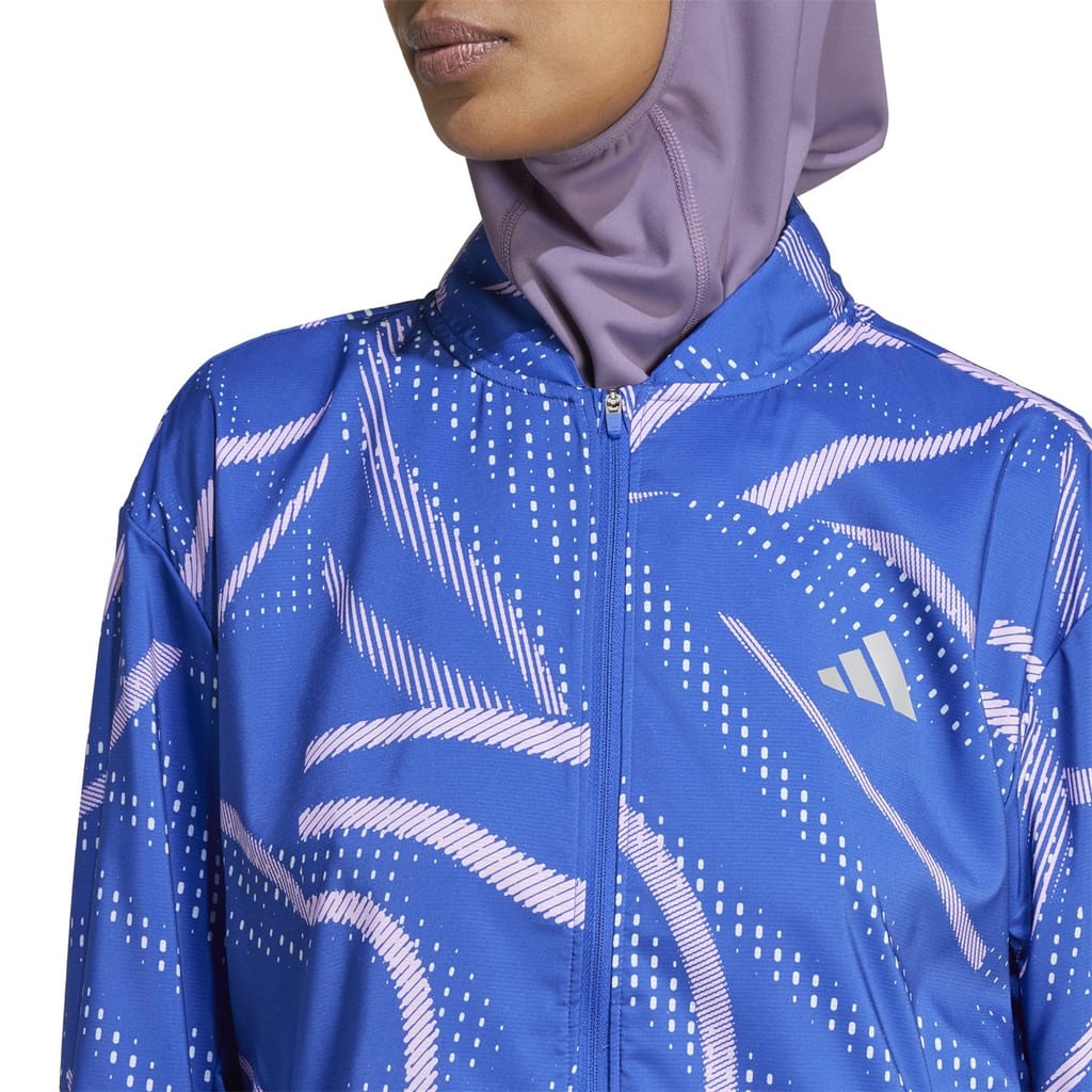 This adidas performance jacket from the activewear collection features a mock neck and a relaxed fit. It is designed with a zipper closure and elasticated cuffs for added comfort. The short length and straight hem provide a sleek silhouette, while the graphic print and logo embellishment add a stylish touch. -