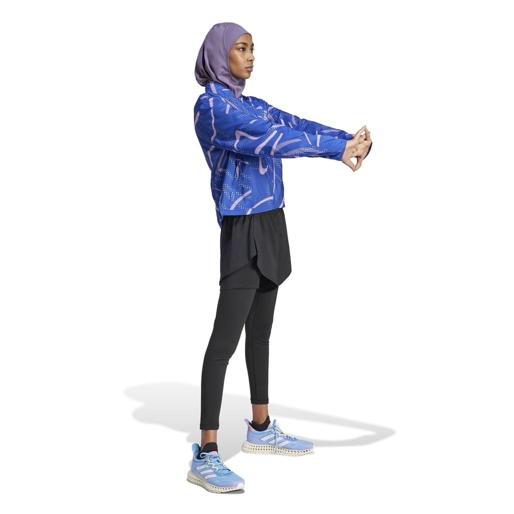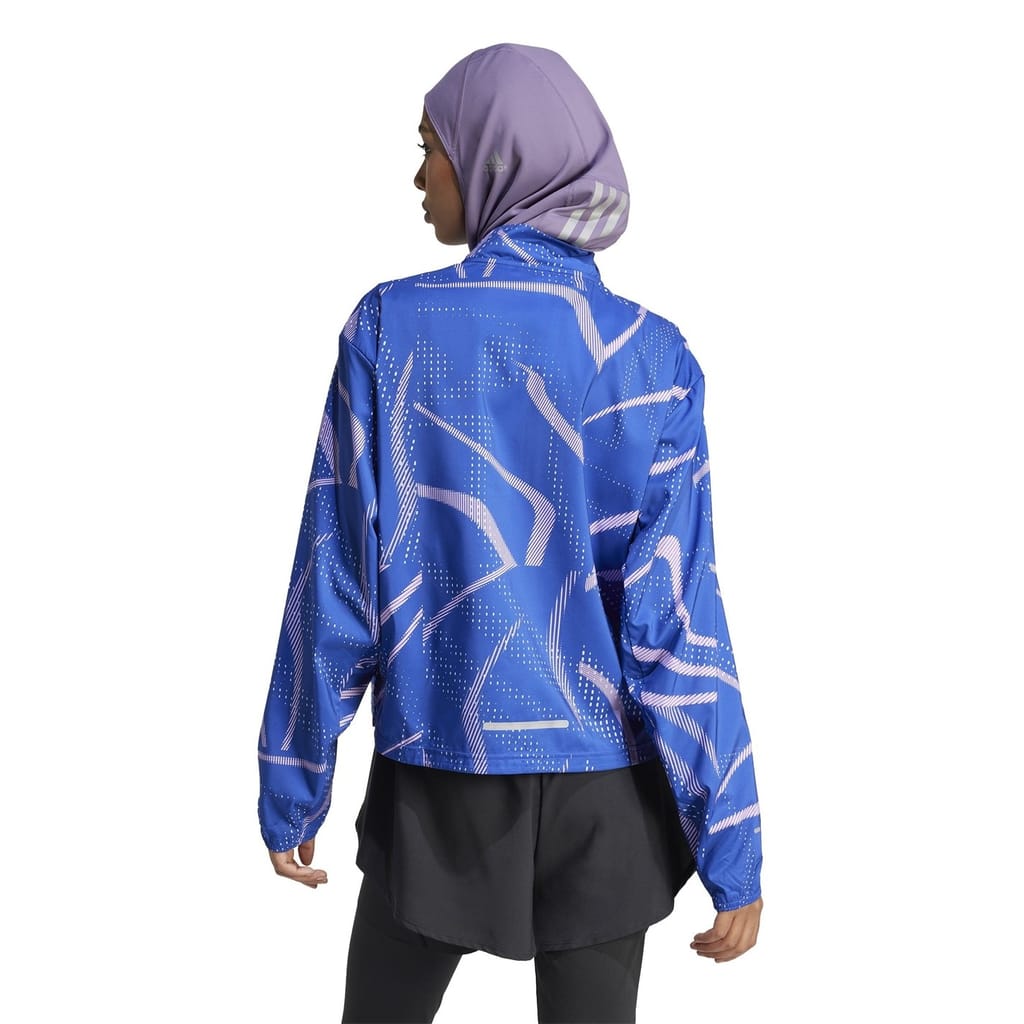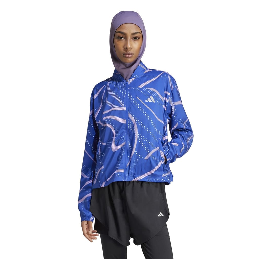 This adidas performance jacket from the activewear collection features a mock neck and a relaxed fit. It is designed with a zipper closure and elasticated cuffs for added comfort. The short length and straight hem provide a sleek silhouette, while the graphic print and logo embellishment add a stylish touch. -