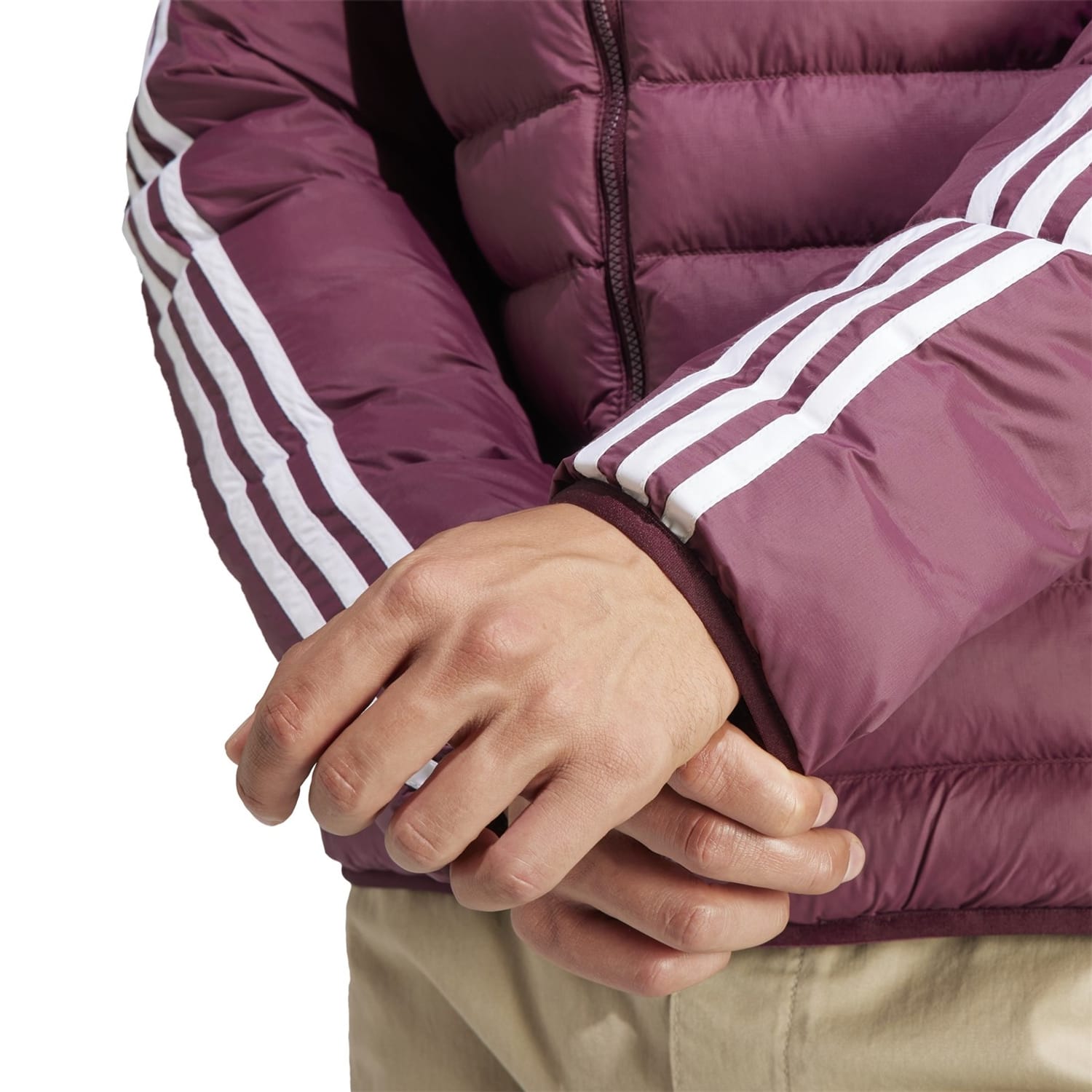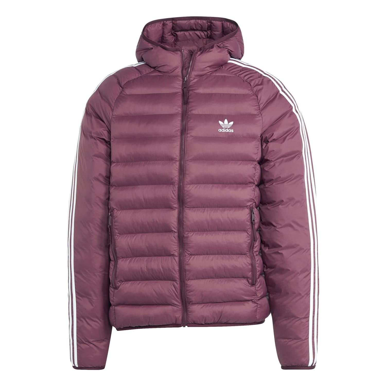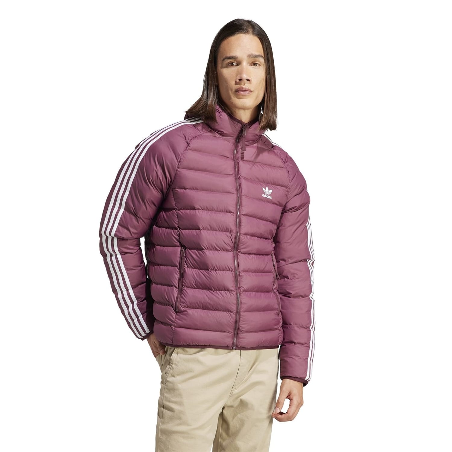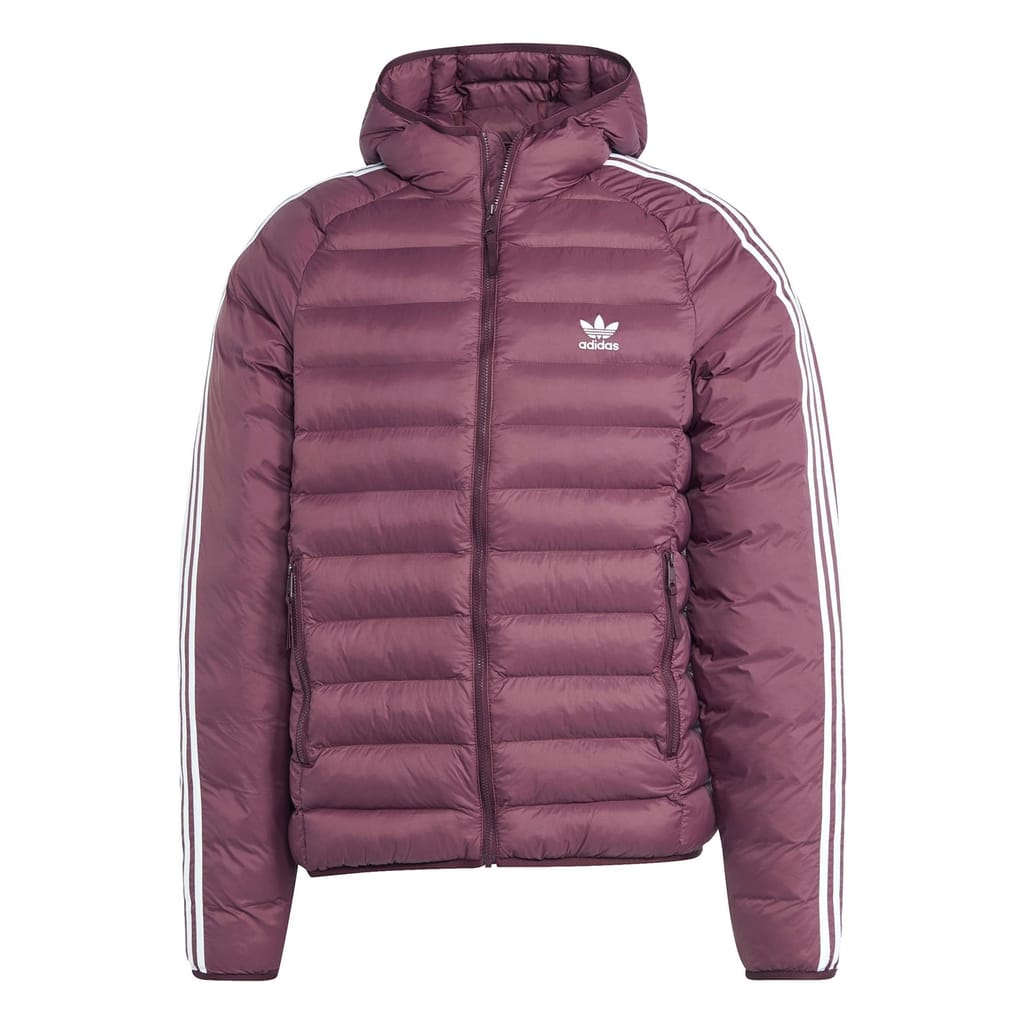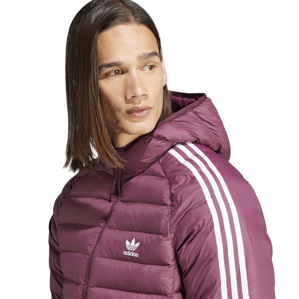 This adidas Originals puffer jacket is a lightweight, short-length piece featuring a high collar and a regular fit. It includes a zipper closure and raglan sleeves with elasticated cuffs for added comfort. The solid pattern is complemented by logo embellishments and side stripes, while the straight hem completes the design. -