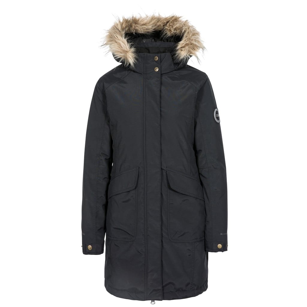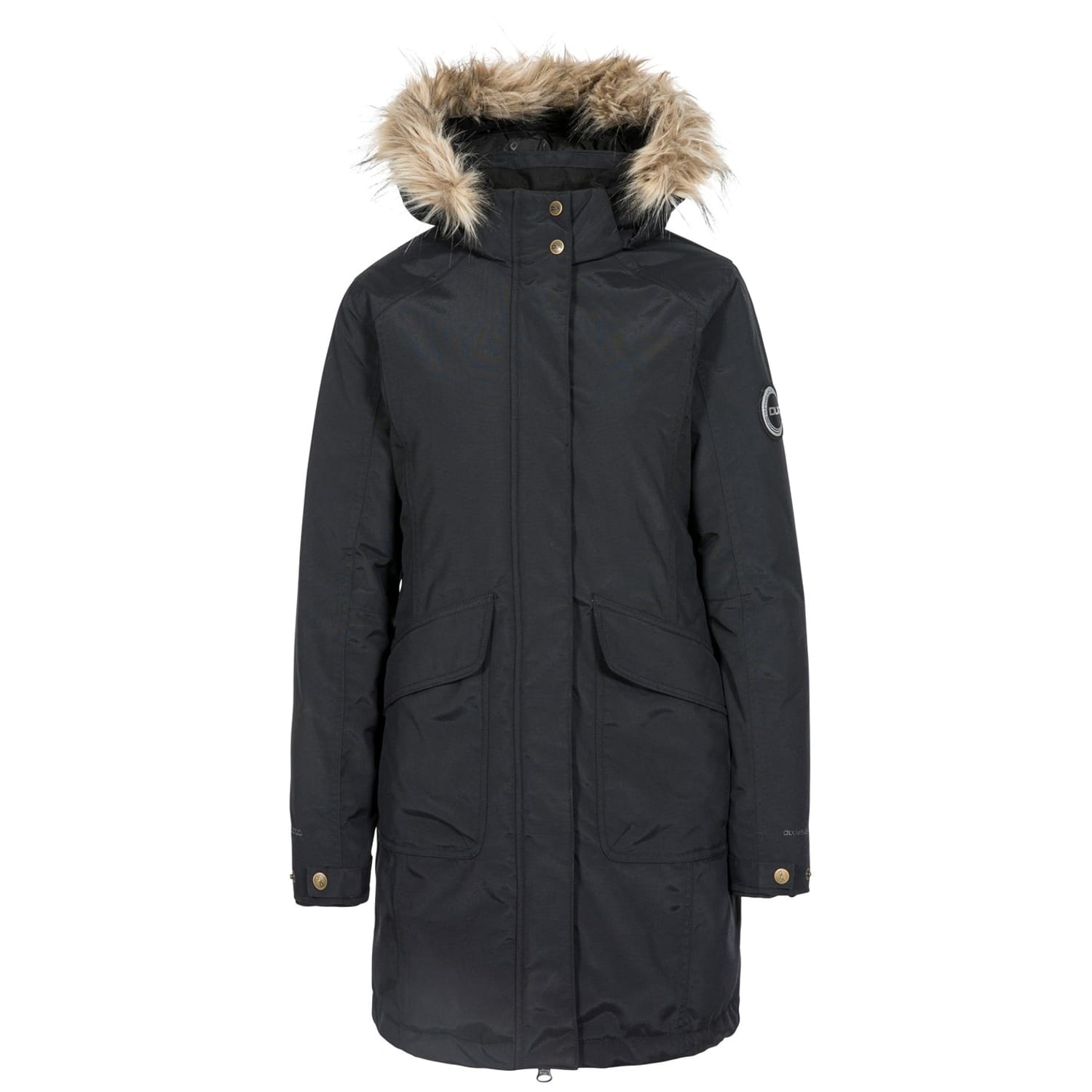 The DLX down jacket offers a regular fit with a hooded neckline, providing warmth and comfort. It features a snap button and zipper closure, complemented by a ribbed cuff and straight hem. The solid pattern is enhanced with logo embellishments, while practical elements include flap and zipped pockets for added functionality. -