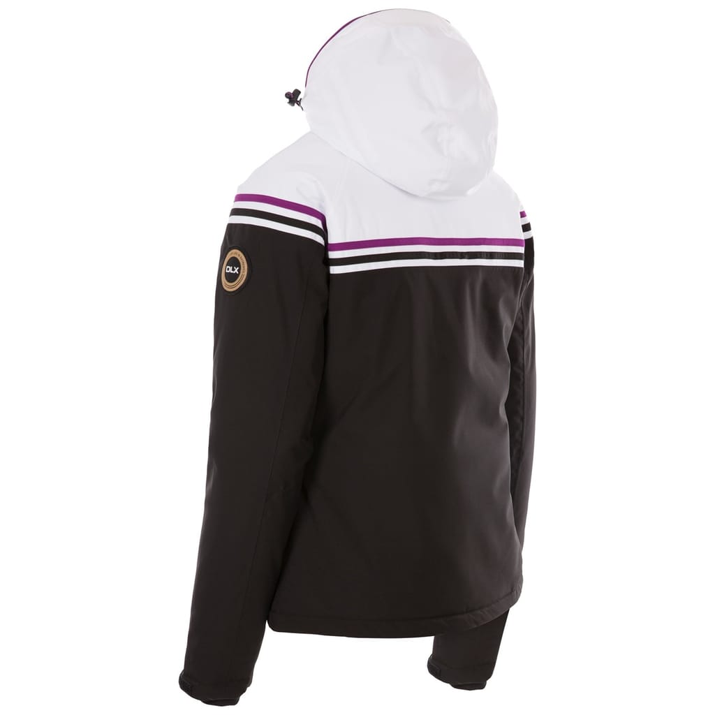 The DLX ski jacket is designed for optimal performance on the slopes. Featuring a hooded neckline and a regular fit, it ensures comfort and style. The jacket includes a zipper closure and a straight hem, complemented by raglan sleeves for ease of movement. Embellished with a logo and patch, the striped pattern adds a touch of flair to this functional piece. -