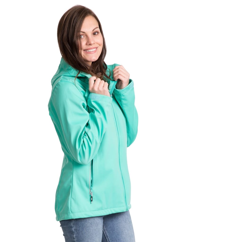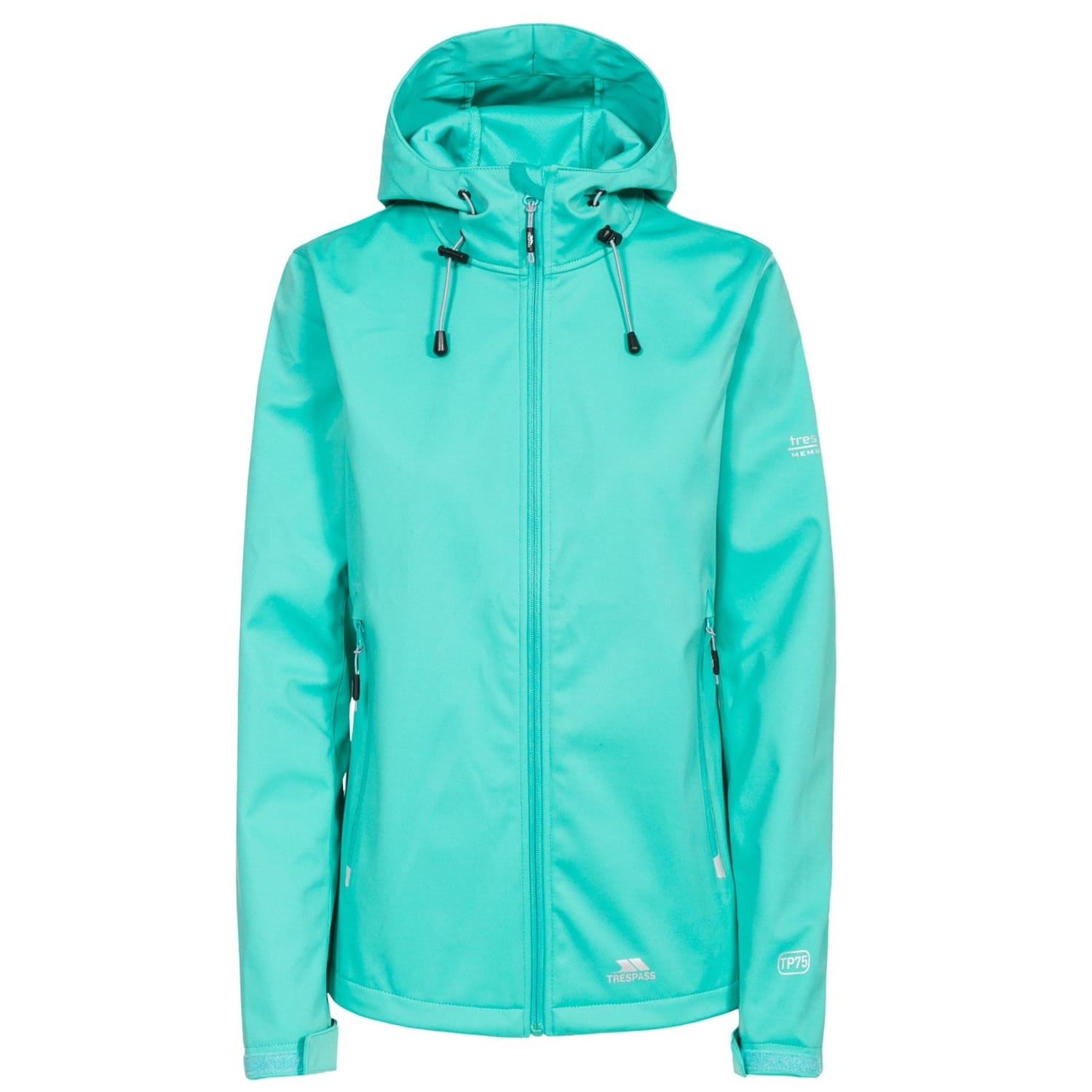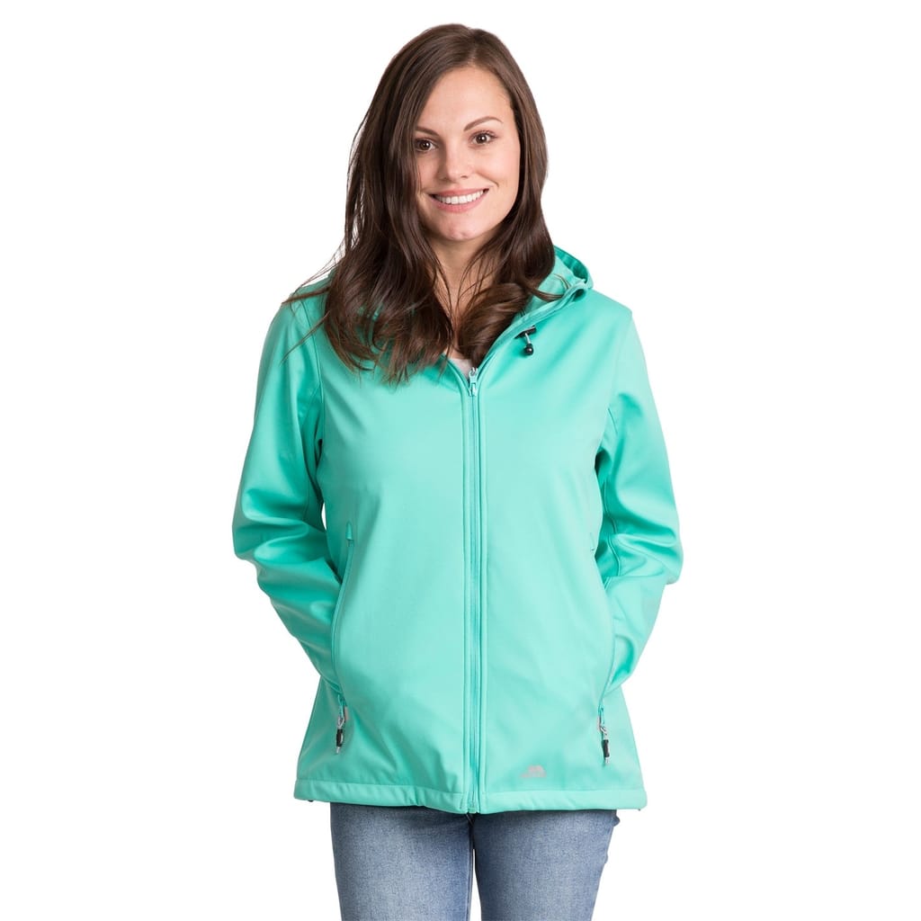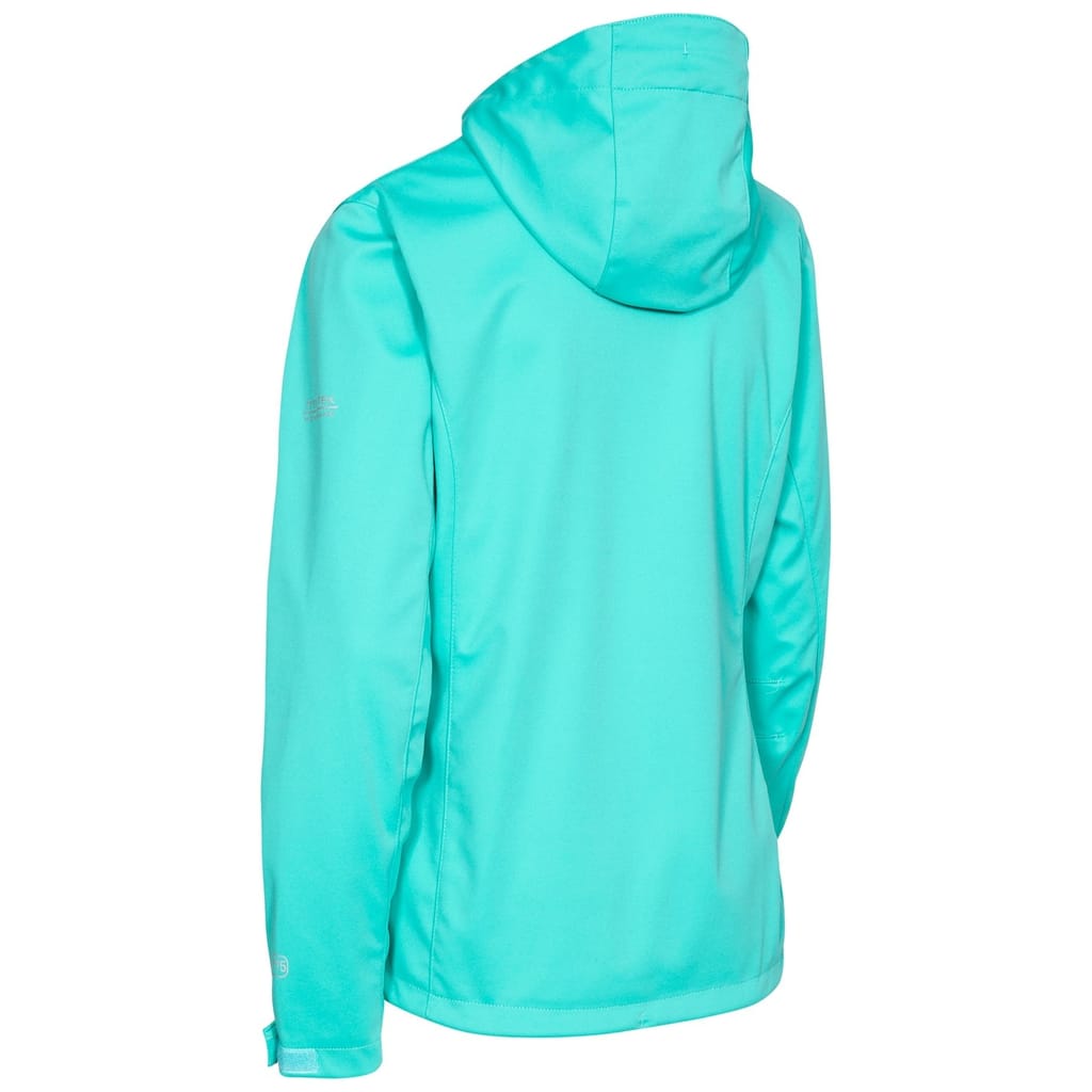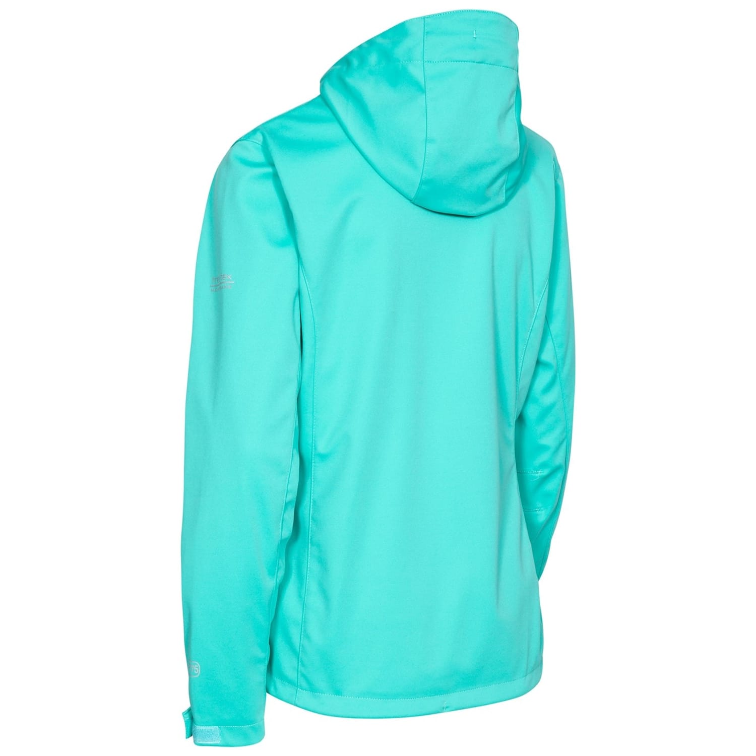 The Trespass softshell jacket features a hooded design with a zipper closure, offering a regular fit. It includes an elasticated cuff and a straight hem for added comfort. The solid pattern is complemented by a subtle logo embellishment, making it a practical choice for outdoor activities. -