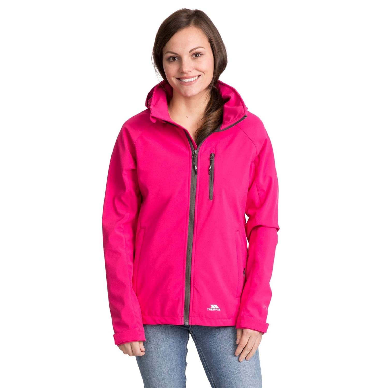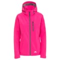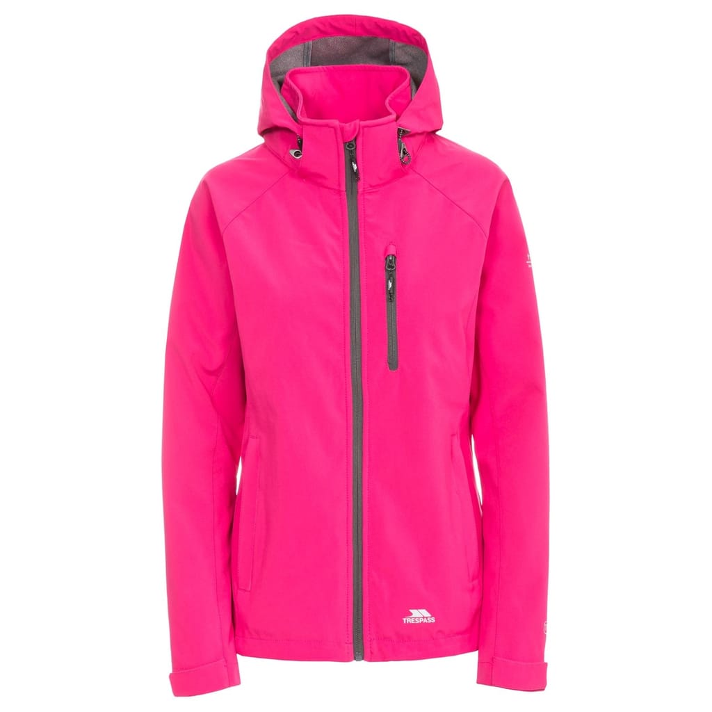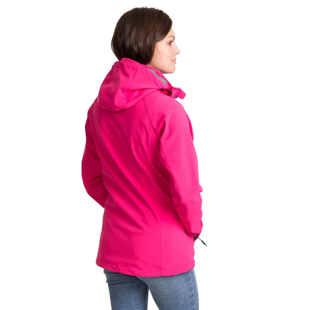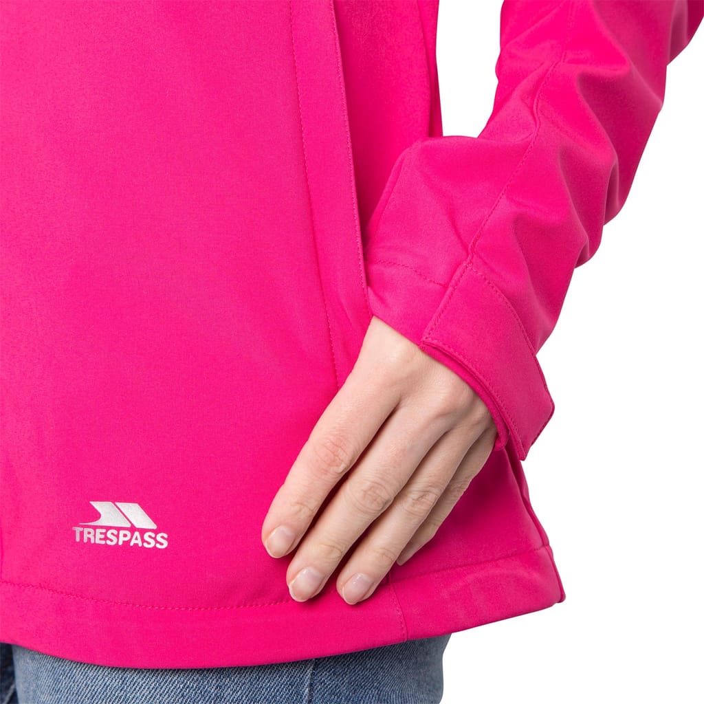 The Trespass softshell jacket features a hooded design with a regular fit, perfect for outdoor activities. It includes a zipper closure and raglan sleeves with elasticated cuffs for added comfort. The solid pattern is complemented by practical zipped pockets and a straight hem. The jacket is adorned with a subtle logo, adding a touch of brand identity. -