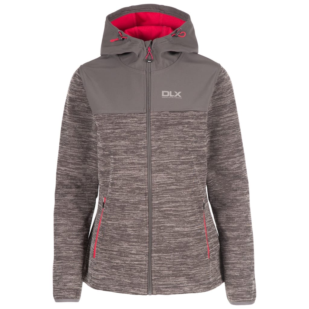The DLX softshell jacket features a heathered pattern and a regular fit, offering both style and comfort. It includes a zipper closure and a straight hem, complemented by ribbed cuffs. The jacket is adorned with a logo and practical pockets, making it a versatile addition to your wardrobe. -