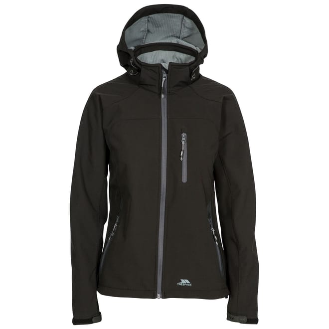 This Trespass softshell jacket features a hooded design with a regular fit, perfect for outdoor activities. The raglan sleeves and ribbed cuffs offer comfort and flexibility, while the solid pattern adds a classic touch. It includes a zipper closure and zipped pockets for practicality. The jacket is embellished with a logo, and the straight hem completes the look. -