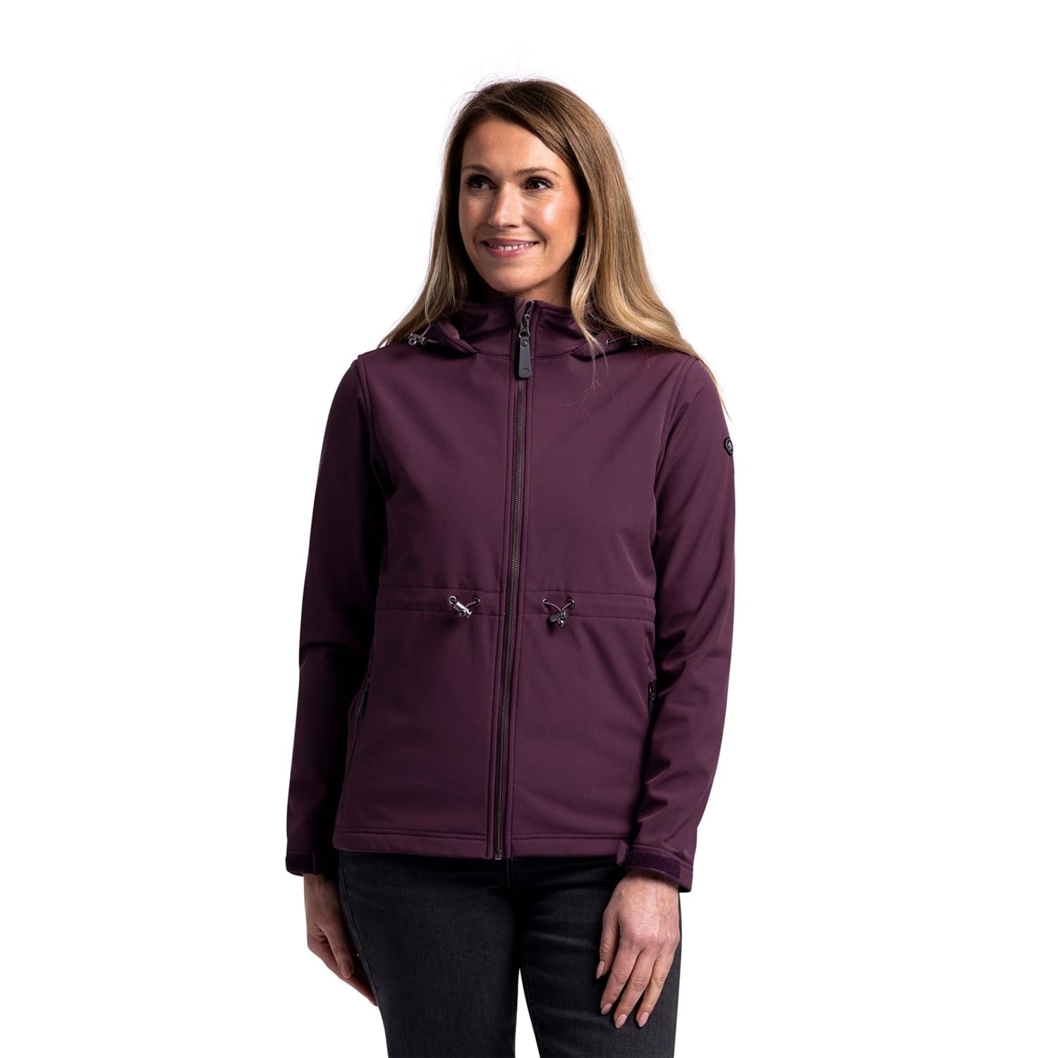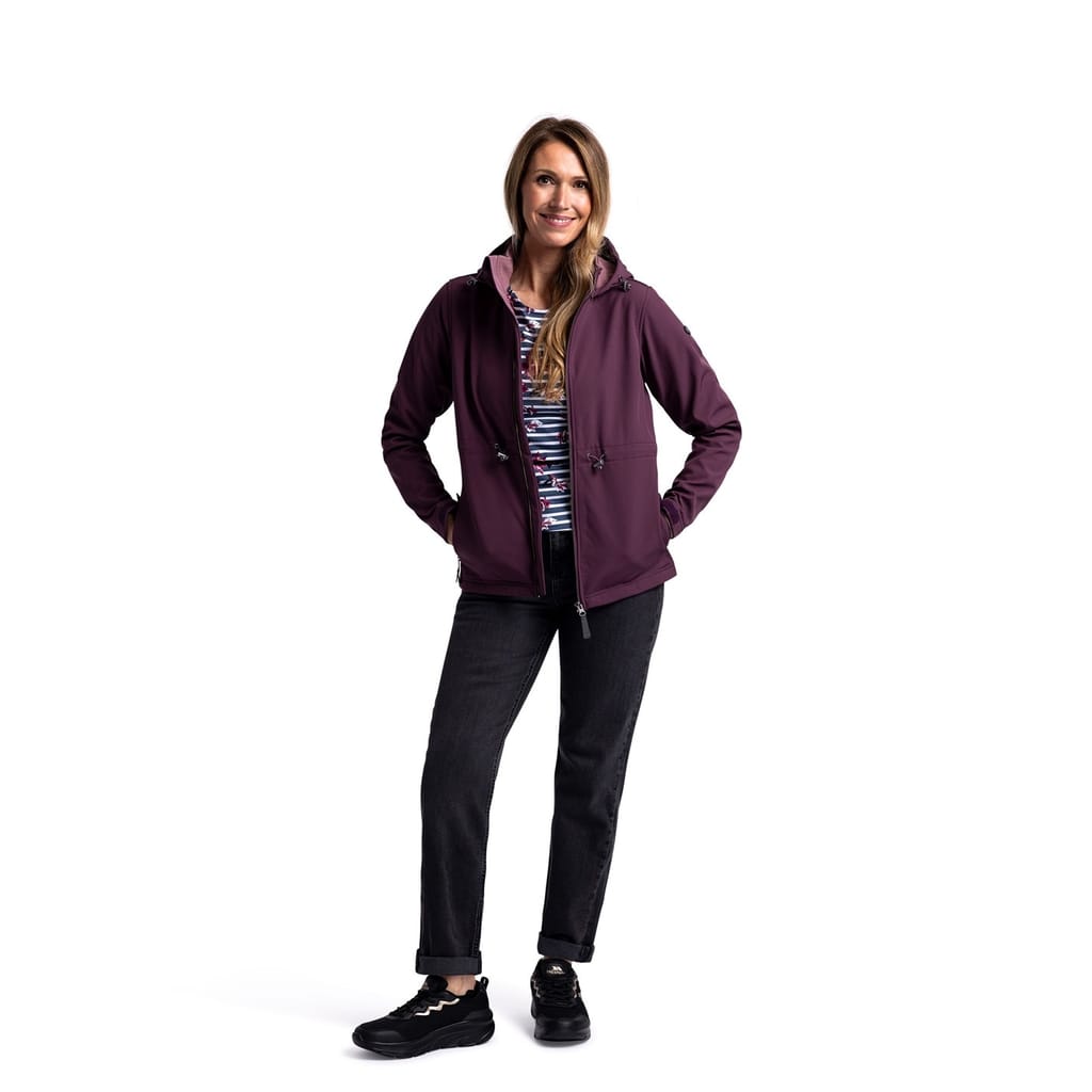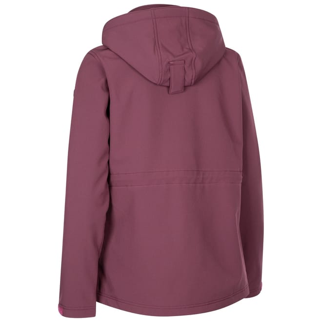 The Trespass softshell jacket features a hooded design with a zipper closure, offering a regular fit. Its solid pattern and straight hem provide a clean look, while the logo embellishment adds a touch of brand identity. -