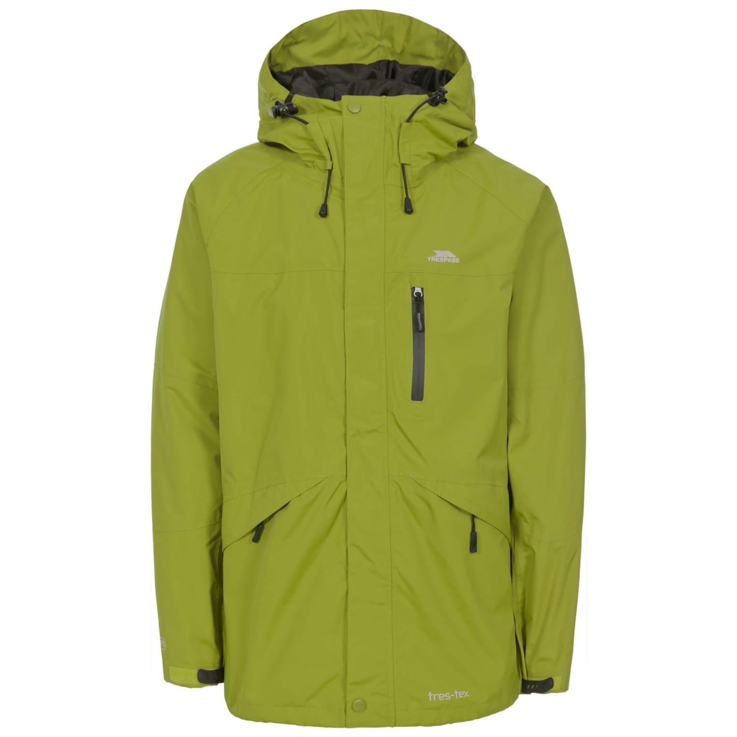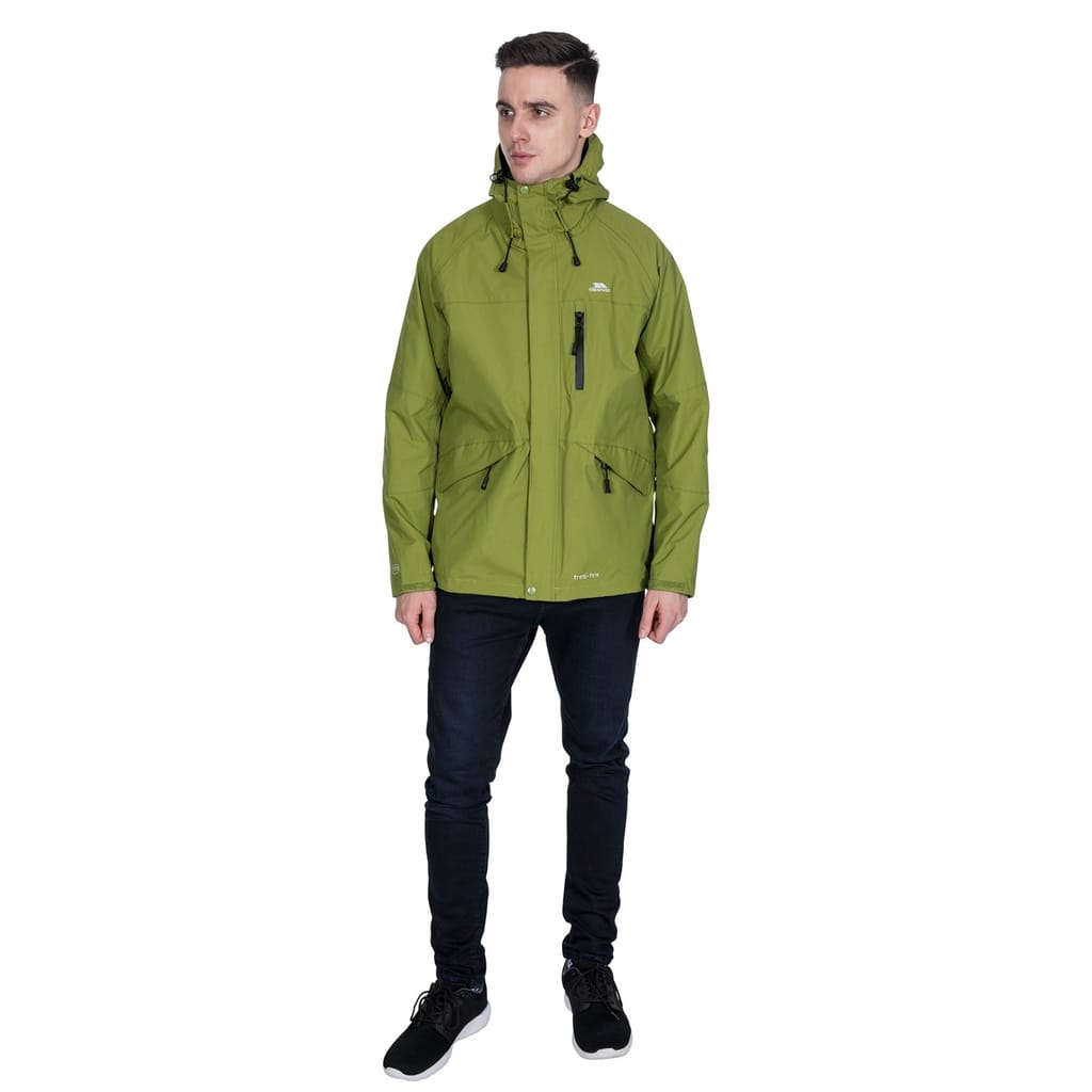 Trespass hooded jacket features a water-repellent design, perfect for rainy days. It has a regular fit with a straight hem and elasticated cuffs. The jacket includes a zipper closure and practical zipped pockets. The solid pattern is complemented by a subtle logo embellishment, offering both style and functionality. -