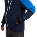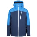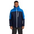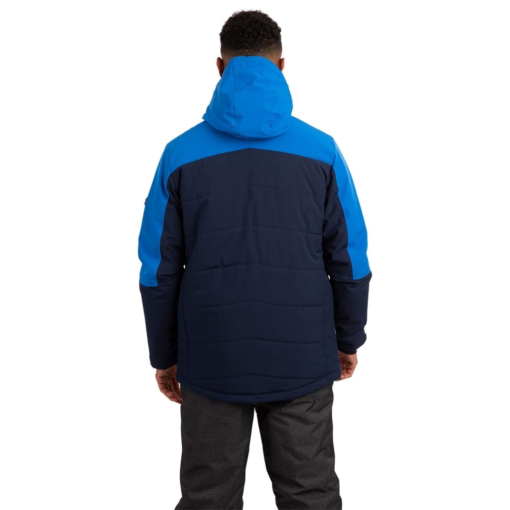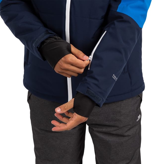 Trespass ski jacket features a hooded design with a regular fit, perfect for winter sports. The jacket showcases a colour block pattern and includes a zipper and snap closure for secure fastening. It is equipped with practical pockets, including zipped options, and a straight hem. The ribbed cuffs add comfort, while the logo embellishment adds a touch of brand identity. -